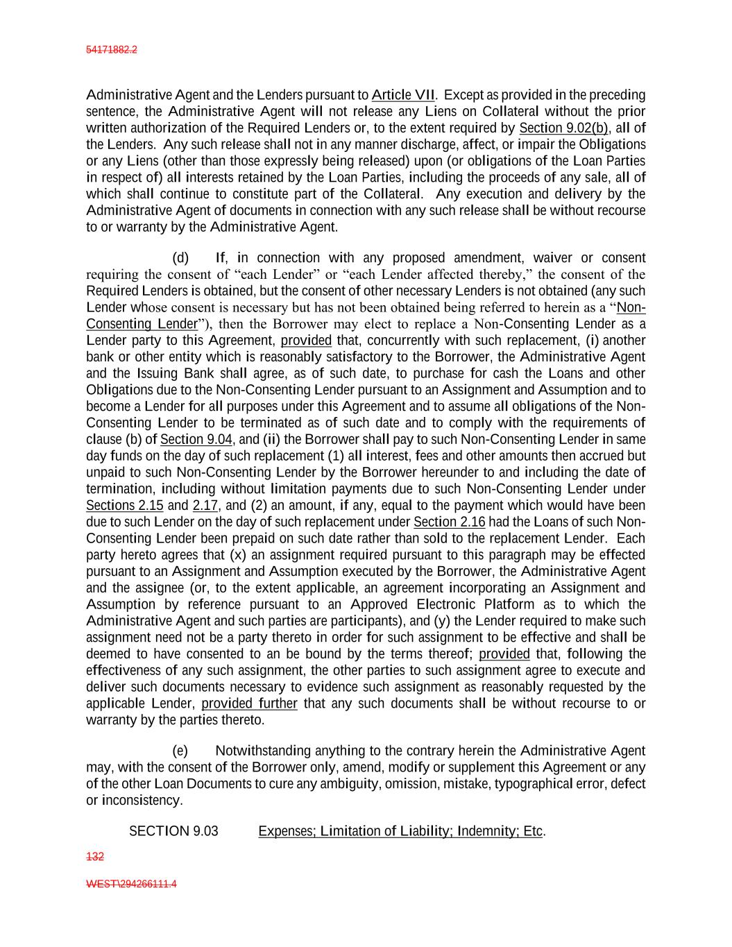 54171882.2 132 WEST\294266111.4 Administrative Agent and the Lenders pursuant to Article VII. Except as provided in the preceding sentence, the Administrative Agent will not release any Liens on Collateral without the prior written authorization of the Required Lenders or, to the extent required by Section 9.02(b), all of the Lenders. Any such release shall not in any manner discharge, affect, or impair the Obligations or any Liens (other than those expressly being released) upon (or obligations of the Loan Parties in respect of) all interests retained by the Loan Parties, including the proceeds of any sale, all of which shall continue to constitute part of the Collateral. Any execution and delivery by the Administrative Agent of documents in connection with any such release shall be without recourse to or warranty by the Administrative Agent. (d) If, in connection with any proposed amendment, waiver or consent requiring the consent of “each Lender” or “each Lender affected thereby,” the consent of the Required Lenders is obtained, but the consent of other necessary Lenders is not obtained (any such Lender whose consent is necessary but has not been obtained being referred to herein as a “Non- Consenting Lender”), then the Borrower may elect to replace a Non-Consenting Lender as a Lender party to this Agreement, provided that, concurrently with such replacement, (i) another bank or other entity which is reasonably satisfactory to the Borrower, the Administrative Agent and the Issuing Bank shall agree, as of such date, to purchase for cash the Loans and other Obligations due to the Non-Consenting Lender pursuant to an Assignment and Assumption and to become a Lender for all purposes under this Agreement and to assume all obligations of the Non- Consenting Lender to be terminated as of such date and to comply with the requirements of clause (b) of Section 9.04, and (ii) the Borrower shall pay to such Non-Consenting Lender in same day funds on the day of such replacement (1) all interest, fees and other amounts then accrued but unpaid to such Non-Consenting Lender by the Borrower hereunder to and including the date of termination, including without limitation payments due to such Non-Consenting Lender under Sections 2.15 and 2.17, and (2) an amount, if any, equal to the payment which would have been due to such Lender on the day of such replacement under Section 2.16 had the Loans of such Non- Consenting Lender been prepaid on such date rather than sold to the replacement Lender. Each party hereto agrees that (x) an assignment required pursuant to this paragraph may be effected pursuant to an Assignment and Assumption executed by the Borrower, the Administrative Agent and the assignee (or, to the extent applicable, an agreement incorporating an Assignment and Assumption by reference pursuant to an Approved Electronic Platform as to which the Administrative Agent and such parties are participants), and (y) the Lender required to make such assignment need not be a party thereto in order for such assignment to be effective and shall be deemed to have consented to an be bound by the terms thereof; provided that, following the effectiveness of any such assignment, the other parties to such assignment agree to execute and deliver such documents necessary to evidence such assignment as reasonably requested by the applicable Lender, provided further that any such documents shall be without recourse to or warranty by the parties thereto. (e) Notwithstanding anything to the contrary herein the Administrative Agent may, with the consent of the Borrower only, amend, modify or supplement this Agreement or any of the other Loan Documents to cure any ambiguity, omission, mistake, typographical error, defect or inconsistency. SECTION 9.03 Expenses; Limitation of Liability; Indemnity; Etc.