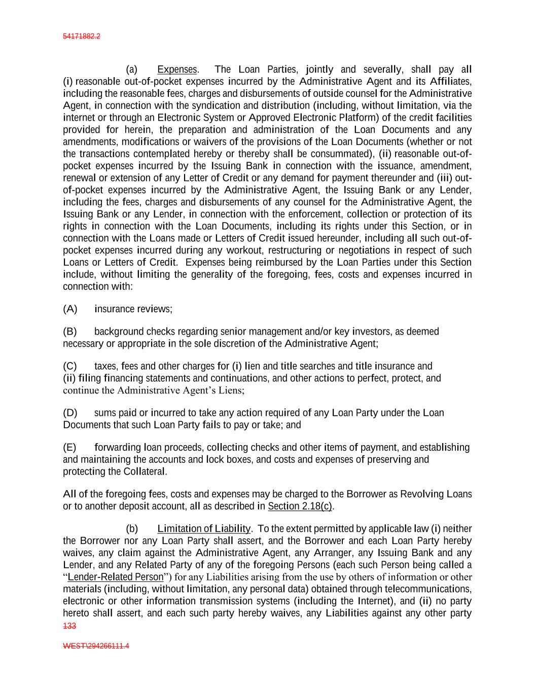54171882.2 133 WEST\294266111.4 (a) Expenses. The Loan Parties, jointly and severally, shall pay all (i) reasonable out-of-pocket expenses incurred by the Administrative Agent and its Affiliates, including the reasonable fees, charges and disbursements of outside counsel for the Administrative Agent, in connection with the syndication and distribution (including, without limitation, via the internet or through an Electronic System or Approved Electronic Platform) of the credit facilities provided for herein, the preparation and administration of the Loan Documents and any amendments, modifications or waivers of the provisions of the Loan Documents (whether or not the transactions contemplated hereby or thereby shall be consummated), (ii) reasonable out-of- pocket expenses incurred by the Issuing Bank in connection with the issuance, amendment, renewal or extension of any Letter of Credit or any demand for payment thereunder and (iii) out- of-pocket expenses incurred by the Administrative Agent, the Issuing Bank or any Lender, including the fees, charges and disbursements of any counsel for the Administrative Agent, the Issuing Bank or any Lender, in connection with the enforcement, collection or protection of its rights in connection with the Loan Documents, including its rights under this Section, or in connection with the Loans made or Letters of Credit issued hereunder, including all such out-of- pocket expenses incurred during any workout, restructuring or negotiations in respect of such Loans or Letters of Credit. Expenses being reimbursed by the Loan Parties under this Section include, without limiting the generality of the foregoing, fees, costs and expenses incurred in connection with: (A) insurance reviews; (B) background checks regarding senior management and/or key investors, as deemed necessary or appropriate in the sole discretion of the Administrative Agent; (C) taxes, fees and other charges for (i) lien and title searches and title insurance and (ii) filing financing statements and continuations, and other actions to perfect, protect, and continue the Administrative Agent’s Liens; (D) sums paid or incurred to take any action required of any Loan Party under the Loan Documents that such Loan Party fails to pay or take; and (E) forwarding loan proceeds, collecting checks and other items of payment, and establishing and maintaining the accounts and lock boxes, and costs and expenses of preserving and protecting the Collateral. All of the foregoing fees, costs and expenses may be charged to the Borrower as Revolving Loans or to another deposit account, all as described in Section 2.18(c). (b) Limitation of Liability. To the extent permitted by applicable law (i) neither the Borrower nor any Loan Party shall assert, and the Borrower and each Loan Party hereby waives, any claim against the Administrative Agent, any Arranger, any Issuing Bank and any Lender, and any Related Party of any of the foregoing Persons (each such Person being called a “Lender-Related Person”) for any Liabilities arising from the use by others of information or other materials (including, without limitation, any personal data) obtained through telecommunications, electronic or other information transmission systems (including the Internet), and (ii) no party hereto shall assert, and each such party hereby waives, any Liabilities against any other party