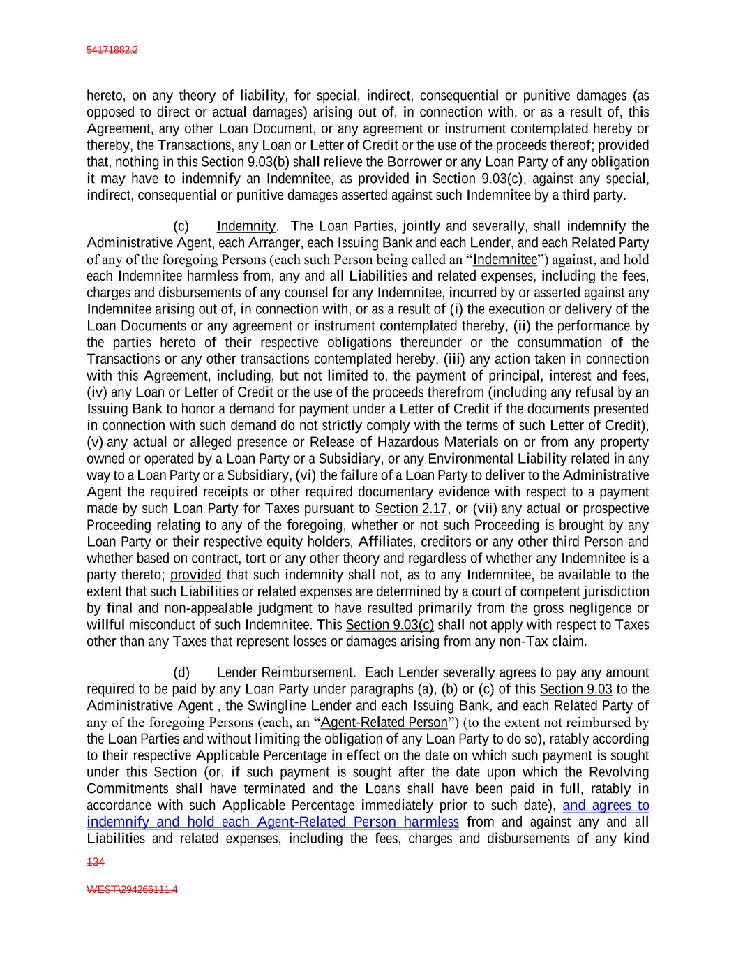 54171882.2 134 WEST\294266111.4 hereto, on any theory of liability, for special, indirect, consequential or punitive damages (as opposed to direct or actual damages) arising out of, in connection with, or as a result of, this Agreement, any other Loan Document, or any agreement or instrument contemplated hereby or thereby, the Transactions, any Loan or Letter of Credit or the use of the proceeds thereof; provided that, nothing in this Section 9.03(b) shall relieve the Borrower or any Loan Party of any obligation it may have to indemnify an Indemnitee, as provided in Section 9.03(c), against any special, indirect, consequential or punitive damages asserted against such Indemnitee by a third party. (c) Indemnity. The Loan Parties, jointly and severally, shall indemnify the Administrative Agent, each Arranger, each Issuing Bank and each Lender, and each Related Party of any of the foregoing Persons (each such Person being called an “Indemnitee”) against, and hold each Indemnitee harmless from, any and all Liabilities and related expenses, including the fees, charges and disbursements of any counsel for any Indemnitee, incurred by or asserted against any Indemnitee arising out of, in connection with, or as a result of (i) the execution or delivery of the Loan Documents or any agreement or instrument contemplated thereby, (ii) the performance by the parties hereto of their respective obligations thereunder or the consummation of the Transactions or any other transactions contemplated hereby, (iii) any action taken in connection with this Agreement, including, but not limited to, the payment of principal, interest and fees, (iv) any Loan or Letter of Credit or the use of the proceeds therefrom (including any refusal by an Issuing Bank to honor a demand for payment under a Letter of Credit if the documents presented in connection with such demand do not strictly comply with the terms of such Letter of Credit), (v) any actual or alleged presence or Release of Hazardous Materials on or from any property owned or operated by a Loan Party or a Subsidiary, or any Environmental Liability related in any way to a Loan Party or a Subsidiary, (vi) the failure of a Loan Party to deliver to the Administrative Agent the required receipts or other required documentary evidence with respect to a payment made by such Loan Party for Taxes pursuant to Section 2.17, or (vii) any actual or prospective Proceeding relating to any of the foregoing, whether or not such Proceeding is brought by any Loan Party or their respective equity holders, Affiliates, creditors or any other third Person and whether based on contract, tort or any other theory and regardless of whether any Indemnitee is a party thereto; provided that such indemnity shall not, as to any Indemnitee, be available to the extent that such Liabilities or related expenses are determined by a court of competent jurisdiction by final and non-appealable judgment to have resulted primarily from the gross negligence or willful misconduct of such Indemnitee. This Section 9.03(c) shall not apply with respect to Taxes other than any Taxes that represent losses or damages arising from any non-Tax claim. (d) Lender Reimbursement. Each Lender severally agrees to pay any amount required to be paid by any Loan Party under paragraphs (a), (b) or (c) of this Section 9.03 to the Administrative Agent , the Swingline Lender and each Issuing Bank, and each Related Party of any of the foregoing Persons (each, an “Agent-Related Person”) (to the extent not reimbursed by the Loan Parties and without limiting the obligation of any Loan Party to do so), ratably according to their respective Applicable Percentage in effect on the date on which such payment is sought under this Section (or, if such payment is sought after the date upon which the Revolving Commitments shall have terminated and the Loans shall have been paid in full, ratably in accordance with such Applicable Percentage immediately prior to such date), and agrees to indemnify and hold each Agent-Related Person harmless from and against any and all Liabilities and related expenses, including the fees, charges and disbursements of any kind