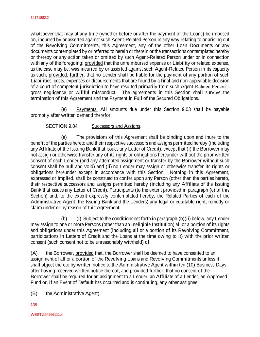 54171882.2 135 WEST\294266111.4 whatsoever that may at any time (whether before or after the payment of the Loans) be imposed on, incurred by or asserted against such Agent-Related Person in any way relating to or arising out of the Revolving Commitments, this Agreement, any of the other Loan Documents or any documents contemplated by or referred to herein or therein or the transactions contemplated hereby or thereby or any action taken or omitted by such Agent-Related Person under or in connection with any of the foregoing; provided that the unreimbursed expense or Liability or related expense, as the case may be, was incurred by or asserted against such Agent-Related Person in its capacity as such; provided, further, that no Lender shall be liable for the payment of any portion of such Liabilities, costs, expenses or disbursements that are found by a final and non-appealable decision of a court of competent jurisdiction to have resulted primarily from such Agent-Related Person’s gross negligence or willful misconduct. The agreements in this Section shall survive the termination of this Agreement and the Payment in Full of the Secured Obligations. (e) Payments. All amounts due under this Section 9.03 shall be payable promptly after written demand therefor. SECTION 9.04 Successors and Assigns. (a) The provisions of this Agreement shall be binding upon and inure to the benefit of the parties hereto and their respective successors and assigns permitted hereby (including any Affiliate of the Issuing Bank that issues any Letter of Credit), except that (i) the Borrower may not assign or otherwise transfer any of its rights or obligations hereunder without the prior written consent of each Lender (and any attempted assignment or transfer by the Borrower without such consent shall be null and void) and (ii) no Lender may assign or otherwise transfer its rights or obligations hereunder except in accordance with this Section. Nothing in this Agreement, expressed or implied, shall be construed to confer upon any Person (other than the parties hereto, their respective successors and assigns permitted hereby (including any Affiliate of the Issuing Bank that issues any Letter of Credit), Participants (to the extent provided in paragraph (c) of this Section) and, to the extent expressly contemplated hereby, the Related Parties of each of the Administrative Agent, the Issuing Bank and the Lenders) any legal or equitable right, remedy or claim under or by reason of this Agreement. (b) (i) Subject to the conditions set forth in paragraph (b)(ii) below, any Lender may assign to one or more Persons (other than an Ineligible Institution) all or a portion of its rights and obligations under this Agreement (including all or a portion of its Revolving Commitment, participations in Letters of Credit and the Loans at the time owing to it) with the prior written consent (such consent not to be unreasonably withheld) of: (A) the Borrower, provided that, the Borrower shall be deemed to have consented to an assignment of all or a portion of the Revolving Loans and Revolving Commitments unless it shall object thereto by written notice to the Administrative Agent within ten (10) Business Days after having received written notice thereof, and provided further, that no consent of the Borrower shall be required for an assignment to a Lender, an Affiliate of a Lender, an Approved Fund or, if an Event of Default has occurred and is continuing, any other assignee; (B) the Administrative Agent;