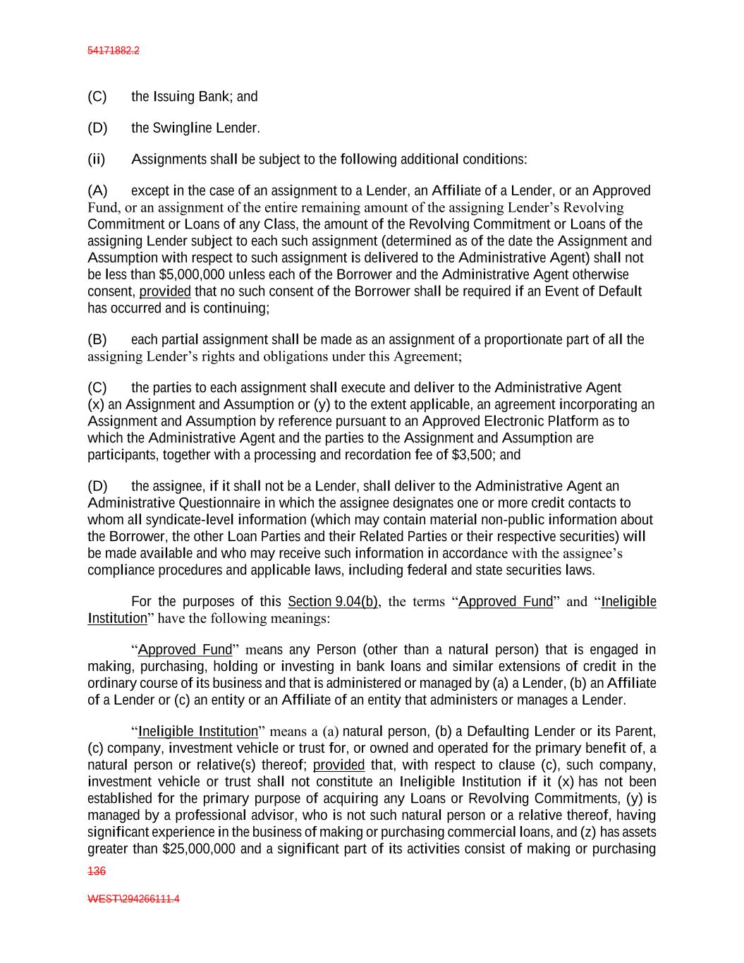 54171882.2 136 WEST\294266111.4 (C) the Issuing Bank; and (D) the Swingline Lender. (ii) Assignments shall be subject to the following additional conditions: (A) except in the case of an assignment to a Lender, an Affiliate of a Lender, or an Approved Fund, or an assignment of the entire remaining amount of the assigning Lender’s Revolving Commitment or Loans of any Class, the amount of the Revolving Commitment or Loans of the assigning Lender subject to each such assignment (determined as of the date the Assignment and Assumption with respect to such assignment is delivered to the Administrative Agent) shall not be less than $5,000,000 unless each of the Borrower and the Administrative Agent otherwise consent, provided that no such consent of the Borrower shall be required if an Event of Default has occurred and is continuing; (B) each partial assignment shall be made as an assignment of a proportionate part of all the assigning Lender’s rights and obligations under this Agreement; (C) the parties to each assignment shall execute and deliver to the Administrative Agent (x) an Assignment and Assumption or (y) to the extent applicable, an agreement incorporating an Assignment and Assumption by reference pursuant to an Approved Electronic Platform as to which the Administrative Agent and the parties to the Assignment and Assumption are participants, together with a processing and recordation fee of $3,500; and (D) the assignee, if it shall not be a Lender, shall deliver to the Administrative Agent an Administrative Questionnaire in which the assignee designates one or more credit contacts to whom all syndicate-level information (which may contain material non-public information about the Borrower, the other Loan Parties and their Related Parties or their respective securities) will be made available and who may receive such information in accordance with the assignee’s compliance procedures and applicable laws, including federal and state securities laws. For the purposes of this Section 9.04(b), the terms “Approved Fund” and “Ineligible Institution” have the following meanings: “Approved Fund” means any Person (other than a natural person) that is engaged in making, purchasing, holding or investing in bank loans and similar extensions of credit in the ordinary course of its business and that is administered or managed by (a) a Lender, (b) an Affiliate of a Lender or (c) an entity or an Affiliate of an entity that administers or manages a Lender. “Ineligible Institution” means a (a) natural person, (b) a Defaulting Lender or its Parent, (c) company, investment vehicle or trust for, or owned and operated for the primary benefit of, a natural person or relative(s) thereof; provided that, with respect to clause (c), such company, investment vehicle or trust shall not constitute an Ineligible Institution if it (x) has not been established for the primary purpose of acquiring any Loans or Revolving Commitments, (y) is managed by a professional advisor, who is not such natural person or a relative thereof, having significant experience in the business of making or purchasing commercial loans, and (z) has assets greater than $25,000,000 and a significant part of its activities consist of making or purchasing
