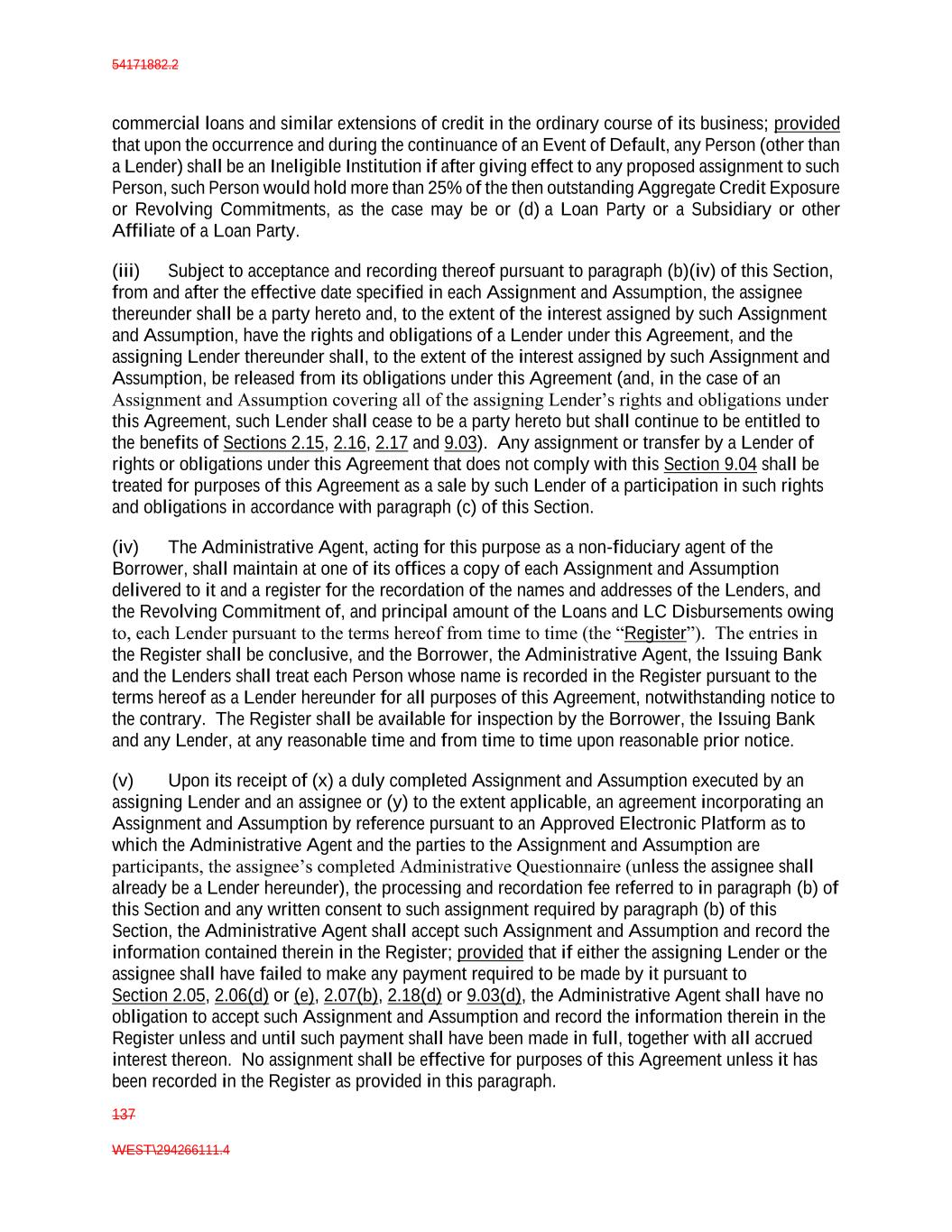 54171882.2 137 WEST\294266111.4 commercial loans and similar extensions of credit in the ordinary course of its business; provided that upon the occurrence and during the continuance of an Event of Default, any Person (other than a Lender) shall be an Ineligible Institution if after giving effect to any proposed assignment to such Person, such Person would hold more than 25% of the then outstanding Aggregate Credit Exposure or Revolving Commitments, as the case may be or (d) a Loan Party or a Subsidiary or other Affiliate of a Loan Party. (iii) Subject to acceptance and recording thereof pursuant to paragraph (b)(iv) of this Section, from and after the effective date specified in each Assignment and Assumption, the assignee thereunder shall be a party hereto and, to the extent of the interest assigned by such Assignment and Assumption, have the rights and obligations of a Lender under this Agreement, and the assigning Lender thereunder shall, to the extent of the interest assigned by such Assignment and Assumption, be released from its obligations under this Agreement (and, in the case of an Assignment and Assumption covering all of the assigning Lender’s rights and obligations under this Agreement, such Lender shall cease to be a party hereto but shall continue to be entitled to the benefits of Sections 2.15, 2.16, 2.17 and 9.03). Any assignment or transfer by a Lender of rights or obligations under this Agreement that does not comply with this Section 9.04 shall be treated for purposes of this Agreement as a sale by such Lender of a participation in such rights and obligations in accordance with paragraph (c) of this Section. (iv) The Administrative Agent, acting for this purpose as a non-fiduciary agent of the Borrower, shall maintain at one of its offices a copy of each Assignment and Assumption delivered to it and a register for the recordation of the names and addresses of the Lenders, and the Revolving Commitment of, and principal amount of the Loans and LC Disbursements owing to, each Lender pursuant to the terms hereof from time to time (the “Register”). The entries in the Register shall be conclusive, and the Borrower, the Administrative Agent, the Issuing Bank and the Lenders shall treat each Person whose name is recorded in the Register pursuant to the terms hereof as a Lender hereunder for all purposes of this Agreement, notwithstanding notice to the contrary. The Register shall be available for inspection by the Borrower, the Issuing Bank and any Lender, at any reasonable time and from time to time upon reasonable prior notice. (v) Upon its receipt of (x) a duly completed Assignment and Assumption executed by an assigning Lender and an assignee or (y) to the extent applicable, an agreement incorporating an Assignment and Assumption by reference pursuant to an Approved Electronic Platform as to which the Administrative Agent and the parties to the Assignment and Assumption are participants, the assignee’s completed Administrative Questionnaire (unless the assignee shall already be a Lender hereunder), the processing and recordation fee referred to in paragraph (b) of this Section and any written consent to such assignment required by paragraph (b) of this Section, the Administrative Agent shall accept such Assignment and Assumption and record the information contained therein in the Register; provided that if either the assigning Lender or the assignee shall have failed to make any payment required to be made by it pursuant to Section 2.05, 2.06(d) or (e), 2.07(b), 2.18(d) or 9.03(d), the Administrative Agent shall have no obligation to accept such Assignment and Assumption and record the information therein in the Register unless and until such payment shall have been made in full, together with all accrued interest thereon. No assignment shall be effective for purposes of this Agreement unless it has been recorded in the Register as provided in this paragraph.