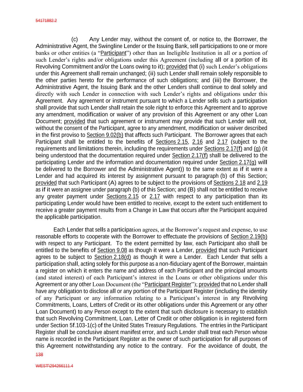 54171882.2 138 WEST\294266111.4 (c) Any Lender may, without the consent of, or notice to, the Borrower, the Administrative Agent, the Swingline Lender or the Issuing Bank, sell participations to one or more banks or other entities (a “Participant”) other than an Ineligible Institution in all or a portion of such Lender’s rights and/or obligations under this Agreement (including all or a portion of its Revolving Commitment and/or the Loans owing to it); provided that (i) such Lender’s obligations under this Agreement shall remain unchanged; (ii) such Lender shall remain solely responsible to the other parties hereto for the performance of such obligations; and (iii) the Borrower, the Administrative Agent, the Issuing Bank and the other Lenders shall continue to deal solely and directly with such Lender in connection with such Lender’s rights and obligations under this Agreement. Any agreement or instrument pursuant to which a Lender sells such a participation shall provide that such Lender shall retain the sole right to enforce this Agreement and to approve any amendment, modification or waiver of any provision of this Agreement or any other Loan Document; provided that such agreement or instrument may provide that such Lender will not, without the consent of the Participant, agree to any amendment, modification or waiver described in the first proviso to Section 9.02(b) that affects such Participant. The Borrower agrees that each Participant shall be entitled to the benefits of Sections 2.15, 2.16 and 2.17 (subject to the requirements and limitations therein, including the requirements under Sections 2.17(f) and (g) (it being understood that the documentation required under Section 2.17(f) shall be delivered to the participating Lender and the information and documentation required under Section 2.17(g) will be delivered to the Borrower and the Administrative Agent)) to the same extent as if it were a Lender and had acquired its interest by assignment pursuant to paragraph (b) of this Section; provided that such Participant (A) agrees to be subject to the provisions of Sections 2.18 and 2.19 as if it were an assignee under paragraph (b) of this Section; and (B) shall not be entitled to receive any greater payment under Sections 2.15 or 2.17 with respect to any participation than its participating Lender would have been entitled to receive, except to the extent such entitlement to receive a greater payment results from a Change in Law that occurs after the Participant acquired the applicable participation. Each Lender that sells a participation agrees, at the Borrower’s request and expense, to use reasonable efforts to cooperate with the Borrower to effectuate the provisions of Section 2.19(b) with respect to any Participant. To the extent permitted by law, each Participant also shall be entitled to the benefits of Section 9.08 as though it were a Lender, provided that such Participant agrees to be subject to Section 2.18(d) as though it were a Lender. Each Lender that sells a participation shall, acting solely for this purpose as a non-fiduciary agent of the Borrower, maintain a register on which it enters the name and address of each Participant and the principal amounts (and stated interest) of each Participant’s interest in the Loans or other obligations under this Agreement or any other Loan Document (the “Participant Register”); provided that no Lender shall have any obligation to disclose all or any portion of the Participant Register (including the identity of any Participant or any information relating to a Participant’s interest in any Revolving Commitments, Loans, Letters of Credit or its other obligations under this Agreement or any other Loan Document) to any Person except to the extent that such disclosure is necessary to establish that such Revolving Commitment, Loan, Letter of Credit or other obligation is in registered form under Section 5f.103-1(c) of the United States Treasury Regulations. The entries in the Participant Register shall be conclusive absent manifest error, and such Lender shall treat each Person whose name is recorded in the Participant Register as the owner of such participation for all purposes of this Agreement notwithstanding any notice to the contrary. For the avoidance of doubt, the
