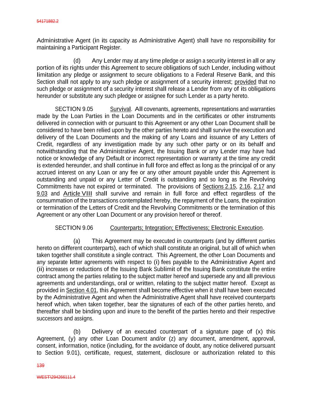 54171882.2 139 WEST\294266111.4 Administrative Agent (in its capacity as Administrative Agent) shall have no responsibility for maintaining a Participant Register. (d) Any Lender may at any time pledge or assign a security interest in all or any portion of its rights under this Agreement to secure obligations of such Lender, including without limitation any pledge or assignment to secure obligations to a Federal Reserve Bank, and this Section shall not apply to any such pledge or assignment of a security interest; provided that no such pledge or assignment of a security interest shall release a Lender from any of its obligations hereunder or substitute any such pledgee or assignee for such Lender as a party hereto. SECTION 9.05 Survival. All covenants, agreements, representations and warranties made by the Loan Parties in the Loan Documents and in the certificates or other instruments delivered in connection with or pursuant to this Agreement or any other Loan Document shall be considered to have been relied upon by the other parties hereto and shall survive the execution and delivery of the Loan Documents and the making of any Loans and issuance of any Letters of Credit, regardless of any investigation made by any such other party or on its behalf and notwithstanding that the Administrative Agent, the Issuing Bank or any Lender may have had notice or knowledge of any Default or incorrect representation or warranty at the time any credit is extended hereunder, and shall continue in full force and effect as long as the principal of or any accrued interest on any Loan or any fee or any other amount payable under this Agreement is outstanding and unpaid or any Letter of Credit is outstanding and so long as the Revolving Commitments have not expired or terminated. The provisions of Sections 2.15, 2.16, 2.17 and 9.03 and Article VIII shall survive and remain in full force and effect regardless of the consummation of the transactions contemplated hereby, the repayment of the Loans, the expiration or termination of the Letters of Credit and the Revolving Commitments or the termination of this Agreement or any other Loan Document or any provision hereof or thereof. SECTION 9.06 Counterparts; Integration; Effectiveness; Electronic Execution. (a) This Agreement may be executed in counterparts (and by different parties hereto on different counterparts), each of which shall constitute an original, but all of which when taken together shall constitute a single contract. This Agreement, the other Loan Documents and any separate letter agreements with respect to (i) fees payable to the Administrative Agent and (ii) increases or reductions of the Issuing Bank Sublimit of the Issuing Bank constitute the entire contract among the parties relating to the subject matter hereof and supersede any and all previous agreements and understandings, oral or written, relating to the subject matter hereof. Except as provided in Section 4.01, this Agreement shall become effective when it shall have been executed by the Administrative Agent and when the Administrative Agent shall have received counterparts hereof which, when taken together, bear the signatures of each of the other parties hereto, and thereafter shall be binding upon and inure to the benefit of the parties hereto and their respective successors and assigns. (b) Delivery of an executed counterpart of a signature page of (x) this Agreement, (y) any other Loan Document and/or (z) any document, amendment, approval, consent, information, notice (including, for the avoidance of doubt, any notice delivered pursuant to Section 9.01), certificate, request, statement, disclosure or authorization related to this