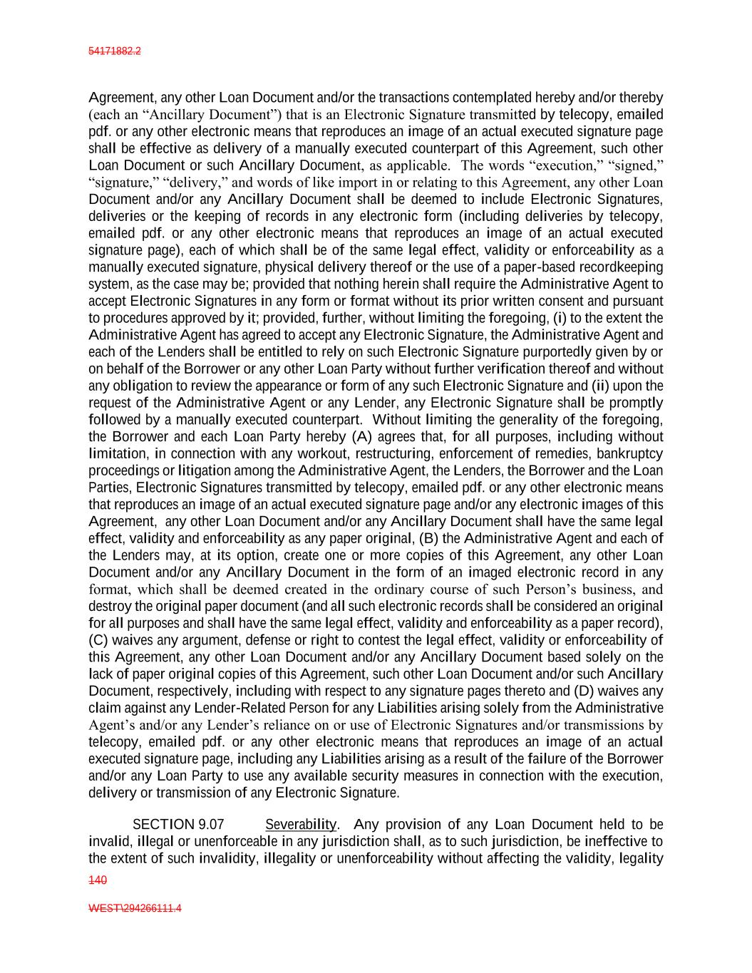 54171882.2 140 WEST\294266111.4 Agreement, any other Loan Document and/or the transactions contemplated hereby and/or thereby (each an “Ancillary Document”) that is an Electronic Signature transmitted by telecopy, emailed pdf. or any other electronic means that reproduces an image of an actual executed signature page shall be effective as delivery of a manually executed counterpart of this Agreement, such other Loan Document or such Ancillary Document, as applicable. The words “execution,” “signed,” “signature,” “delivery,” and words of like import in or relating to this Agreement, any other Loan Document and/or any Ancillary Document shall be deemed to include Electronic Signatures, deliveries or the keeping of records in any electronic form (including deliveries by telecopy, emailed pdf. or any other electronic means that reproduces an image of an actual executed signature page), each of which shall be of the same legal effect, validity or enforceability as a manually executed signature, physical delivery thereof or the use of a paper-based recordkeeping system, as the case may be; provided that nothing herein shall require the Administrative Agent to accept Electronic Signatures in any form or format without its prior written consent and pursuant to procedures approved by it; provided, further, without limiting the foregoing, (i) to the extent the Administrative Agent has agreed to accept any Electronic Signature, the Administrative Agent and each of the Lenders shall be entitled to rely on such Electronic Signature purportedly given by or on behalf of the Borrower or any other Loan Party without further verification thereof and without any obligation to review the appearance or form of any such Electronic Signature and (ii) upon the request of the Administrative Agent or any Lender, any Electronic Signature shall be promptly followed by a manually executed counterpart. Without limiting the generality of the foregoing, the Borrower and each Loan Party hereby (A) agrees that, for all purposes, including without limitation, in connection with any workout, restructuring, enforcement of remedies, bankruptcy proceedings or litigation among the Administrative Agent, the Lenders, the Borrower and the Loan Parties, Electronic Signatures transmitted by telecopy, emailed pdf. or any other electronic means that reproduces an image of an actual executed signature page and/or any electronic images of this Agreement, any other Loan Document and/or any Ancillary Document shall have the same legal effect, validity and enforceability as any paper original, (B) the Administrative Agent and each of the Lenders may, at its option, create one or more copies of this Agreement, any other Loan Document and/or any Ancillary Document in the form of an imaged electronic record in any format, which shall be deemed created in the ordinary course of such Person’s business, and destroy the original paper document (and all such electronic records shall be considered an original for all purposes and shall have the same legal effect, validity and enforceability as a paper record), (C) waives any argument, defense or right to contest the legal effect, validity or enforceability of this Agreement, any other Loan Document and/or any Ancillary Document based solely on the lack of paper original copies of this Agreement, such other Loan Document and/or such Ancillary Document, respectively, including with respect to any signature pages thereto and (D) waives any claim against any Lender-Related Person for any Liabilities arising solely from the Administrative Agent’s and/or any Lender’s reliance on or use of Electronic Signatures and/or transmissions by telecopy, emailed pdf. or any other electronic means that reproduces an image of an actual executed signature page, including any Liabilities arising as a result of the failure of the Borrower and/or any Loan Party to use any available security measures in connection with the execution, delivery or transmission of any Electronic Signature. SECTION 9.07 Severability. Any provision of any Loan Document held to be invalid, illegal or unenforceable in any jurisdiction shall, as to such jurisdiction, be ineffective to the extent of such invalidity, illegality or unenforceability without affecting the validity, legality