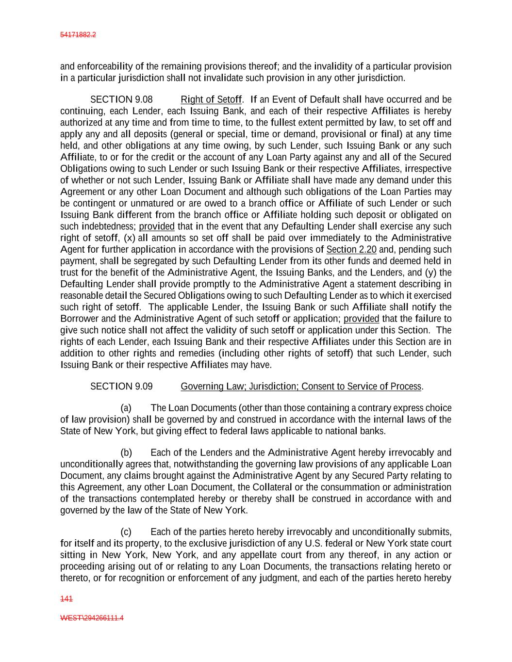 54171882.2 141 WEST\294266111.4 and enforceability of the remaining provisions thereof; and the invalidity of a particular provision in a particular jurisdiction shall not invalidate such provision in any other jurisdiction. SECTION 9.08 Right of Setoff. If an Event of Default shall have occurred and be continuing, each Lender, each Issuing Bank, and each of their respective Affiliates is hereby authorized at any time and from time to time, to the fullest extent permitted by law, to set off and apply any and all deposits (general or special, time or demand, provisional or final) at any time held, and other obligations at any time owing, by such Lender, such Issuing Bank or any such Affiliate, to or for the credit or the account of any Loan Party against any and all of the Secured Obligations owing to such Lender or such Issuing Bank or their respective Affiliates, irrespective of whether or not such Lender, Issuing Bank or Affiliate shall have made any demand under this Agreement or any other Loan Document and although such obligations of the Loan Parties may be contingent or unmatured or are owed to a branch office or Affiliate of such Lender or such Issuing Bank different from the branch office or Affiliate holding such deposit or obligated on such indebtedness; provided that in the event that any Defaulting Lender shall exercise any such right of setoff, (x) all amounts so set off shall be paid over immediately to the Administrative Agent for further application in accordance with the provisions of Section 2.20 and, pending such payment, shall be segregated by such Defaulting Lender from its other funds and deemed held in trust for the benefit of the Administrative Agent, the Issuing Banks, and the Lenders, and (y) the Defaulting Lender shall provide promptly to the Administrative Agent a statement describing in reasonable detail the Secured Obligations owing to such Defaulting Lender as to which it exercised such right of setoff. The applicable Lender, the Issuing Bank or such Affiliate shall notify the Borrower and the Administrative Agent of such setoff or application; provided that the failure to give such notice shall not affect the validity of such setoff or application under this Section. The rights of each Lender, each Issuing Bank and their respective Affiliates under this Section are in addition to other rights and remedies (including other rights of setoff) that such Lender, such Issuing Bank or their respective Affiliates may have. SECTION 9.09 Governing Law; Jurisdiction; Consent to Service of Process. (a) The Loan Documents (other than those containing a contrary express choice of law provision) shall be governed by and construed in accordance with the internal laws of the State of New York, but giving effect to federal laws applicable to national banks. (b) Each of the Lenders and the Administrative Agent hereby irrevocably and unconditionally agrees that, notwithstanding the governing law provisions of any applicable Loan Document, any claims brought against the Administrative Agent by any Secured Party relating to this Agreement, any other Loan Document, the Collateral or the consummation or administration of the transactions contemplated hereby or thereby shall be construed in accordance with and governed by the law of the State of New York. (c) Each of the parties hereto hereby irrevocably and unconditionally submits, for itself and its property, to the exclusive jurisdiction of any U.S. federal or New York state court sitting in New York, New York, and any appellate court from any thereof, in any action or proceeding arising out of or relating to any Loan Documents, the transactions relating hereto or thereto, or for recognition or enforcement of any judgment, and each of the parties hereto hereby