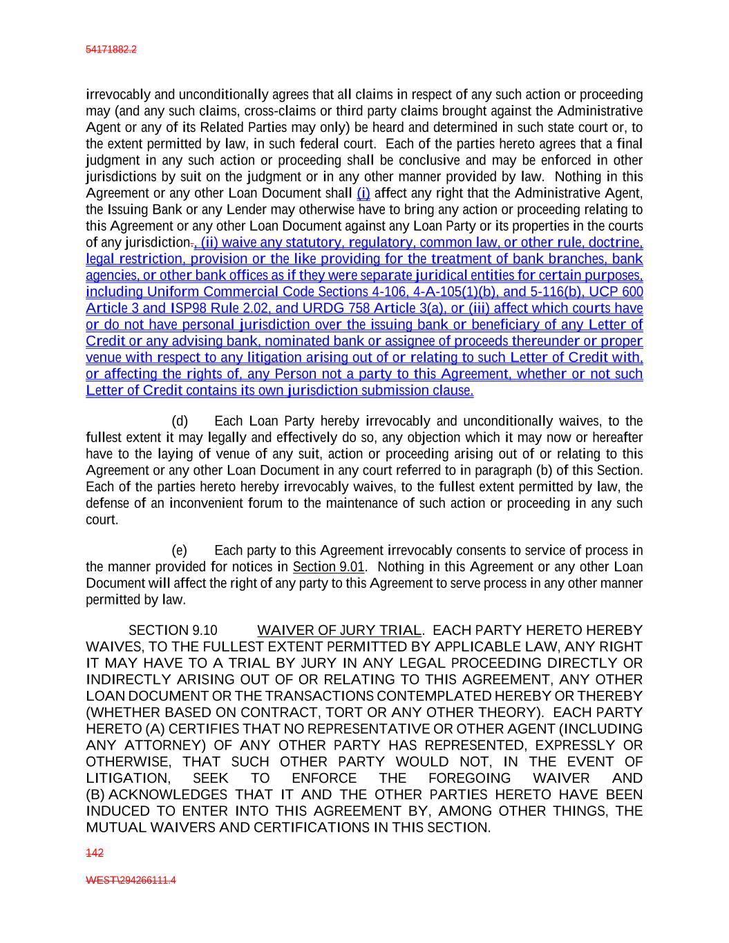 54171882.2 142 WEST\294266111.4 irrevocably and unconditionally agrees that all claims in respect of any such action or proceeding may (and any such claims, cross-claims or third party claims brought against the Administrative Agent or any of its Related Parties may only) be heard and determined in such state court or, to the extent permitted by law, in such federal court. Each of the parties hereto agrees that a final judgment in any such action or proceeding shall be conclusive and may be enforced in other jurisdictions by suit on the judgment or in any other manner provided by law. Nothing in this Agreement or any other Loan Document shall (i) affect any right that the Administrative Agent, the Issuing Bank or any Lender may otherwise have to bring any action or proceeding relating to this Agreement or any other Loan Document against any Loan Party or its properties in the courts of any jurisdiction., (ii) waive any statutory, regulatory, common law, or other rule, doctrine, legal restriction, provision or the like providing for the treatment of bank branches, bank agencies, or other bank offices as if they were separate juridical entities for certain purposes, including Uniform Commercial Code Sections 4-106, 4-A-105(1)(b), and 5-116(b), UCP 600 Article 3 and ISP98 Rule 2.02, and URDG 758 Article 3(a), or (iii) affect which courts have or do not have personal jurisdiction over the issuing bank or beneficiary of any Letter of Credit or any advising bank, nominated bank or assignee of proceeds thereunder or proper venue with respect to any litigation arising out of or relating to such Letter of Credit with, or affecting the rights of, any Person not a party to this Agreement, whether or not such Letter of Credit contains its own jurisdiction submission clause. (d) Each Loan Party hereby irrevocably and unconditionally waives, to the fullest extent it may legally and effectively do so, any objection which it may now or hereafter have to the laying of venue of any suit, action or proceeding arising out of or relating to this Agreement or any other Loan Document in any court referred to in paragraph (b) of this Section. Each of the parties hereto hereby irrevocably waives, to the fullest extent permitted by law, the defense of an inconvenient forum to the maintenance of such action or proceeding in any such court. (e) Each party to this Agreement irrevocably consents to service of process in the manner provided for notices in Section 9.01. Nothing in this Agreement or any other Loan Document will affect the right of any party to this Agreement to serve process in any other manner permitted by law. SECTION 9.10 WAIVER OF JURY TRIAL. EACH PARTY HERETO HEREBY WAIVES, TO THE FULLEST EXTENT PERMITTED BY APPLICABLE LAW, ANY RIGHT IT MAY HAVE TO A TRIAL BY JURY IN ANY LEGAL PROCEEDING DIRECTLY OR INDIRECTLY ARISING OUT OF OR RELATING TO THIS AGREEMENT, ANY OTHER LOAN DOCUMENT OR THE TRANSACTIONS CONTEMPLATED HEREBY OR THEREBY (WHETHER BASED ON CONTRACT, TORT OR ANY OTHER THEORY). EACH PARTY HERETO (A) CERTIFIES THAT NO REPRESENTATIVE OR OTHER AGENT (INCLUDING ANY ATTORNEY) OF ANY OTHER PARTY HAS REPRESENTED, EXPRESSLY OR OTHERWISE, THAT SUCH OTHER PARTY WOULD NOT, IN THE EVENT OF LITIGATION, SEEK TO ENFORCE THE FOREGOING WAIVER AND (B) ACKNOWLEDGES THAT IT AND THE OTHER PARTIES HERETO HAVE BEEN INDUCED TO ENTER INTO THIS AGREEMENT BY, AMONG OTHER THINGS, THE MUTUAL WAIVERS AND CERTIFICATIONS IN THIS SECTION.