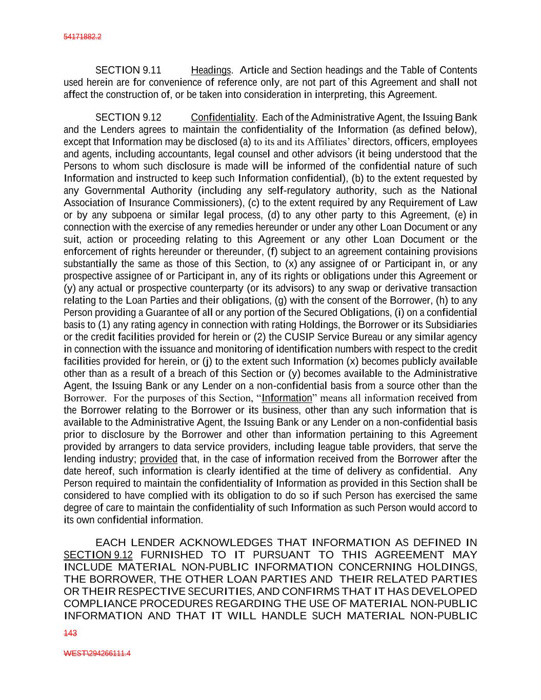 54171882.2 143 WEST\294266111.4 SECTION 9.11 Headings. Article and Section headings and the Table of Contents used herein are for convenience of reference only, are not part of this Agreement and shall not affect the construction of, or be taken into consideration in interpreting, this Agreement. SECTION 9.12 Confidentiality. Each of the Administrative Agent, the Issuing Bank and the Lenders agrees to maintain the confidentiality of the Information (as defined below), except that Information may be disclosed (a) to its and its Affiliates’ directors, officers, employees and agents, including accountants, legal counsel and other advisors (it being understood that the Persons to whom such disclosure is made will be informed of the confidential nature of such Information and instructed to keep such Information confidential), (b) to the extent requested by any Governmental Authority (including any self-regulatory authority, such as the National Association of Insurance Commissioners), (c) to the extent required by any Requirement of Law or by any subpoena or similar legal process, (d) to any other party to this Agreement, (e) in connection with the exercise of any remedies hereunder or under any other Loan Document or any suit, action or proceeding relating to this Agreement or any other Loan Document or the enforcement of rights hereunder or thereunder, (f) subject to an agreement containing provisions substantially the same as those of this Section, to (x) any assignee of or Participant in, or any prospective assignee of or Participant in, any of its rights or obligations under this Agreement or (y) any actual or prospective counterparty (or its advisors) to any swap or derivative transaction relating to the Loan Parties and their obligations, (g) with the consent of the Borrower, (h) to any Person providing a Guarantee of all or any portion of the Secured Obligations, (i) on a confidential basis to (1) any rating agency in connection with rating Holdings, the Borrower or its Subsidiaries or the credit facilities provided for herein or (2) the CUSIP Service Bureau or any similar agency in connection with the issuance and monitoring of identification numbers with respect to the credit facilities provided for herein, or (j) to the extent such Information (x) becomes publicly available other than as a result of a breach of this Section or (y) becomes available to the Administrative Agent, the Issuing Bank or any Lender on a non-confidential basis from a source other than the Borrower. For the purposes of this Section, “Information” means all information received from the Borrower relating to the Borrower or its business, other than any such information that is available to the Administrative Agent, the Issuing Bank or any Lender on a non-confidential basis prior to disclosure by the Borrower and other than information pertaining to this Agreement provided by arrangers to data service providers, including league table providers, that serve the lending industry; provided that, in the case of information received from the Borrower after the date hereof, such information is clearly identified at the time of delivery as confidential. Any Person required to maintain the confidentiality of Information as provided in this Section shall be considered to have complied with its obligation to do so if such Person has exercised the same degree of care to maintain the confidentiality of such Information as such Person would accord to its own confidential information. EACH LENDER ACKNOWLEDGES THAT INFORMATION AS DEFINED IN SECTION 9.12 FURNISHED TO IT PURSUANT TO THIS AGREEMENT MAY INCLUDE MATERIAL NON-PUBLIC INFORMATION CONCERNING HOLDINGS, THE BORROWER, THE OTHER LOAN PARTIES AND THEIR RELATED PARTIES OR THEIR RESPECTIVE SECURITIES, AND CONFIRMS THAT IT HAS DEVELOPED COMPLIANCE PROCEDURES REGARDING THE USE OF MATERIAL NON-PUBLIC INFORMATION AND THAT IT WILL HANDLE SUCH MATERIAL NON-PUBLIC