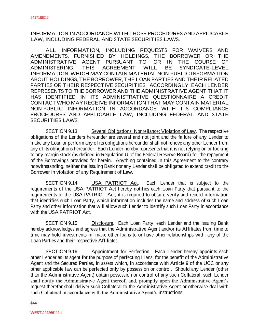 54171882.2 144 WEST\294266111.4 INFORMATION IN ACCORDANCE WITH THOSE PROCEDURES AND APPLICABLE LAW, INCLUDING FEDERAL AND STATE SECURITIES LAWS. ALL INFORMATION, INCLUDING REQUESTS FOR WAIVERS AND AMENDMENTS, FURNISHED BY HOLDINGS, THE BORROWER OR THE ADMINISTRATIVE AGENT PURSUANT TO, OR IN THE COURSE OF ADMINISTERING, THIS AGREEMENT WILL BE SYNDICATE-LEVEL INFORMATION, WHICH MAY CONTAIN MATERIAL NON-PUBLIC INFORMATION ABOUT HOLDINGS, THE BORROWER, THE LOAN PARTIES AND THEIR RELATED PARTIES OR THEIR RESPECTIVE SECURITIES. ACCORDINGLY, EACH LENDER REPRESENTS TO THE BORROWER AND THE ADMINISTRATIVE AGENT THAT IT HAS IDENTIFIED IN ITS ADMINISTRATIVE QUESTIONNAIRE A CREDIT CONTACT WHO MAY RECEIVE INFORMATION THAT MAY CONTAIN MATERIAL NON-PUBLIC INFORMATION IN ACCORDANCE WITH ITS COMPLIANCE PROCEDURES AND APPLICABLE LAW, INCLUDING FEDERAL AND STATE SECURITIES LAWS. SECTION 9.13 Several Obligations; Nonreliance; Violation of Law. The respective obligations of the Lenders hereunder are several and not joint and the failure of any Lender to make any Loan or perform any of its obligations hereunder shall not relieve any other Lender from any of its obligations hereunder. Each Lender hereby represents that it is not relying on or looking to any margin stock (as defined in Regulation U of the Federal Reserve Board) for the repayment of the Borrowings provided for herein. Anything contained in this Agreement to the contrary notwithstanding, neither the Issuing Bank nor any Lender shall be obligated to extend credit to the Borrower in violation of any Requirement of Law. SECTION 9.14 USA PATRIOT Act. Each Lender that is subject to the requirements of the USA PATRIOT Act hereby notifies each Loan Party that pursuant to the requirements of the USA PATRIOT Act, it is required to obtain, verify and record information that identifies such Loan Party, which information includes the name and address of such Loan Party and other information that will allow such Lender to identify such Loan Party in accordance with the USA PATRIOT Act. SECTION 9.15 Disclosure. Each Loan Party, each Lender and the Issuing Bank hereby acknowledges and agrees that the Administrative Agent and/or its Affiliates from time to time may hold investments in, make other loans to or have other relationships with, any of the Loan Parties and their respective Affiliates. SECTION 9.16 Appointment for Perfection. Each Lender hereby appoints each other Lender as its agent for the purpose of perfecting Liens, for the benefit of the Administrative Agent and the Secured Parties, in assets which, in accordance with Article 9 of the UCC or any other applicable law can be perfected only by possession or control. Should any Lender (other than the Administrative Agent) obtain possession or control of any such Collateral, such Lender shall notify the Administrative Agent thereof, and, promptly upon the Administrative Agent’s request therefor shall deliver such Collateral to the Administrative Agent or otherwise deal with such Collateral in accordance with the Administrative Agent’s instructions.