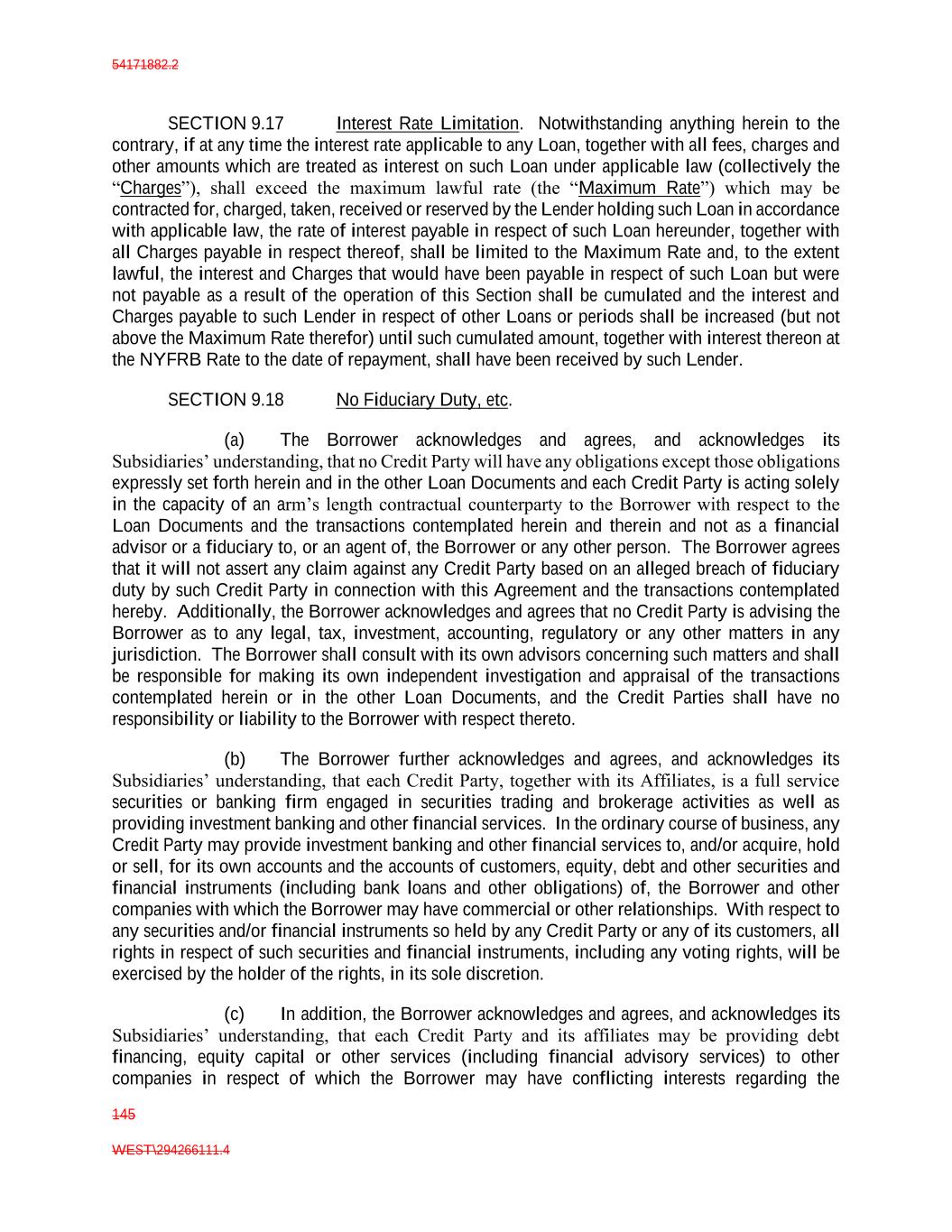54171882.2 145 WEST\294266111.4 SECTION 9.17 Interest Rate Limitation. Notwithstanding anything herein to the contrary, if at any time the interest rate applicable to any Loan, together with all fees, charges and other amounts which are treated as interest on such Loan under applicable law (collectively the “Charges”), shall exceed the maximum lawful rate (the “Maximum Rate”) which may be contracted for, charged, taken, received or reserved by the Lender holding such Loan in accordance with applicable law, the rate of interest payable in respect of such Loan hereunder, together with all Charges payable in respect thereof, shall be limited to the Maximum Rate and, to the extent lawful, the interest and Charges that would have been payable in respect of such Loan but were not payable as a result of the operation of this Section shall be cumulated and the interest and Charges payable to such Lender in respect of other Loans or periods shall be increased (but not above the Maximum Rate therefor) until such cumulated amount, together with interest thereon at the NYFRB Rate to the date of repayment, shall have been received by such Lender. SECTION 9.18 No Fiduciary Duty, etc. (a) The Borrower acknowledges and agrees, and acknowledges its Subsidiaries’ understanding, that no Credit Party will have any obligations except those obligations expressly set forth herein and in the other Loan Documents and each Credit Party is acting solely in the capacity of an arm’s length contractual counterparty to the Borrower with respect to the Loan Documents and the transactions contemplated herein and therein and not as a financial advisor or a fiduciary to, or an agent of, the Borrower or any other person. The Borrower agrees that it will not assert any claim against any Credit Party based on an alleged breach of fiduciary duty by such Credit Party in connection with this Agreement and the transactions contemplated hereby. Additionally, the Borrower acknowledges and agrees that no Credit Party is advising the Borrower as to any legal, tax, investment, accounting, regulatory or any other matters in any jurisdiction. The Borrower shall consult with its own advisors concerning such matters and shall be responsible for making its own independent investigation and appraisal of the transactions contemplated herein or in the other Loan Documents, and the Credit Parties shall have no responsibility or liability to the Borrower with respect thereto. (b) The Borrower further acknowledges and agrees, and acknowledges its Subsidiaries’ understanding, that each Credit Party, together with its Affiliates, is a full service securities or banking firm engaged in securities trading and brokerage activities as well as providing investment banking and other financial services. In the ordinary course of business, any Credit Party may provide investment banking and other financial services to, and/or acquire, hold or sell, for its own accounts and the accounts of customers, equity, debt and other securities and financial instruments (including bank loans and other obligations) of, the Borrower and other companies with which the Borrower may have commercial or other relationships. With respect to any securities and/or financial instruments so held by any Credit Party or any of its customers, all rights in respect of such securities and financial instruments, including any voting rights, will be exercised by the holder of the rights, in its sole discretion. (c) In addition, the Borrower acknowledges and agrees, and acknowledges its Subsidiaries’ understanding, that each Credit Party and its affiliates may be providing debt financing, equity capital or other services (including financial advisory services) to other companies in respect of which the Borrower may have conflicting interests regarding the