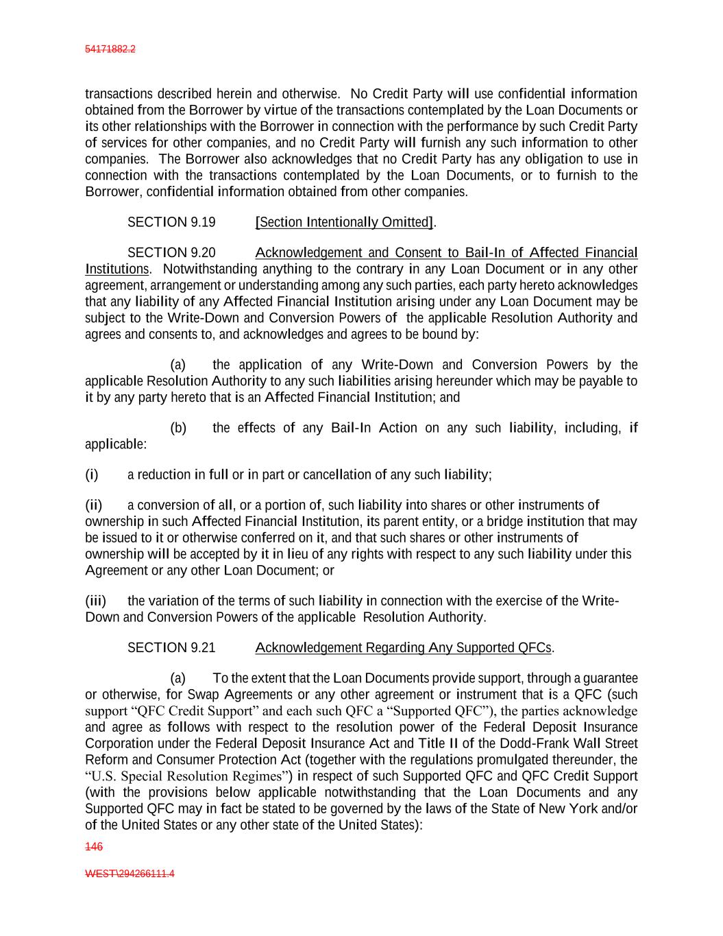 54171882.2 146 WEST\294266111.4 transactions described herein and otherwise. No Credit Party will use confidential information obtained from the Borrower by virtue of the transactions contemplated by the Loan Documents or its other relationships with the Borrower in connection with the performance by such Credit Party of services for other companies, and no Credit Party will furnish any such information to other companies. The Borrower also acknowledges that no Credit Party has any obligation to use in connection with the transactions contemplated by the Loan Documents, or to furnish to the Borrower, confidential information obtained from other companies. SECTION 9.19 [Section Intentionally Omitted]. SECTION 9.20 Acknowledgement and Consent to Bail-In of Affected Financial Institutions. Notwithstanding anything to the contrary in any Loan Document or in any other agreement, arrangement or understanding among any such parties, each party hereto acknowledges that any liability of any Affected Financial Institution arising under any Loan Document may be subject to the Write-Down and Conversion Powers of the applicable Resolution Authority and agrees and consents to, and acknowledges and agrees to be bound by: (a) the application of any Write-Down and Conversion Powers by the applicable Resolution Authority to any such liabilities arising hereunder which may be payable to it by any party hereto that is an Affected Financial Institution; and (b) the effects of any Bail-In Action on any such liability, including, if applicable: (i) a reduction in full or in part or cancellation of any such liability; (ii) a conversion of all, or a portion of, such liability into shares or other instruments of ownership in such Affected Financial Institution, its parent entity, or a bridge institution that may be issued to it or otherwise conferred on it, and that such shares or other instruments of ownership will be accepted by it in lieu of any rights with respect to any such liability under this Agreement or any other Loan Document; or (iii) the variation of the terms of such liability in connection with the exercise of the Write- Down and Conversion Powers of the applicable Resolution Authority. SECTION 9.21 Acknowledgement Regarding Any Supported QFCs. (a) To the extent that the Loan Documents provide support, through a guarantee or otherwise, for Swap Agreements or any other agreement or instrument that is a QFC (such support “QFC Credit Support” and each such QFC a “Supported QFC”), the parties acknowledge and agree as follows with respect to the resolution power of the Federal Deposit Insurance Corporation under the Federal Deposit Insurance Act and Title II of the Dodd-Frank Wall Street Reform and Consumer Protection Act (together with the regulations promulgated thereunder, the “U.S. Special Resolution Regimes”) in respect of such Supported QFC and QFC Credit Support (with the provisions below applicable notwithstanding that the Loan Documents and any Supported QFC may in fact be stated to be governed by the laws of the State of New York and/or of the United States or any other state of the United States):