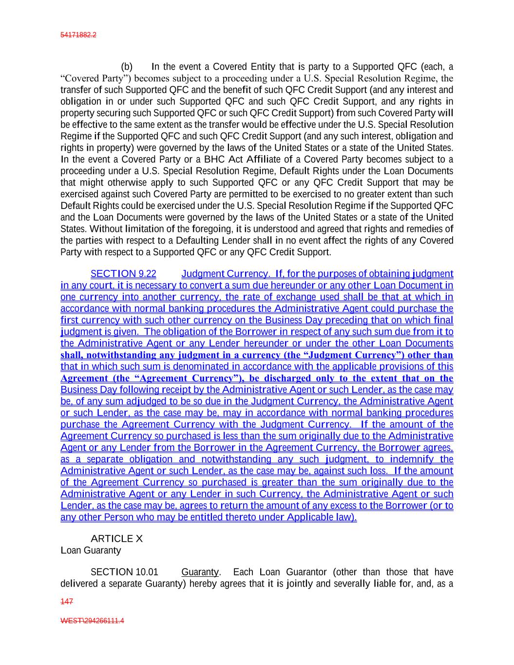54171882.2 147 WEST\294266111.4 (b) In the event a Covered Entity that is party to a Supported QFC (each, a “Covered Party”) becomes subject to a proceeding under a U.S. Special Resolution Regime, the transfer of such Supported QFC and the benefit of such QFC Credit Support (and any interest and obligation in or under such Supported QFC and such QFC Credit Support, and any rights in property securing such Supported QFC or such QFC Credit Support) from such Covered Party will be effective to the same extent as the transfer would be effective under the U.S. Special Resolution Regime if the Supported QFC and such QFC Credit Support (and any such interest, obligation and rights in property) were governed by the laws of the United States or a state of the United States. In the event a Covered Party or a BHC Act Affiliate of a Covered Party becomes subject to a proceeding under a U.S. Special Resolution Regime, Default Rights under the Loan Documents that might otherwise apply to such Supported QFC or any QFC Credit Support that may be exercised against such Covered Party are permitted to be exercised to no greater extent than such Default Rights could be exercised under the U.S. Special Resolution Regime if the Supported QFC and the Loan Documents were governed by the laws of the United States or a state of the United States. Without limitation of the foregoing, it is understood and agreed that rights and remedies of the parties with respect to a Defaulting Lender shall in no event affect the rights of any Covered Party with respect to a Supported QFC or any QFC Credit Support. SECTION 9.22 Judgment Currency. If, for the purposes of obtaining judgment in any court, it is necessary to convert a sum due hereunder or any other Loan Document in one currency into another currency, the rate of exchange used shall be that at which in accordance with normal banking procedures the Administrative Agent could purchase the first currency with such other currency on the Business Day preceding that on which final judgment is given. The obligation of the Borrower in respect of any such sum due from it to the Administrative Agent or any Lender hereunder or under the other Loan Documents shall, notwithstanding any judgment in a currency (the “Judgment Currency”) other than that in which such sum is denominated in accordance with the applicable provisions of this Agreement (the “Agreement Currency”), be discharged only to the extent that on the Business Day following receipt by the Administrative Agent or such Lender, as the case may be, of any sum adjudged to be so due in the Judgment Currency, the Administrative Agent or such Lender, as the case may be, may in accordance with normal banking procedures purchase the Agreement Currency with the Judgment Currency. If the amount of the Agreement Currency so purchased is less than the sum originally due to the Administrative Agent or any Lender from the Borrower in the Agreement Currency, the Borrower agrees, as a separate obligation and notwithstanding any such judgment, to indemnify the Administrative Agent or such Lender, as the case may be, against such loss. If the amount of the Agreement Currency so purchased is greater than the sum originally due to the Administrative Agent or any Lender in such Currency, the Administrative Agent or such Lender, as the case may be, agrees to return the amount of any excess to the Borrower (or to any other Person who may be entitled thereto under Applicable law). ARTICLE X Loan Guaranty SECTION 10.01 Guaranty. Each Loan Guarantor (other than those that have delivered a separate Guaranty) hereby agrees that it is jointly and severally liable for, and, as a