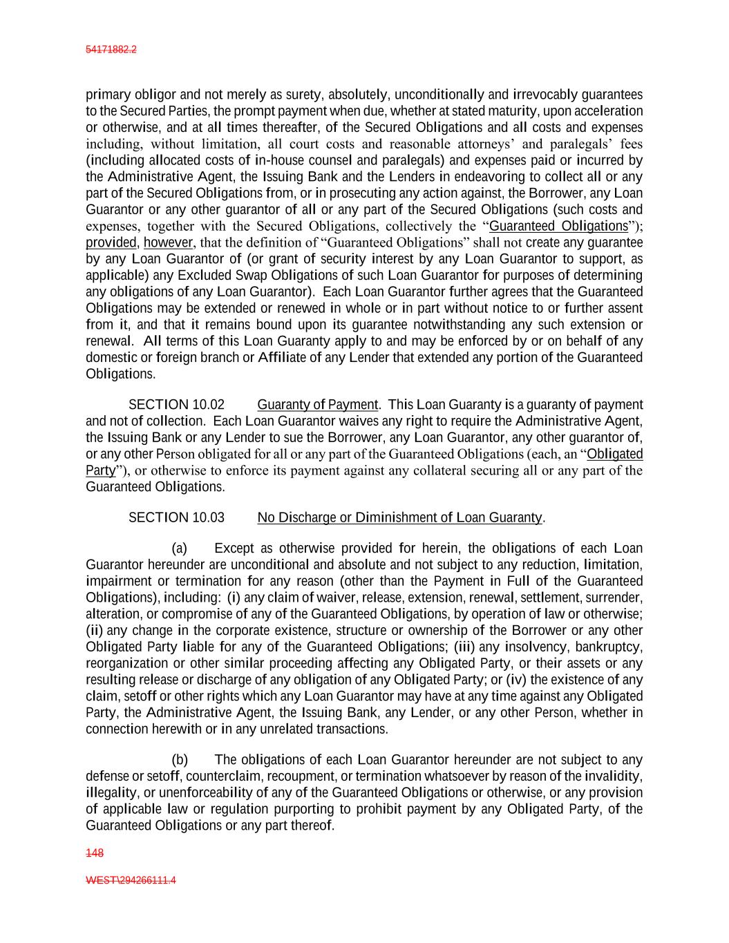 54171882.2 148 WEST\294266111.4 primary obligor and not merely as surety, absolutely, unconditionally and irrevocably guarantees to the Secured Parties, the prompt payment when due, whether at stated maturity, upon acceleration or otherwise, and at all times thereafter, of the Secured Obligations and all costs and expenses including, without limitation, all court costs and reasonable attorneys’ and paralegals’ fees (including allocated costs of in-house counsel and paralegals) and expenses paid or incurred by the Administrative Agent, the Issuing Bank and the Lenders in endeavoring to collect all or any part of the Secured Obligations from, or in prosecuting any action against, the Borrower, any Loan Guarantor or any other guarantor of all or any part of the Secured Obligations (such costs and expenses, together with the Secured Obligations, collectively the “Guaranteed Obligations”); provided, however, that the definition of “Guaranteed Obligations” shall not create any guarantee by any Loan Guarantor of (or grant of security interest by any Loan Guarantor to support, as applicable) any Excluded Swap Obligations of such Loan Guarantor for purposes of determining any obligations of any Loan Guarantor). Each Loan Guarantor further agrees that the Guaranteed Obligations may be extended or renewed in whole or in part without notice to or further assent from it, and that it remains bound upon its guarantee notwithstanding any such extension or renewal. All terms of this Loan Guaranty apply to and may be enforced by or on behalf of any domestic or foreign branch or Affiliate of any Lender that extended any portion of the Guaranteed Obligations. SECTION 10.02 Guaranty of Payment. This Loan Guaranty is a guaranty of payment and not of collection. Each Loan Guarantor waives any right to require the Administrative Agent, the Issuing Bank or any Lender to sue the Borrower, any Loan Guarantor, any other guarantor of, or any other Person obligated for all or any part of the Guaranteed Obligations (each, an “Obligated Party”), or otherwise to enforce its payment against any collateral securing all or any part of the Guaranteed Obligations. SECTION 10.03 No Discharge or Diminishment of Loan Guaranty. (a) Except as otherwise provided for herein, the obligations of each Loan Guarantor hereunder are unconditional and absolute and not subject to any reduction, limitation, impairment or termination for any reason (other than the Payment in Full of the Guaranteed Obligations), including: (i) any claim of waiver, release, extension, renewal, settlement, surrender, alteration, or compromise of any of the Guaranteed Obligations, by operation of law or otherwise; (ii) any change in the corporate existence, structure or ownership of the Borrower or any other Obligated Party liable for any of the Guaranteed Obligations; (iii) any insolvency, bankruptcy, reorganization or other similar proceeding affecting any Obligated Party, or their assets or any resulting release or discharge of any obligation of any Obligated Party; or (iv) the existence of any claim, setoff or other rights which any Loan Guarantor may have at any time against any Obligated Party, the Administrative Agent, the Issuing Bank, any Lender, or any other Person, whether in connection herewith or in any unrelated transactions. (b) The obligations of each Loan Guarantor hereunder are not subject to any defense or setoff, counterclaim, recoupment, or termination whatsoever by reason of the invalidity, illegality, or unenforceability of any of the Guaranteed Obligations or otherwise, or any provision of applicable law or regulation purporting to prohibit payment by any Obligated Party, of the Guaranteed Obligations or any part thereof.