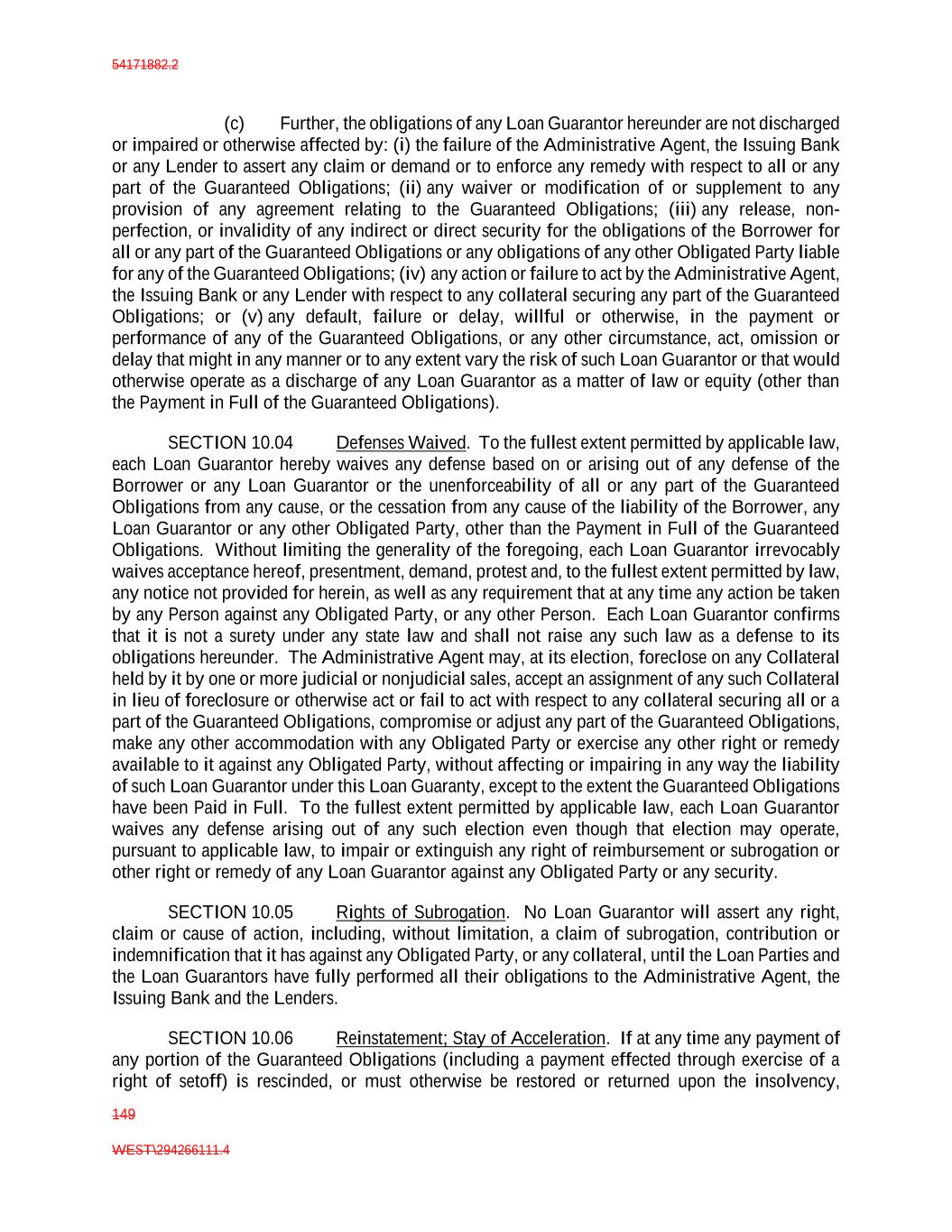 54171882.2 149 WEST\294266111.4 (c) Further, the obligations of any Loan Guarantor hereunder are not discharged or impaired or otherwise affected by: (i) the failure of the Administrative Agent, the Issuing Bank or any Lender to assert any claim or demand or to enforce any remedy with respect to all or any part of the Guaranteed Obligations; (ii) any waiver or modification of or supplement to any provision of any agreement relating to the Guaranteed Obligations; (iii) any release, non- perfection, or invalidity of any indirect or direct security for the obligations of the Borrower for all or any part of the Guaranteed Obligations or any obligations of any other Obligated Party liable for any of the Guaranteed Obligations; (iv) any action or failure to act by the Administrative Agent, the Issuing Bank or any Lender with respect to any collateral securing any part of the Guaranteed Obligations; or (v) any default, failure or delay, willful or otherwise, in the payment or performance of any of the Guaranteed Obligations, or any other circumstance, act, omission or delay that might in any manner or to any extent vary the risk of such Loan Guarantor or that would otherwise operate as a discharge of any Loan Guarantor as a matter of law or equity (other than the Payment in Full of the Guaranteed Obligations). SECTION 10.04 Defenses Waived. To the fullest extent permitted by applicable law, each Loan Guarantor hereby waives any defense based on or arising out of any defense of the Borrower or any Loan Guarantor or the unenforceability of all or any part of the Guaranteed Obligations from any cause, or the cessation from any cause of the liability of the Borrower, any Loan Guarantor or any other Obligated Party, other than the Payment in Full of the Guaranteed Obligations. Without limiting the generality of the foregoing, each Loan Guarantor irrevocably waives acceptance hereof, presentment, demand, protest and, to the fullest extent permitted by law, any notice not provided for herein, as well as any requirement that at any time any action be taken by any Person against any Obligated Party, or any other Person. Each Loan Guarantor confirms that it is not a surety under any state law and shall not raise any such law as a defense to its obligations hereunder. The Administrative Agent may, at its election, foreclose on any Collateral held by it by one or more judicial or nonjudicial sales, accept an assignment of any such Collateral in lieu of foreclosure or otherwise act or fail to act with respect to any collateral securing all or a part of the Guaranteed Obligations, compromise or adjust any part of the Guaranteed Obligations, make any other accommodation with any Obligated Party or exercise any other right or remedy available to it against any Obligated Party, without affecting or impairing in any way the liability of such Loan Guarantor under this Loan Guaranty, except to the extent the Guaranteed Obligations have been Paid in Full. To the fullest extent permitted by applicable law, each Loan Guarantor waives any defense arising out of any such election even though that election may operate, pursuant to applicable law, to impair or extinguish any right of reimbursement or subrogation or other right or remedy of any Loan Guarantor against any Obligated Party or any security. SECTION 10.05 Rights of Subrogation. No Loan Guarantor will assert any right, claim or cause of action, including, without limitation, a claim of subrogation, contribution or indemnification that it has against any Obligated Party, or any collateral, until the Loan Parties and the Loan Guarantors have fully performed all their obligations to the Administrative Agent, the Issuing Bank and the Lenders. SECTION 10.06 Reinstatement; Stay of Acceleration. If at any time any payment of any portion of the Guaranteed Obligations (including a payment effected through exercise of a right of setoff) is rescinded, or must otherwise be restored or returned upon the insolvency,