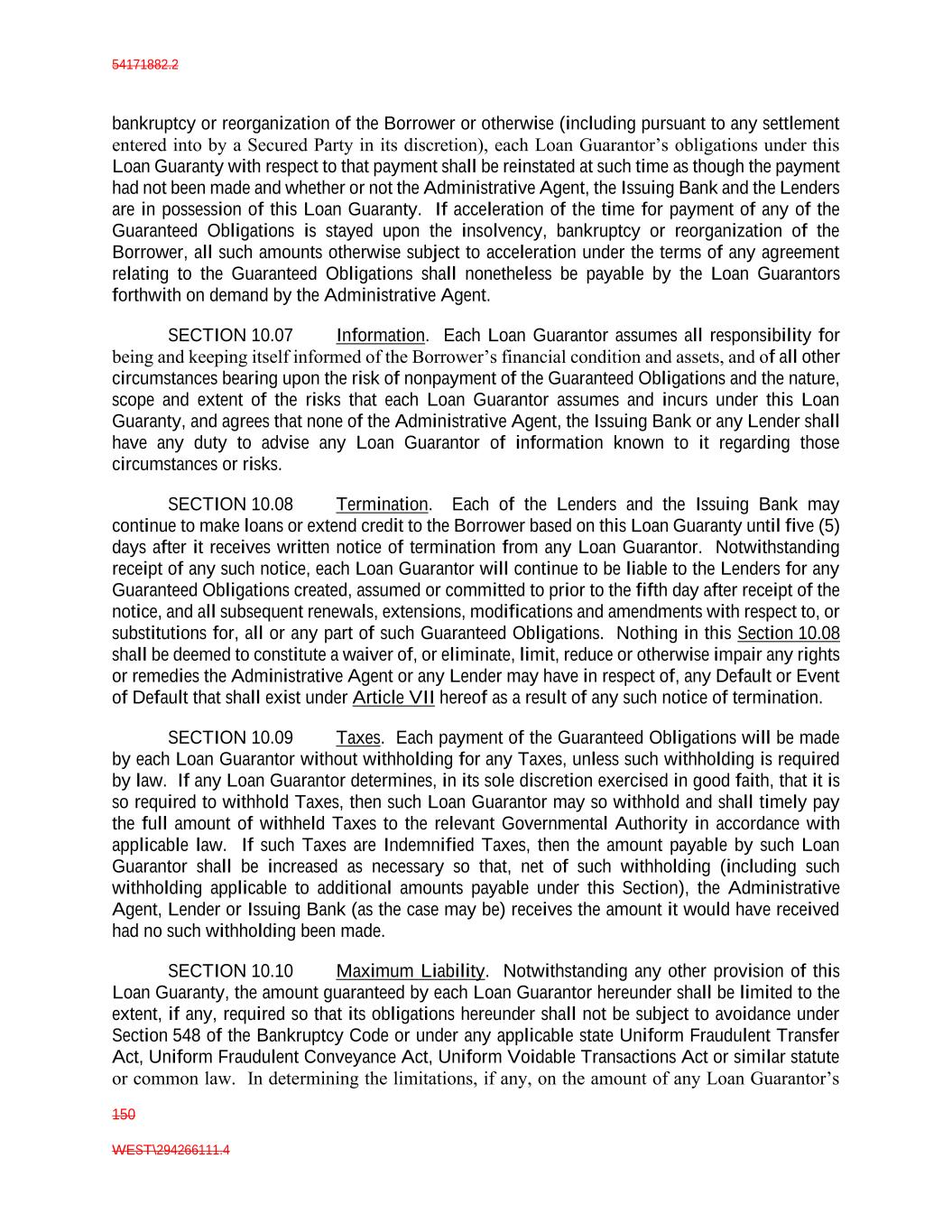 54171882.2 150 WEST\294266111.4 bankruptcy or reorganization of the Borrower or otherwise (including pursuant to any settlement entered into by a Secured Party in its discretion), each Loan Guarantor’s obligations under this Loan Guaranty with respect to that payment shall be reinstated at such time as though the payment had not been made and whether or not the Administrative Agent, the Issuing Bank and the Lenders are in possession of this Loan Guaranty. If acceleration of the time for payment of any of the Guaranteed Obligations is stayed upon the insolvency, bankruptcy or reorganization of the Borrower, all such amounts otherwise subject to acceleration under the terms of any agreement relating to the Guaranteed Obligations shall nonetheless be payable by the Loan Guarantors forthwith on demand by the Administrative Agent. SECTION 10.07 Information. Each Loan Guarantor assumes all responsibility for being and keeping itself informed of the Borrower’s financial condition and assets, and of all other circumstances bearing upon the risk of nonpayment of the Guaranteed Obligations and the nature, scope and extent of the risks that each Loan Guarantor assumes and incurs under this Loan Guaranty, and agrees that none of the Administrative Agent, the Issuing Bank or any Lender shall have any duty to advise any Loan Guarantor of information known to it regarding those circumstances or risks. SECTION 10.08 Termination. Each of the Lenders and the Issuing Bank may continue to make loans or extend credit to the Borrower based on this Loan Guaranty until five (5) days after it receives written notice of termination from any Loan Guarantor. Notwithstanding receipt of any such notice, each Loan Guarantor will continue to be liable to the Lenders for any Guaranteed Obligations created, assumed or committed to prior to the fifth day after receipt of the notice, and all subsequent renewals, extensions, modifications and amendments with respect to, or substitutions for, all or any part of such Guaranteed Obligations. Nothing in this Section 10.08 shall be deemed to constitute a waiver of, or eliminate, limit, reduce or otherwise impair any rights or remedies the Administrative Agent or any Lender may have in respect of, any Default or Event of Default that shall exist under Article VII hereof as a result of any such notice of termination. SECTION 10.09 Taxes. Each payment of the Guaranteed Obligations will be made by each Loan Guarantor without withholding for any Taxes, unless such withholding is required by law. If any Loan Guarantor determines, in its sole discretion exercised in good faith, that it is so required to withhold Taxes, then such Loan Guarantor may so withhold and shall timely pay the full amount of withheld Taxes to the relevant Governmental Authority in accordance with applicable law. If such Taxes are Indemnified Taxes, then the amount payable by such Loan Guarantor shall be increased as necessary so that, net of such withholding (including such withholding applicable to additional amounts payable under this Section), the Administrative Agent, Lender or Issuing Bank (as the case may be) receives the amount it would have received had no such withholding been made. SECTION 10.10 Maximum Liability. Notwithstanding any other provision of this Loan Guaranty, the amount guaranteed by each Loan Guarantor hereunder shall be limited to the extent, if any, required so that its obligations hereunder shall not be subject to avoidance under Section 548 of the Bankruptcy Code or under any applicable state Uniform Fraudulent Transfer Act, Uniform Fraudulent Conveyance Act, Uniform Voidable Transactions Act or similar statute or common law. In determining the limitations, if any, on the amount of any Loan Guarantor’s