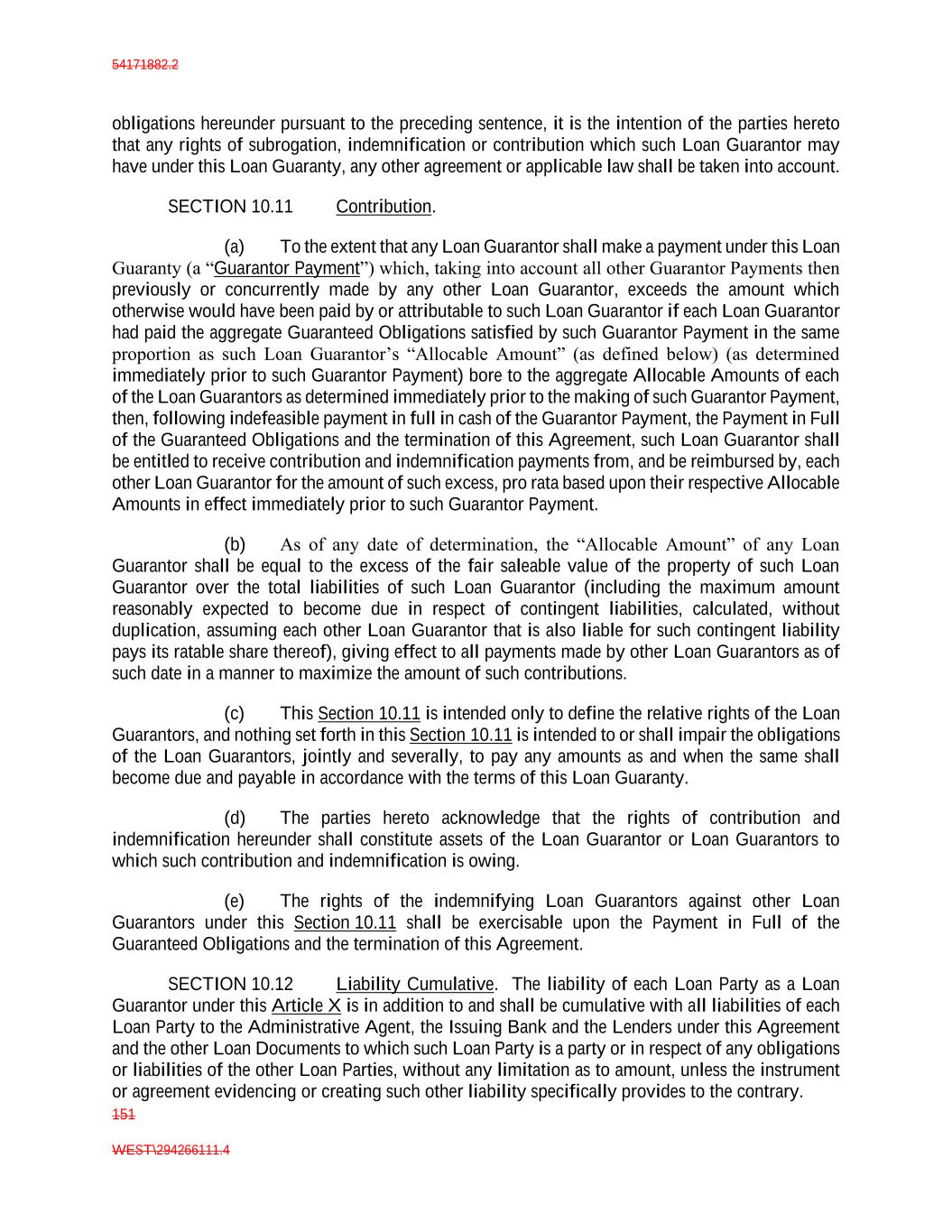 54171882.2 151 WEST\294266111.4 obligations hereunder pursuant to the preceding sentence, it is the intention of the parties hereto that any rights of subrogation, indemnification or contribution which such Loan Guarantor may have under this Loan Guaranty, any other agreement or applicable law shall be taken into account. SECTION 10.11 Contribution. (a) To the extent that any Loan Guarantor shall make a payment under this Loan Guaranty (a “Guarantor Payment”) which, taking into account all other Guarantor Payments then previously or concurrently made by any other Loan Guarantor, exceeds the amount which otherwise would have been paid by or attributable to such Loan Guarantor if each Loan Guarantor had paid the aggregate Guaranteed Obligations satisfied by such Guarantor Payment in the same proportion as such Loan Guarantor’s “Allocable Amount” (as defined below) (as determined immediately prior to such Guarantor Payment) bore to the aggregate Allocable Amounts of each of the Loan Guarantors as determined immediately prior to the making of such Guarantor Payment, then, following indefeasible payment in full in cash of the Guarantor Payment, the Payment in Full of the Guaranteed Obligations and the termination of this Agreement, such Loan Guarantor shall be entitled to receive contribution and indemnification payments from, and be reimbursed by, each other Loan Guarantor for the amount of such excess, pro rata based upon their respective Allocable Amounts in effect immediately prior to such Guarantor Payment. (b) As of any date of determination, the “Allocable Amount” of any Loan Guarantor shall be equal to the excess of the fair saleable value of the property of such Loan Guarantor over the total liabilities of such Loan Guarantor (including the maximum amount reasonably expected to become due in respect of contingent liabilities, calculated, without duplication, assuming each other Loan Guarantor that is also liable for such contingent liability pays its ratable share thereof), giving effect to all payments made by other Loan Guarantors as of such date in a manner to maximize the amount of such contributions. (c) This Section 10.11 is intended only to define the relative rights of the Loan Guarantors, and nothing set forth in this Section 10.11 is intended to or shall impair the obligations of the Loan Guarantors, jointly and severally, to pay any amounts as and when the same shall become due and payable in accordance with the terms of this Loan Guaranty. (d) The parties hereto acknowledge that the rights of contribution and indemnification hereunder shall constitute assets of the Loan Guarantor or Loan Guarantors to which such contribution and indemnification is owing. (e) The rights of the indemnifying Loan Guarantors against other Loan Guarantors under this Section 10.11 shall be exercisable upon the Payment in Full of the Guaranteed Obligations and the termination of this Agreement. SECTION 10.12 Liability Cumulative. The liability of each Loan Party as a Loan Guarantor under this Article X is in addition to and shall be cumulative with all liabilities of each Loan Party to the Administrative Agent, the Issuing Bank and the Lenders under this Agreement and the other Loan Documents to which such Loan Party is a party or in respect of any obligations or liabilities of the other Loan Parties, without any limitation as to amount, unless the instrument or agreement evidencing or creating such other liability specifically provides to the contrary.