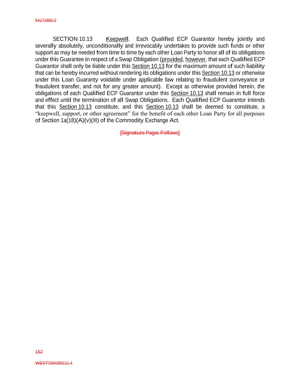 54171882.2 152 WEST\294266111.4 SECTION 10.13 Keepwell. Each Qualified ECP Guarantor hereby jointly and severally absolutely, unconditionally and irrevocably undertakes to provide such funds or other support as may be needed from time to time by each other Loan Party to honor all of its obligations under this Guarantee in respect of a Swap Obligation (provided, however, that each Qualified ECP Guarantor shall only be liable under this Section 10.13 for the maximum amount of such liability that can be hereby incurred without rendering its obligations under this Section 10.13 or otherwise under this Loan Guaranty voidable under applicable law relating to fraudulent conveyance or fraudulent transfer, and not for any greater amount). Except as otherwise provided herein, the obligations of each Qualified ECP Guarantor under this Section 10.13 shall remain in full force and effect until the termination of all Swap Obligations. Each Qualified ECP Guarantor intends that this Section 10.13 constitute, and this Section 10.13 shall be deemed to constitute, a “keepwell, support, or other agreement” for the benefit of each other Loan Party for all purposes of Section 1a(18)(A)(v)(II) of the Commodity Exchange Act. [Signature Pages Follows]