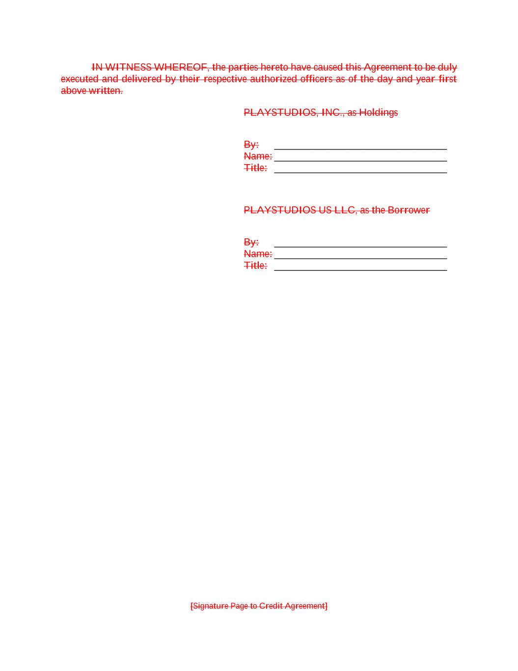 [Signature Page to Credit Agreement] IN WITNESS WHEREOF, the parties hereto have caused this Agreement to be duly executed and delivered by their respective authorized officers as of the day and year first above written. PLAYSTUDIOS, INC., as Holdings By: __________________________________ Name: __________________________________ Title: __________________________________ PLAYSTUDIOS US LLC, as the Borrower By: __________________________________ Name: __________________________________ Title: __________________________________