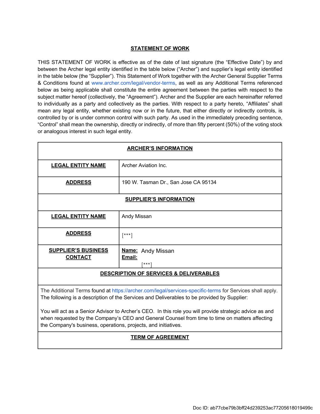 STATEMENT OF WORK THIS STATEMENT OF WORK is effective as of the date of last signature (the “Effective Date”) by and between the Archer legal entity identified in the table below (“Archer”) and supplier’s legal entity identified in the table below (the “Supplier”). This Statement of Work together with the Archer General Supplier Terms & Conditions found at www.archer.com/legal/vendor-terms, as well as any Additional Terms referenced below as being applicable shall constitute the entire agreement between the parties with respect to the subject matter hereof (collectively, the “Agreement”). Archer and the Supplier are each hereinafter referred to individually as a party and collectively as the parties. With respect to a party hereto, “Affiliates” shall mean any legal entity, whether existing now or in the future, that either directly or indirectly controls, is controlled by or is under common control with such party. As used in the immediately preceding sentence, “Control” shall mean the ownership, directly or indirectly, of more than fifty percent (50%) of the voting stock or analogous interest in such legal entity. ARCHER’S INFORMATION LEGAL ENTITY NAME Archer Aviation Inc. ADDRESS 190 W. Tasman Dr., San Jose CA 95134 SUPPLIER’S INFORMATION LEGAL ENTITY NAME Andy Missan ADDRESS SUPPLIER’S BUSINESS CONTACT Name: Email: DESCRIPTION OF SERVICES & DELIVERABLES The Additional Terms found at https://archer.com/legal/services-specific-terms for Services shall apply. The following is a description of the Services and Deliverables to be provided by Supplier: You will act as a Senior Advisor to Archer’s CEO. In this role you will provide strategic advice as and when requested by the Company’s CEO and General Counsel from time to time on matters affecting the Company's business, operations, projects, and initiatives. TERM OF AGREEMENT [***] Andy Missan [***] Doc ID: ab77cbe79b3bff24d239253ac77205618019499c