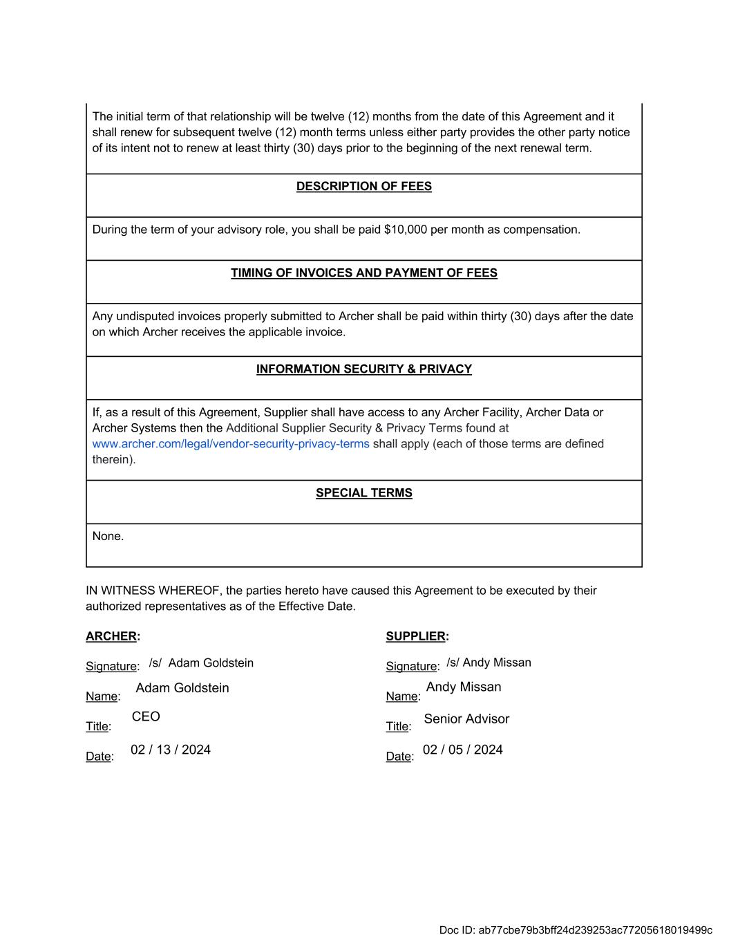 The initial term of that relationship will be twelve (12) months from the date of this Agreement and it shall renew for subsequent twelve (12) month terms unless either party provides the other party notice of its intent not to renew at least thirty (30) days prior to the beginning of the next renewal term. DESCRIPTION OF FEES During the term of your advisory role, you shall be paid $10,000 per month as compensation. TIMING OF INVOICES AND PAYMENT OF FEES Any undisputed invoices properly submitted to Archer shall be paid within thirty (30) days after the date on which Archer receives the applicable invoice. INFORMATION SECURITY & PRIVACY If, as a result of this Agreement, Supplier shall have access to any Archer Facility, Archer Data or Archer Systems then the Additional Supplier Security & Privacy Terms found at www.archer.com/legal/vendor-security-privacy-terms shall apply (each of those terms are defined therein). SPECIAL TERMS None. IN WITNESS WHEREOF, the parties hereto have caused this Agreement to be executed by their authorized representatives as of the Effective Date. ARCHER: SUPPLIER: Signature:[] Signature:] Name: Name: Title: Title: Date: Date: Adam Goldstein CEO 02 / 13 / 2024 Andy Missan Senior Advisor 02 / 05 / 2024 Doc ID: ab77cbe79b3bff24d239253ac77205618019499c /s/ Andy Missan/s/ Adam Goldstein