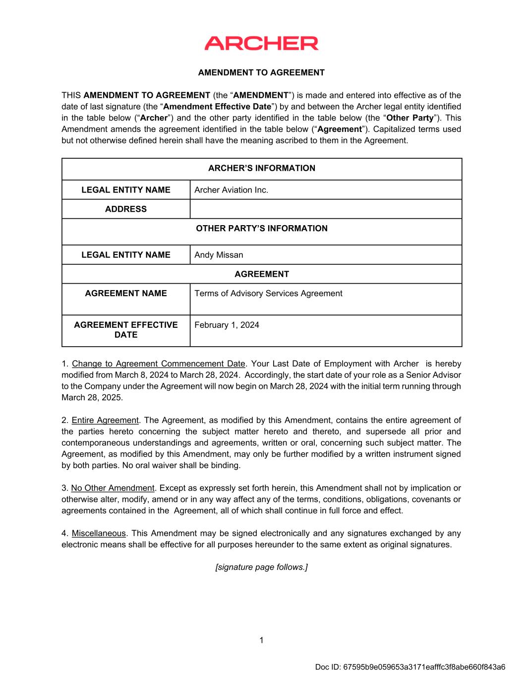 AMENDMENT TO AGREEMENT 1 THIS AMENDMENT TO AGREEMENT (the “AMENDMENT”) is made and entered into effective as of the date of last signature (the “Amendment Effective Date”) by and between the Archer legal entity identified in the table below (“Archer”) and the other party identified in the table below (the “Other Party”). This Amendment amends the agreement identified in the table below (“Agreement”). Capitalized terms used but not otherwise defined herein shall have the meaning ascribed to them in the Agreement. ARCHER’S INFORMATION LEGAL ENTITY NAME Archer Aviation Inc. ADDRESS OTHER PARTY’S INFORMATION LEGAL ENTITY NAME Andy Missan AGREEMENT AGREEMENT NAME Terms of Advisory Services Agreement AGREEMENT EFFECTIVE DATE February 1, 2024 1. Change to Agreement Commencement Date. Your Last Date of Employment with Archer is hereby modified from March 8, 2024 to March 28, 2024. Accordingly, the start date of your role as a Senior Advisor to the Company under the Agreement will now begin on March 28, 2024 with the initial term running through March 28, 2025. 2. Entire Agreement. The Agreement, as modified by this Amendment, contains the entire agreement of the parties hereto concerning the subject matter hereto and thereto, and supersede all prior and contemporaneous understandings and agreements, written or oral, concerning such subject matter. The Agreement, as modified by this Amendment, may only be further modified by a written instrument signed by both parties. No oral waiver shall be binding. 3. No Other Amendment. Except as expressly set forth herein, this Amendment shall not by implication or otherwise alter, modify, amend or in any way affect any of the terms, conditions, obligations, covenants or agreements contained in the Agreement, all of which shall continue in full force and effect. 4. Miscellaneous. This Amendment may be signed electronically and any signatures exchanged by any electronic means shall be effective for all purposes hereunder to the same extent as original signatures. [signature page follows.] Doc ID: 67595b9e059653a3171eafffc3f8abe660f843a6