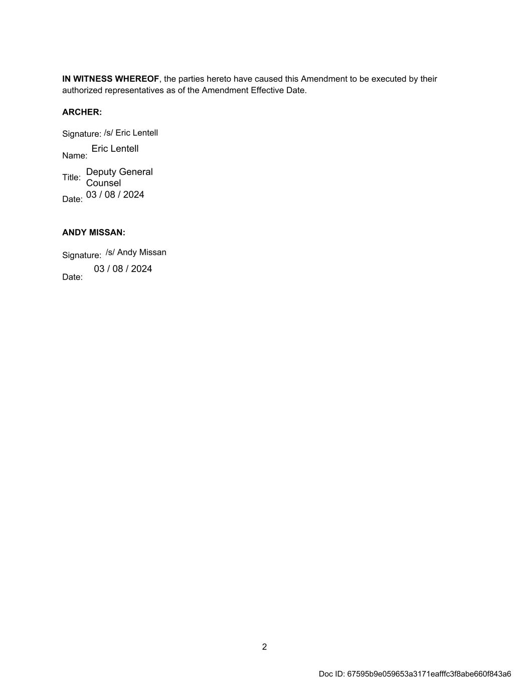 2 IN WITNESS WHEREOF, the parties hereto have caused this Amendment to be executed by their authorized representatives as of the Amendment Effective Date. ARCHER: Signature: Name: Title: Date: ANDY MISSAN: Signature: Date: 03 / 08 / 2024 Eric Lentell Deputy General Counsel 03 / 08 / 2024 Doc ID: 67595b9e059653a3171eafffc3f8abe660f843a6 /s/ Eric Lentell /s/ Andy Missan