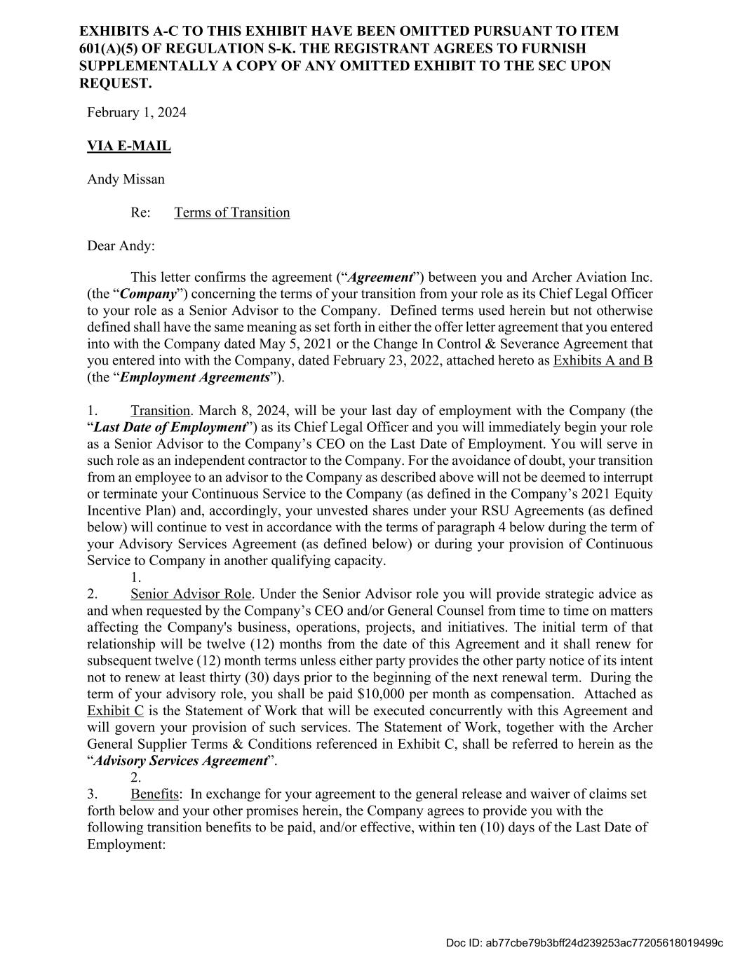 February 1, 2024 VIA E-MAIL Andy Missan Re: Terms of Transition Dear Andy: This letter confirms the agreement (“Agreement”) between you and Archer Aviation Inc. (the “Company”) concerning the terms of your transition from your role as its Chief Legal Officer to your role as a Senior Advisor to the Company. Defined terms used herein but not otherwise defined shall have the same meaning as set forth in either the offer letter agreement that you entered into with the Company dated May 5, 2021 or the Change In Control & Severance Agreement that you entered into with the Company, dated February 23, 2022, attached hereto as Exhibits A and B (the “Employment Agreements”). 1. Transition. March 8, 2024, will be your last day of employment with the Company (the “Last Date of Employment”) as its Chief Legal Officer and you will immediately begin your role as a Senior Advisor to the Company’s CEO on the Last Date of Employment. You will serve in such role as an independent contractor to the Company. For the avoidance of doubt, your transition from an employee to an advisor to the Company as described above will not be deemed to interrupt or terminate your Continuous Service to the Company (as defined in the Company’s 2021 Equity Incentive Plan) and, accordingly, your unvested shares under your RSU Agreements (as defined below) will continue to vest in accordance with the terms of paragraph 4 below during the term of your Advisory Services Agreement (as defined below) or during your provision of Continuous Service to Company in another qualifying capacity. 1. 2. Senior Advisor Role. Under the Senior Advisor role you will provide strategic advice as and when requested by the Company’s CEO and/or General Counsel from time to time on matters affecting the Company's business, operations, projects, and initiatives. The initial term of that relationship will be twelve (12) months from the date of this Agreement and it shall renew for subsequent twelve (12) month terms unless either party provides the other party notice of its intent not to renew at least thirty (30) days prior to the beginning of the next renewal term. During the term of your advisory role, you shall be paid $10,000 per month as compensation. Attached as Exhibit C is the Statement of Work that will be executed concurrently with this Agreement and will govern your provision of such services. The Statement of Work, together with the Archer General Supplier Terms & Conditions referenced in Exhibit C, shall be referred to herein as the “Advisory Services Agreement”. 2. 3. Benefits: In exchange for your agreement to the general release and waiver of claims set forth below and your other promises herein, the Company agrees to provide you with the following transition benefits to be paid, and/or effective, within ten (10) days of the Last Date of Employment: Doc ID: ab77cbe79b3bff24d239253ac77205618019499c EXHIBITS A-C TO THIS EXHIBIT HAVE BEEN OMITTED PURSUANT TO ITEM 601(A)(5) OF REGULATION S-K. THE REGISTRANT AGREES TO FURNISH SUPPLEMENTALLY A COPY OF ANY OMITTED EXHIBIT TO THE SEC UPON REQUEST.