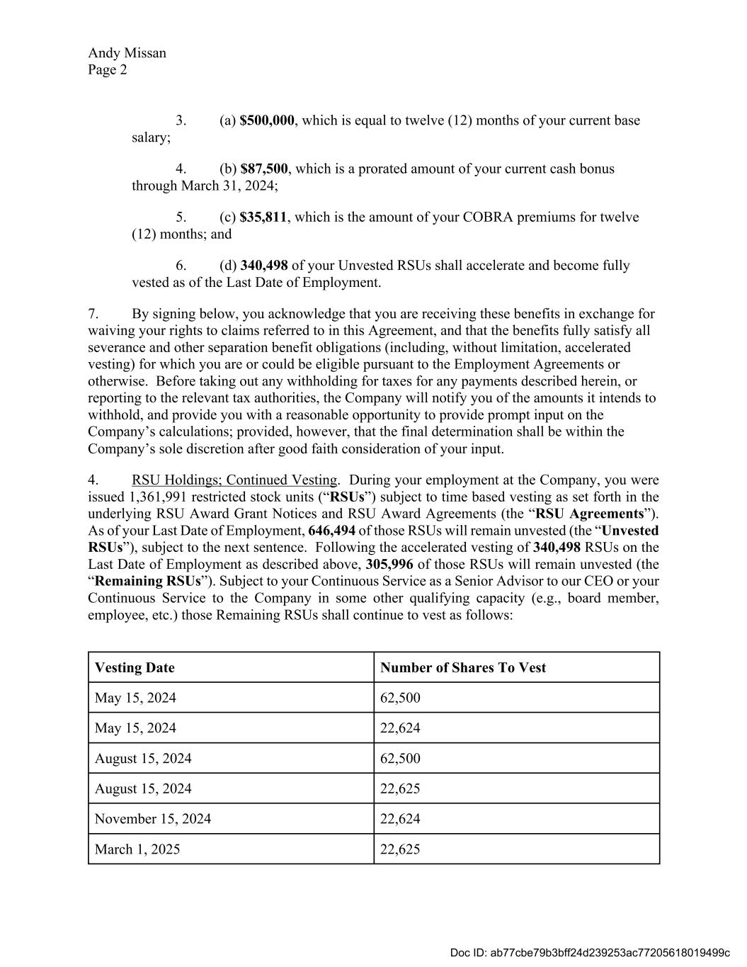 Andy Missan Page 2 3. (a) $500,000, which is equal to twelve (12) months of your current base salary; 4. (b) $87,500, which is a prorated amount of your current cash bonus through March 31, 2024; 5. (c) $35,811, which is the amount of your COBRA premiums for twelve (12) months; and 6. (d) 340,498 of your Unvested RSUs shall accelerate and become fully vested as of the Last Date of Employment. 7. By signing below, you acknowledge that you are receiving these benefits in exchange for waiving your rights to claims referred to in this Agreement, and that the benefits fully satisfy all severance and other separation benefit obligations (including, without limitation, accelerated vesting) for which you are or could be eligible pursuant to the Employment Agreements or otherwise. Before taking out any withholding for taxes for any payments described herein, or reporting to the relevant tax authorities, the Company will notify you of the amounts it intends to withhold, and provide you with a reasonable opportunity to provide prompt input on the Company’s calculations; provided, however, that the final determination shall be within the Company’s sole discretion after good faith consideration of your input. 4. RSU Holdings; Continued Vesting. During your employment at the Company, you were issued 1,361,991 restricted stock units (“RSUs”) subject to time based vesting as set forth in the underlying RSU Award Grant Notices and RSU Award Agreements (the “RSU Agreements”). As of your Last Date of Employment, 646,494 of those RSUs will remain unvested (the “Unvested RSUs”), subject to the next sentence. Following the accelerated vesting of 340,498 RSUs on the Last Date of Employment as described above, 305,996 of those RSUs will remain unvested (the “Remaining RSUs”). Subject to your Continuous Service as a Senior Advisor to our CEO or your Continuous Service to the Company in some other qualifying capacity (e.g., board member, employee, etc.) those Remaining RSUs shall continue to vest as follows: Vesting Date Number of Shares To Vest May 15, 2024 62,500 May 15, 2024 22,624 August 15, 2024 62,500 August 15, 2024 22,625 November 15, 2024 22,624 March 1, 2025 22,625 Doc ID: ab77cbe79b3bff24d239253ac77205618019499c