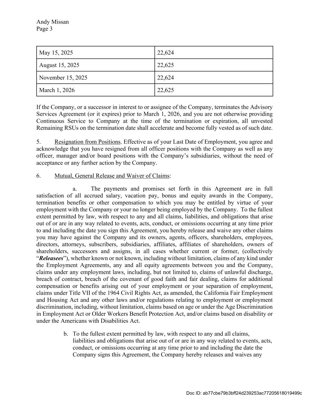 Andy Missan Page 3 May 15, 2025 22,624 August 15, 2025 22,625 November 15, 2025 22,624 March 1, 2026 22,625 If the Company, or a successor in interest to or assignee of the Company, terminates the Advisory Services Agreement (or it expires) prior to March 1, 2026, and you are not otherwise providing Continuous Service to Company at the time of the termination or expiration, all unvested Remaining RSUs on the termination date shall accelerate and become fully vested as of such date. 5. Resignation from Positions. Effective as of your Last Date of Employment, you agree and acknowledge that you have resigned from all officer positions with the Company as well as any officer, manager and/or board positions with the Company’s subsidiaries, without the need of acceptance or any further action by the Company. 6. Mutual, General Release and Waiver of Claims: a. The payments and promises set forth in this Agreement are in full satisfaction of all accrued salary, vacation pay, bonus and equity awards in the Company, termination benefits or other compensation to which you may be entitled by virtue of your employment with the Company or your no longer being employed by the Company. To the fullest extent permitted by law, with respect to any and all claims, liabilities, and obligations that arise out of or are in any way related to events, acts, conduct, or omissions occurring at any time prior to and including the date you sign this Agreement, you hereby release and waive any other claims you may have against the Company and its owners, agents, officers, shareholders, employees, directors, attorneys, subscribers, subsidiaries, affiliates, affiliates of shareholders, owners of shareholders, successors and assigns, in all cases whether current or former, (collectively “Releasees”), whether known or not known, including without limitation, claims of any kind under the Employment Agreements, any and all equity agreements between you and the Company, claims under any employment laws, including, but not limited to, claims of unlawful discharge, breach of contract, breach of the covenant of good faith and fair dealing, claims for additional compensation or benefits arising out of your employment or your separation of employment, claims under Title VII of the 1964 Civil Rights Act, as amended, the California Fair Employment and Housing Act and any other laws and/or regulations relating to employment or employment discrimination, including, without limitation, claims based on age or under the Age Discrimination in Employment Act or Older Workers Benefit Protection Act, and/or claims based on disability or under the Americans with Disabilities Act. b. To the fullest extent permitted by law, with respect to any and all claims, liabilities and obligations that arise out of or are in any way related to events, acts, conduct, or omissions occurring at any time prior to and including the date the Company signs this Agreement, the Company hereby releases and waives any Doc ID: ab77cbe79b3bff24d239253ac77205618019499c