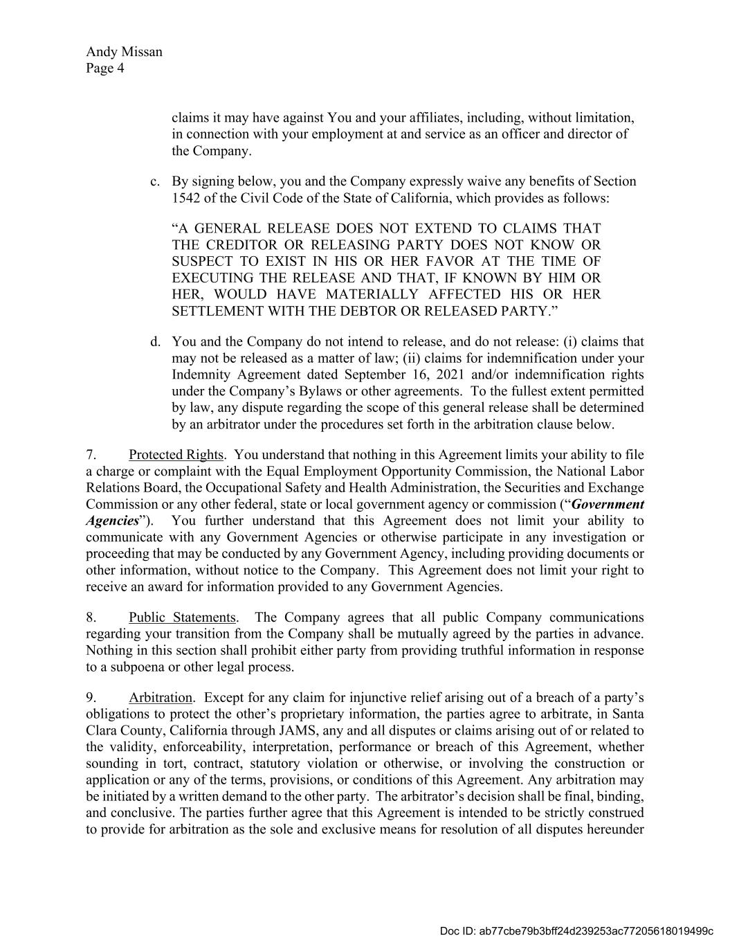 Andy Missan Page 4 claims it may have against You and your affiliates, including, without limitation, in connection with your employment at and service as an officer and director of the Company. c. By signing below, you and the Company expressly waive any benefits of Section 1542 of the Civil Code of the State of California, which provides as follows: “A GENERAL RELEASE DOES NOT EXTEND TO CLAIMS THAT THE CREDITOR OR RELEASING PARTY DOES NOT KNOW OR SUSPECT TO EXIST IN HIS OR HER FAVOR AT THE TIME OF EXECUTING THE RELEASE AND THAT, IF KNOWN BY HIM OR HER, WOULD HAVE MATERIALLY AFFECTED HIS OR HER SETTLEMENT WITH THE DEBTOR OR RELEASED PARTY.” d. You and the Company do not intend to release, and do not release: (i) claims that may not be released as a matter of law; (ii) claims for indemnification under your Indemnity Agreement dated September 16, 2021 and/or indemnification rights under the Company’s Bylaws or other agreements. To the fullest extent permitted by law, any dispute regarding the scope of this general release shall be determined by an arbitrator under the procedures set forth in the arbitration clause below. 7. Protected Rights. You understand that nothing in this Agreement limits your ability to file a charge or complaint with the Equal Employment Opportunity Commission, the National Labor Relations Board, the Occupational Safety and Health Administration, the Securities and Exchange Commission or any other federal, state or local government agency or commission (“Government Agencies”). You further understand that this Agreement does not limit your ability to communicate with any Government Agencies or otherwise participate in any investigation or proceeding that may be conducted by any Government Agency, including providing documents or other information, without notice to the Company. This Agreement does not limit your right to receive an award for information provided to any Government Agencies. 8. Public Statements. The Company agrees that all public Company communications regarding your transition from the Company shall be mutually agreed by the parties in advance. Nothing in this section shall prohibit either party from providing truthful information in response to a subpoena or other legal process. 9. Arbitration. Except for any claim for injunctive relief arising out of a breach of a party’s obligations to protect the other’s proprietary information, the parties agree to arbitrate, in Santa Clara County, California through JAMS, any and all disputes or claims arising out of or related to the validity, enforceability, interpretation, performance or breach of this Agreement, whether sounding in tort, contract, statutory violation or otherwise, or involving the construction or application or any of the terms, provisions, or conditions of this Agreement. Any arbitration may be initiated by a written demand to the other party. The arbitrator’s decision shall be final, binding, and conclusive. The parties further agree that this Agreement is intended to be strictly construed to provide for arbitration as the sole and exclusive means for resolution of all disputes hereunder Doc ID: ab77cbe79b3bff24d239253ac77205618019499c