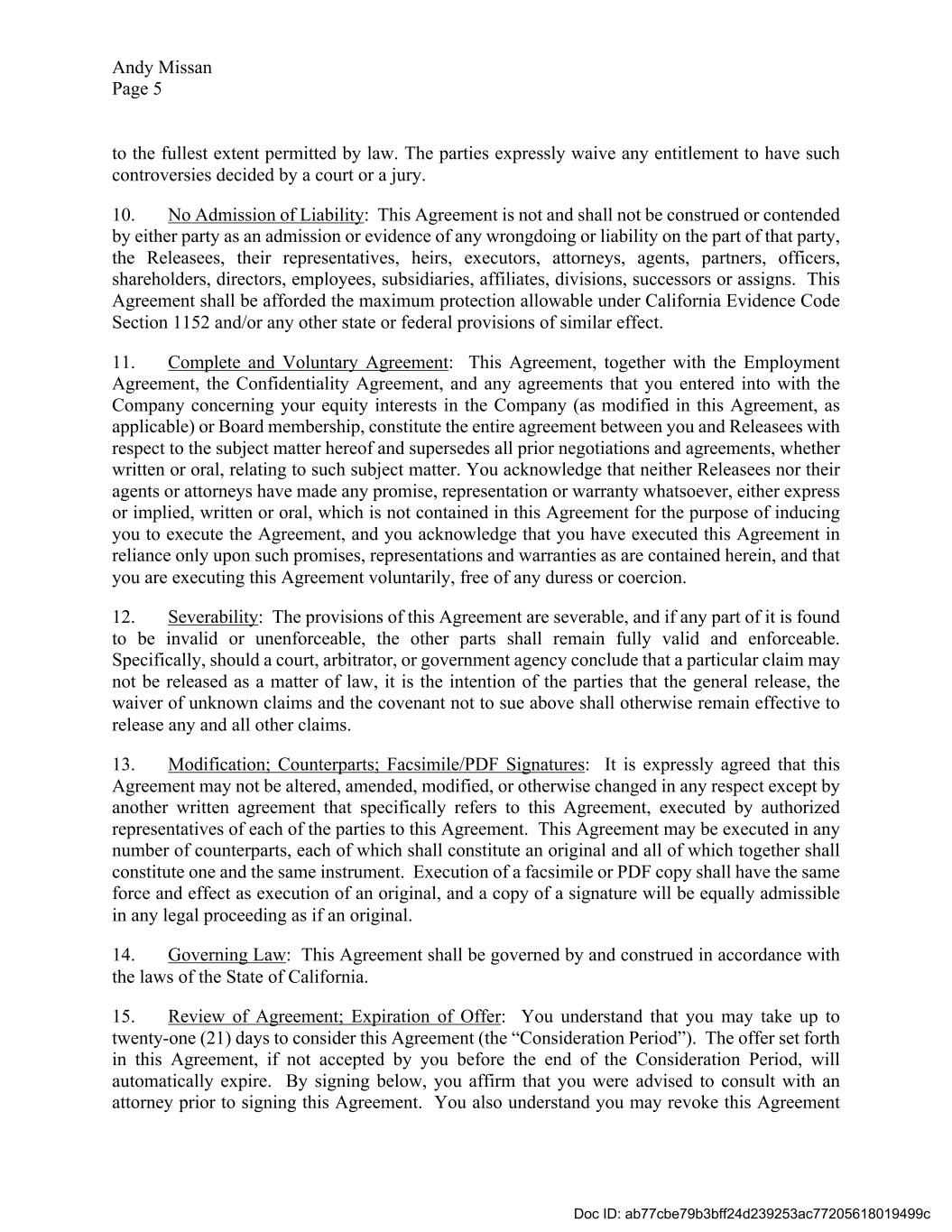 Andy Missan Page 5 to the fullest extent permitted by law. The parties expressly waive any entitlement to have such controversies decided by a court or a jury. 10. No Admission of Liability: This Agreement is not and shall not be construed or contended by either party as an admission or evidence of any wrongdoing or liability on the part of that party, the Releasees, their representatives, heirs, executors, attorneys, agents, partners, officers, shareholders, directors, employees, subsidiaries, affiliates, divisions, successors or assigns. This Agreement shall be afforded the maximum protection allowable under California Evidence Code Section 1152 and/or any other state or federal provisions of similar effect. 11. Complete and Voluntary Agreement: This Agreement, together with the Employment Agreement, the Confidentiality Agreement, and any agreements that you entered into with the Company concerning your equity interests in the Company (as modified in this Agreement, as applicable) or Board membership, constitute the entire agreement between you and Releasees with respect to the subject matter hereof and supersedes all prior negotiations and agreements, whether written or oral, relating to such subject matter. You acknowledge that neither Releasees nor their agents or attorneys have made any promise, representation or warranty whatsoever, either express or implied, written or oral, which is not contained in this Agreement for the purpose of inducing you to execute the Agreement, and you acknowledge that you have executed this Agreement in reliance only upon such promises, representations and warranties as are contained herein, and that you are executing this Agreement voluntarily, free of any duress or coercion. 12. Severability: The provisions of this Agreement are severable, and if any part of it is found to be invalid or unenforceable, the other parts shall remain fully valid and enforceable. Specifically, should a court, arbitrator, or government agency conclude that a particular claim may not be released as a matter of law, it is the intention of the parties that the general release, the waiver of unknown claims and the covenant not to sue above shall otherwise remain effective to release any and all other claims. 13. Modification; Counterparts; Facsimile/PDF Signatures: It is expressly agreed that this Agreement may not be altered, amended, modified, or otherwise changed in any respect except by another written agreement that specifically refers to this Agreement, executed by authorized representatives of each of the parties to this Agreement. This Agreement may be executed in any number of counterparts, each of which shall constitute an original and all of which together shall constitute one and the same instrument. Execution of a facsimile or PDF copy shall have the same force and effect as execution of an original, and a copy of a signature will be equally admissible in any legal proceeding as if an original. 14. Governing Law: This Agreement shall be governed by and construed in accordance with the laws of the State of California. 15. Review of Agreement; Expiration of Offer: You understand that you may take up to twenty-one (21) days to consider this Agreement (the “Consideration Period”). The offer set forth in this Agreement, if not accepted by you before the end of the Consideration Period, will automatically expire. By signing below, you affirm that you were advised to consult with an attorney prior to signing this Agreement. You also understand you may revoke this Agreement Doc ID: ab77cbe79b3bff24d239253ac77205618019499c