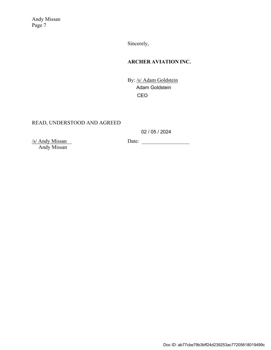 Andy Missan Page 7 Sincerely, ARCHER AVIATION INC. By: /s/ Adam Goldstein READ, UNDERSTOOD AND AGREED Date: __________________ /s/ Andy Missan__ Andy Missan Adam Goldstein CEO 02 / 05 / 2024 Doc ID: ab77cbe79b3bff24d239253ac77205618019499c