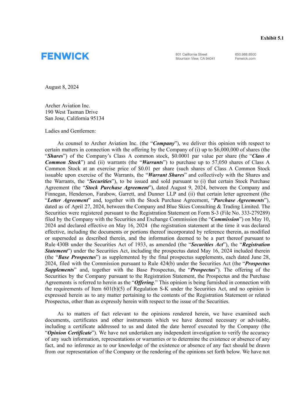 Exhibit 5.1 August 8, 2024 Archer Aviation Inc. 190 West Tasman Drive San Jose, California 95134 Ladies and Gentlemen: As counsel to Archer Aviation Inc. (the “Company”), we deliver this opinion with respect to certain matters in connection with the offering by the Company of (i) up to $6,000,000 of shares (the “Shares”) of the Company’s Class A common stock, $0.0001 par value per share (the “Class A Common Stock”) and (ii) warrants (the “Warrants”) to purchase up to 57,050 shares of Class A Common Stock at an exercise price of $0.01 per share (such shares of Class A Common Stock issuable upon exercise of the Warrants, the “Warrant Shares” and collectively with the Shares and the Warrants, the “Securities”), to be issued and sold pursuant to (i) that certain Stock Purchase Agreement (the “Stock Purchase Agreement”), dated August 9, 2024, between the Company and Finnegan, Henderson, Farabow, Garrett, and Dunner LLP and (ii) that certain letter agreement (the “Letter Agreement” and, together with the Stock Purchase Agreement, “Purchase Agreements”), dated as of April 27, 2024, between the Company and Blue Skies Consulting & Trading Limited. The Securities were registered pursuant to the Registration Statement on Form S-3 (File No. 333-279289) filed by the Company with the Securities and Exchange Commission (the “Commission”) on May 10, 2024 and declared effective on May 16, 2024 (the registration statement at the time it was declared effective, including the documents or portions thereof incorporated by reference therein, as modified or superseded as described therein, and the information deemed to be a part thereof pursuant to Rule 430B under the Securities Act of 1933, as amended (the “Securities Act”), the “Registration Statement”) under the Securities Act, including the prospectus dated May 16, 2024 included therein (the “Base Prospectus”) as supplemented by the final prospectus supplements, each dated June 28, 2024, filed with the Commission pursuant to Rule 424(b) under the Securities Act (the “Prospectus Supplements” and, together with the Base Prospectus, the “Prospectus”). The offering of the Securities by the Company pursuant to the Registration Statement, the Prospectus and the Purchase Agreements is referred to herein as the “Offering.” This opinion is being furnished in connection with the requirements of Item 601(b)(5) of Regulation S-K under the Securities Act, and no opinion is expressed herein as to any matter pertaining to the contents of the Registration Statement or related Prospectus, other than as expressly herein with respect to the issue of the Securities. As to matters of fact relevant to the opinions rendered herein, we have examined such documents, certificates and other instruments which we have deemed necessary or advisable, including a certificate addressed to us and dated the date hereof executed by the Company (the “Opinion Certificate”). We have not undertaken any independent investigation to verify the accuracy of any such information, representations or warranties or to determine the existence or absence of any fact, and no inference as to our knowledge of the existence or absence of any fact should be drawn from our representation of the Company or the rendering of the opinions set forth below. We have not