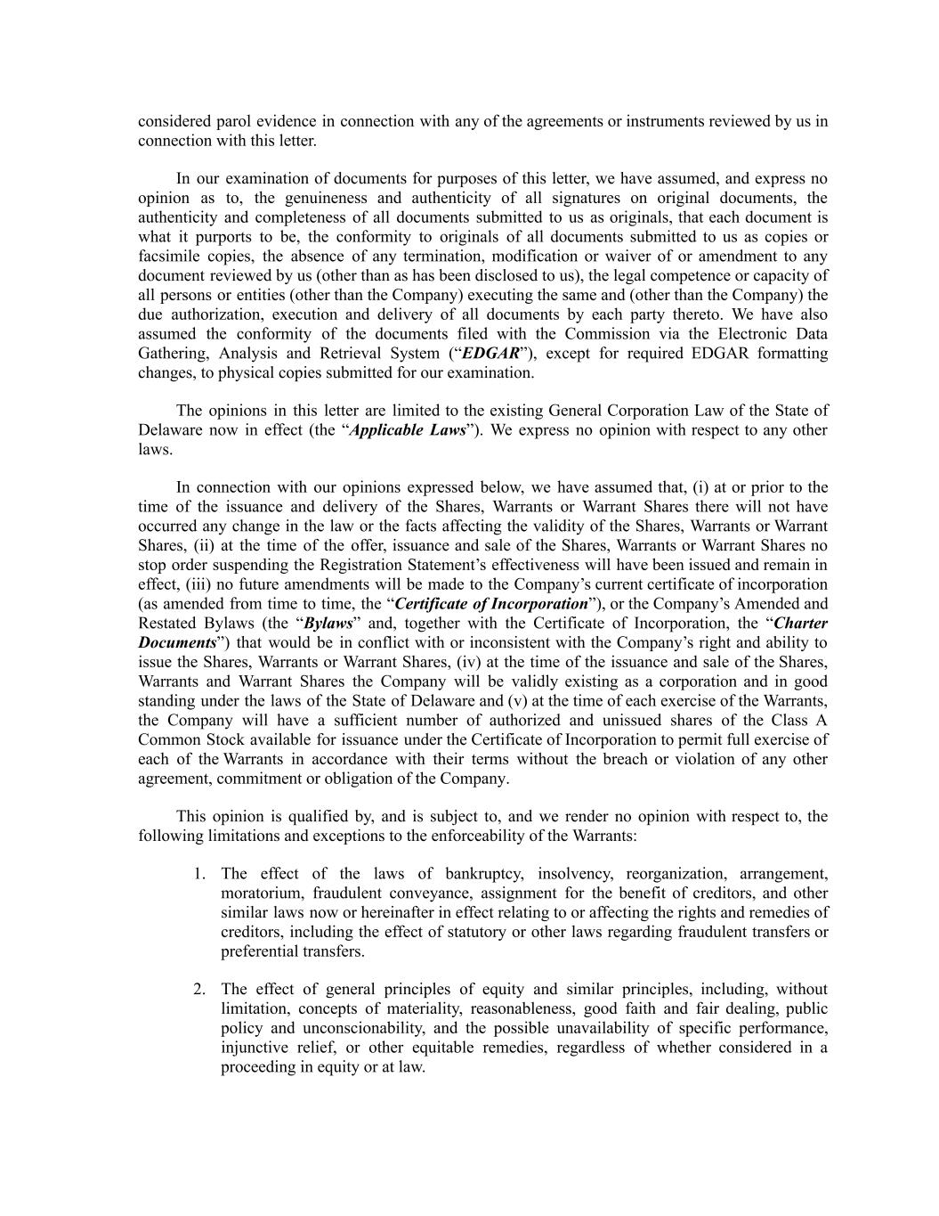 considered parol evidence in connection with any of the agreements or instruments reviewed by us in connection with this letter. In our examination of documents for purposes of this letter, we have assumed, and express no opinion as to, the genuineness and authenticity of all signatures on original documents, the authenticity and completeness of all documents submitted to us as originals, that each document is what it purports to be, the conformity to originals of all documents submitted to us as copies or facsimile copies, the absence of any termination, modification or waiver of or amendment to any document reviewed by us (other than as has been disclosed to us), the legal competence or capacity of all persons or entities (other than the Company) executing the same and (other than the Company) the due authorization, execution and delivery of all documents by each party thereto. We have also assumed the conformity of the documents filed with the Commission via the Electronic Data Gathering, Analysis and Retrieval System (“EDGAR”), except for required EDGAR formatting changes, to physical copies submitted for our examination. The opinions in this letter are limited to the existing General Corporation Law of the State of Delaware now in effect (the “Applicable Laws”). We express no opinion with respect to any other laws. In connection with our opinions expressed below, we have assumed that, (i) at or prior to the time of the issuance and delivery of the Shares, Warrants or Warrant Shares there will not have occurred any change in the law or the facts affecting the validity of the Shares, Warrants or Warrant Shares, (ii) at the time of the offer, issuance and sale of the Shares, Warrants or Warrant Shares no stop order suspending the Registration Statement’s effectiveness will have been issued and remain in effect, (iii) no future amendments will be made to the Company’s current certificate of incorporation (as amended from time to time, the “Certificate of Incorporation”), or the Company’s Amended and Restated Bylaws (the “Bylaws” and, together with the Certificate of Incorporation, the “Charter Documents”) that would be in conflict with or inconsistent with the Company’s right and ability to issue the Shares, Warrants or Warrant Shares, (iv) at the time of the issuance and sale of the Shares, Warrants and Warrant Shares the Company will be validly existing as a corporation and in good standing under the laws of the State of Delaware and (v) at the time of each exercise of the Warrants, the Company will have a sufficient number of authorized and unissued shares of the Class A Common Stock available for issuance under the Certificate of Incorporation to permit full exercise of each of the Warrants in accordance with their terms without the breach or violation of any other agreement, commitment or obligation of the Company. This opinion is qualified by, and is subject to, and we render no opinion with respect to, the following limitations and exceptions to the enforceability of the Warrants: 1. The effect of the laws of bankruptcy, insolvency, reorganization, arrangement, moratorium, fraudulent conveyance, assignment for the benefit of creditors, and other similar laws now or hereinafter in effect relating to or affecting the rights and remedies of creditors, including the effect of statutory or other laws regarding fraudulent transfers or preferential transfers. 2. The effect of general principles of equity and similar principles, including, without limitation, concepts of materiality, reasonableness, good faith and fair dealing, public policy and unconscionability, and the possible unavailability of specific performance, injunctive relief, or other equitable remedies, regardless of whether considered in a proceeding in equity or at law.