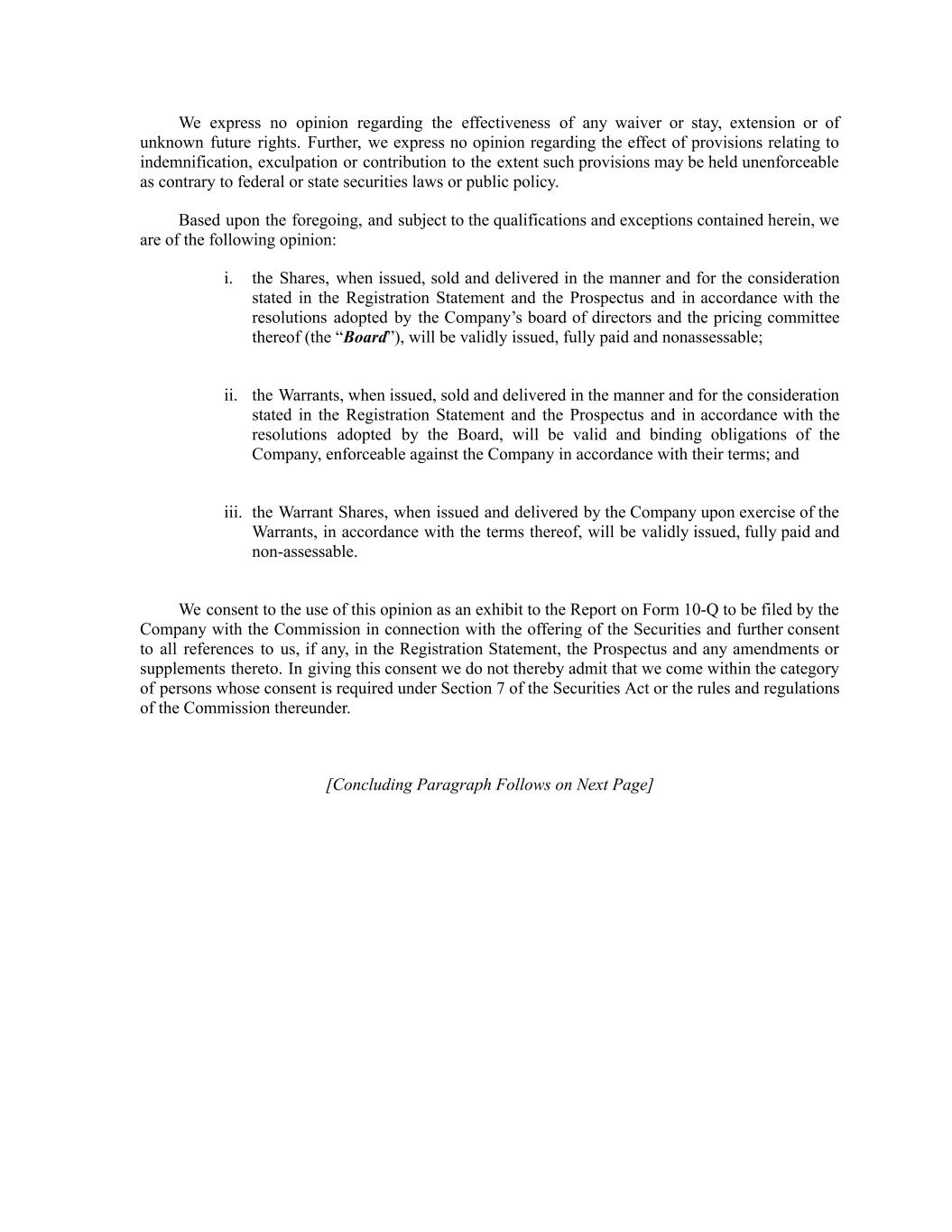 We express no opinion regarding the effectiveness of any waiver or stay, extension or of unknown future rights. Further, we express no opinion regarding the effect of provisions relating to indemnification, exculpation or contribution to the extent such provisions may be held unenforceable as contrary to federal or state securities laws or public policy. Based upon the foregoing, and subject to the qualifications and exceptions contained herein, we are of the following opinion: i. the Shares, when issued, sold and delivered in the manner and for the consideration stated in the Registration Statement and the Prospectus and in accordance with the resolutions adopted by the Company’s board of directors and the pricing committee thereof (the “Board”), will be validly issued, fully paid and nonassessable; ii. the Warrants, when issued, sold and delivered in the manner and for the consideration stated in the Registration Statement and the Prospectus and in accordance with the resolutions adopted by the Board, will be valid and binding obligations of the Company, enforceable against the Company in accordance with their terms; and iii. the Warrant Shares, when issued and delivered by the Company upon exercise of the Warrants, in accordance with the terms thereof, will be validly issued, fully paid and non-assessable. We consent to the use of this opinion as an exhibit to the Report on Form 10-Q to be filed by the Company with the Commission in connection with the offering of the Securities and further consent to all references to us, if any, in the Registration Statement, the Prospectus and any amendments or supplements thereto. In giving this consent we do not thereby admit that we come within the category of persons whose consent is required under Section 7 of the Securities Act or the rules and regulations of the Commission thereunder. [Concluding Paragraph Follows on Next Page]