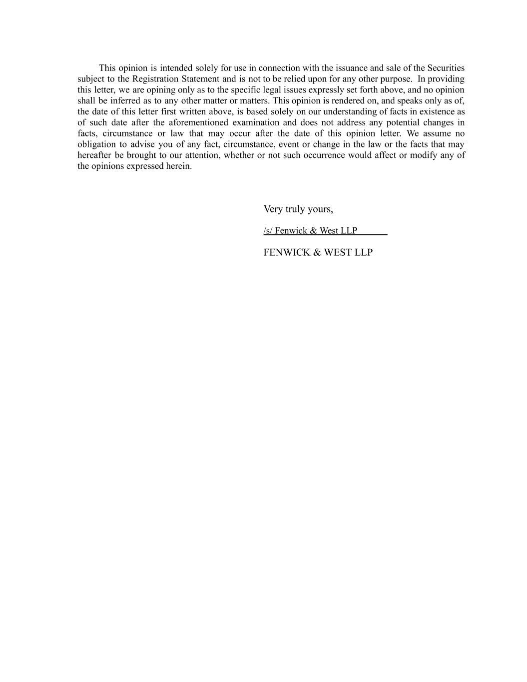 This opinion is intended solely for use in connection with the issuance and sale of the Securities subject to the Registration Statement and is not to be relied upon for any other purpose. In providing this letter, we are opining only as to the specific legal issues expressly set forth above, and no opinion shall be inferred as to any other matter or matters. This opinion is rendered on, and speaks only as of, the date of this letter first written above, is based solely on our understanding of facts in existence as of such date after the aforementioned examination and does not address any potential changes in facts, circumstance or law that may occur after the date of this opinion letter. We assume no obligation to advise you of any fact, circumstance, event or change in the law or the facts that may hereafter be brought to our attention, whether or not such occurrence would affect or modify any of the opinions expressed herein. Very truly yours, /s/ Fenwick & West LLP FENWICK & WEST LLP