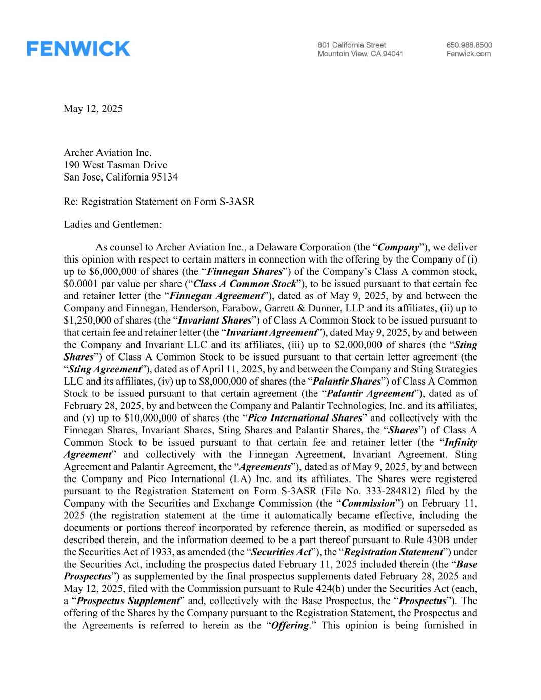 May 12, 2025 Archer Aviation Inc. 190 West Tasman Drive San Jose, California 95134 Re: Registration Statement on Form S-3ASR Ladies and Gentlemen: As counsel to Archer Aviation Inc., a Delaware Corporation (the “Company”), we deliver this opinion with respect to certain matters in connection with the offering by the Company of (i) up to $6,000,000 of shares (the “Finnegan Shares”) of the Company’s Class A common stock, $0.0001 par value per share (“Class A Common Stock”), to be issued pursuant to that certain fee and retainer letter (the “Finnegan Agreement”), dated as of May 9, 2025, by and between the Company and Finnegan, Henderson, Farabow, Garrett & Dunner, LLP and its affiliates, (ii) up to $1,250,000 of shares (the “Invariant Shares”) of Class A Common Stock to be issued pursuant to that certain fee and retainer letter (the “Invariant Agreement”), dated May 9, 2025, by and between the Company and Invariant LLC and its affiliates, (iii) up to $2,000,000 of shares (the “Sting Shares”) of Class A Common Stock to be issued pursuant to that certain letter agreement (the “Sting Agreement”), dated as of April 11, 2025, by and between the Company and Sting Strategies LLC and its affiliates, (iv) up to $8,000,000 of shares (the “Palantir Shares”) of Class A Common Stock to be issued pursuant to that certain agreement (the “Palantir Agreement”), dated as of February 28, 2025, by and between the Company and Palantir Technologies, Inc. and its affiliates, and (v) up to $10,000,000 of shares (the “Pico International Shares” and collectively with the Finnegan Shares, Invariant Shares, Sting Shares and Palantir Shares, the “Shares”) of Class A Common Stock to be issued pursuant to that certain fee and retainer letter (the “Infinity Agreement” and collectively with the Finnegan Agreement, Invariant Agreement, Sting Agreement and Palantir Agreement, the “Agreements”), dated as of May 9, 2025, by and between the Company and Pico International (LA) Inc. and its affiliates. The Shares were registered pursuant to the Registration Statement on Form S-3ASR (File No. 333-284812) filed by the Company with the Securities and Exchange Commission (the “Commission”) on February 11, 2025 (the registration statement at the time it automatically became effective, including the documents or portions thereof incorporated by reference therein, as modified or superseded as described therein, and the information deemed to be a part thereof pursuant to Rule 430B under the Securities Act of 1933, as amended (the “Securities Act”), the “Registration Statement”) under the Securities Act, including the prospectus dated February 11, 2025 included therein (the “Base Prospectus”) as supplemented by the final prospectus supplements dated February 28, 2025 and May 12, 2025, filed with the Commission pursuant to Rule 424(b) under the Securities Act (each, a “Prospectus Supplement” and, collectively with the Base Prospectus, the “Prospectus”). The offering of the Shares by the Company pursuant to the Registration Statement, the Prospectus and the Agreements is referred to herein as the “Offering.” This opinion is being furnished in