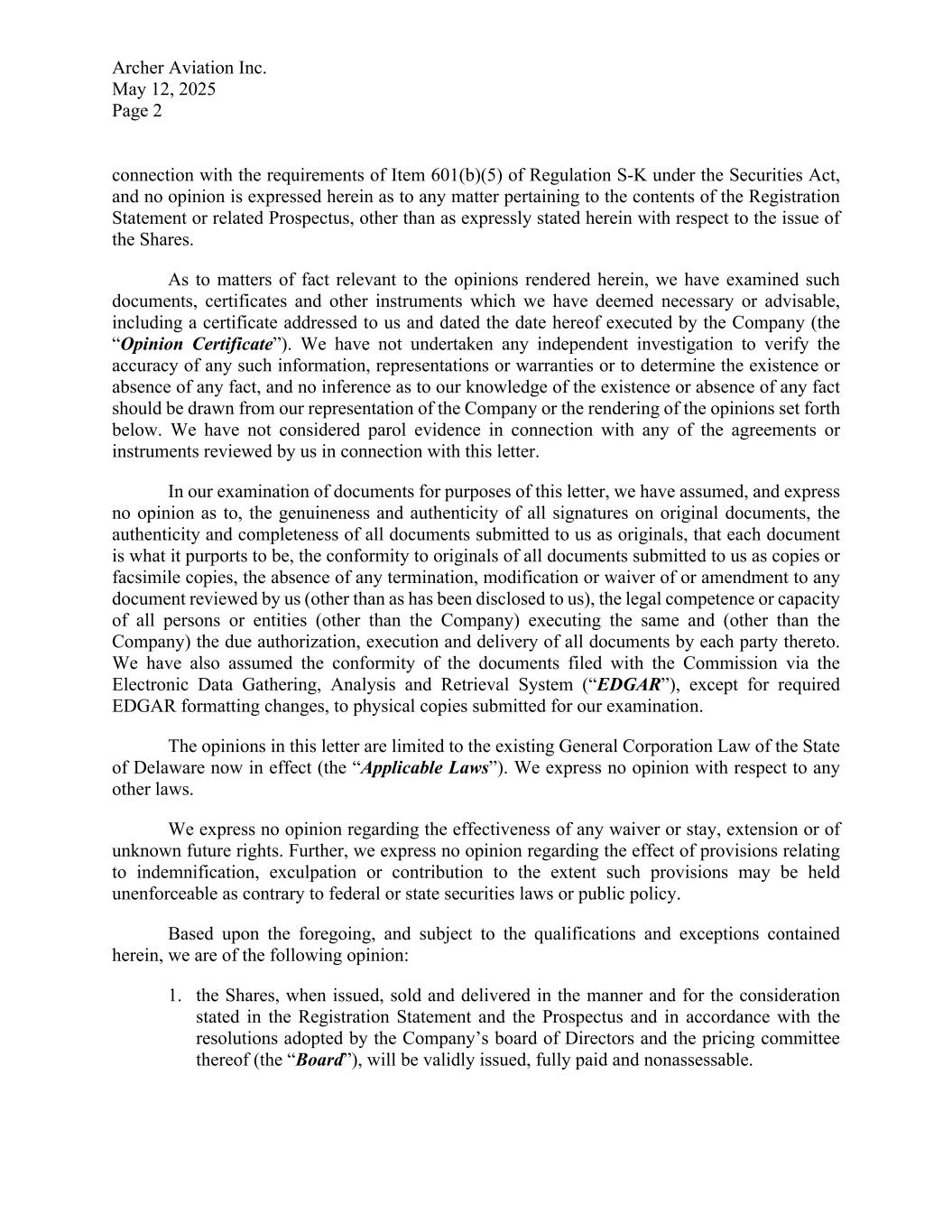 Archer Aviation Inc. May 12, 2025 Page 2 connection with the requirements of Item 601(b)(5) of Regulation S-K under the Securities Act, and no opinion is expressed herein as to any matter pertaining to the contents of the Registration Statement or related Prospectus, other than as expressly stated herein with respect to the issue of the Shares. As to matters of fact relevant to the opinions rendered herein, we have examined such documents, certificates and other instruments which we have deemed necessary or advisable, including a certificate addressed to us and dated the date hereof executed by the Company (the “Opinion Certificate”). We have not undertaken any independent investigation to verify the accuracy of any such information, representations or warranties or to determine the existence or absence of any fact, and no inference as to our knowledge of the existence or absence of any fact should be drawn from our representation of the Company or the rendering of the opinions set forth below. We have not considered parol evidence in connection with any of the agreements or instruments reviewed by us in connection with this letter. In our examination of documents for purposes of this letter, we have assumed, and express no opinion as to, the genuineness and authenticity of all signatures on original documents, the authenticity and completeness of all documents submitted to us as originals, that each document is what it purports to be, the conformity to originals of all documents submitted to us as copies or facsimile copies, the absence of any termination, modification or waiver of or amendment to any document reviewed by us (other than as has been disclosed to us), the legal competence or capacity of all persons or entities (other than the Company) executing the same and (other than the Company) the due authorization, execution and delivery of all documents by each party thereto. We have also assumed the conformity of the documents filed with the Commission via the Electronic Data Gathering, Analysis and Retrieval System (“EDGAR”), except for required EDGAR formatting changes, to physical copies submitted for our examination. The opinions in this letter are limited to the existing General Corporation Law of the State of Delaware now in effect (the “Applicable Laws”). We express no opinion with respect to any other laws. We express no opinion regarding the effectiveness of any waiver or stay, extension or of unknown future rights. Further, we express no opinion regarding the effect of provisions relating to indemnification, exculpation or contribution to the extent such provisions may be held unenforceable as contrary to federal or state securities laws or public policy. Based upon the foregoing, and subject to the qualifications and exceptions contained herein, we are of the following opinion: 1. the Shares, when issued, sold and delivered in the manner and for the consideration stated in the Registration Statement and the Prospectus and in accordance with the resolutions adopted by the Company’s board of Directors and the pricing committee thereof (the “Board”), will be validly issued, fully paid and nonassessable.