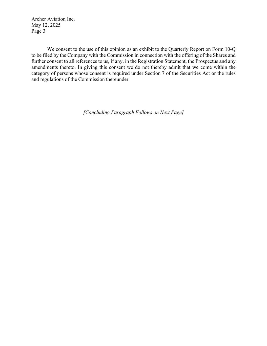 Archer Aviation Inc. May 12, 2025 Page 3 We consent to the use of this opinion as an exhibit to the Quarterly Report on Form 10-Q to be filed by the Company with the Commission in connection with the offering of the Shares and further consent to all references to us, if any, in the Registration Statement, the Prospectus and any amendments thereto. In giving this consent we do not thereby admit that we come within the category of persons whose consent is required under Section 7 of the Securities Act or the rules and regulations of the Commission thereunder. [Concluding Paragraph Follows on Next Page]