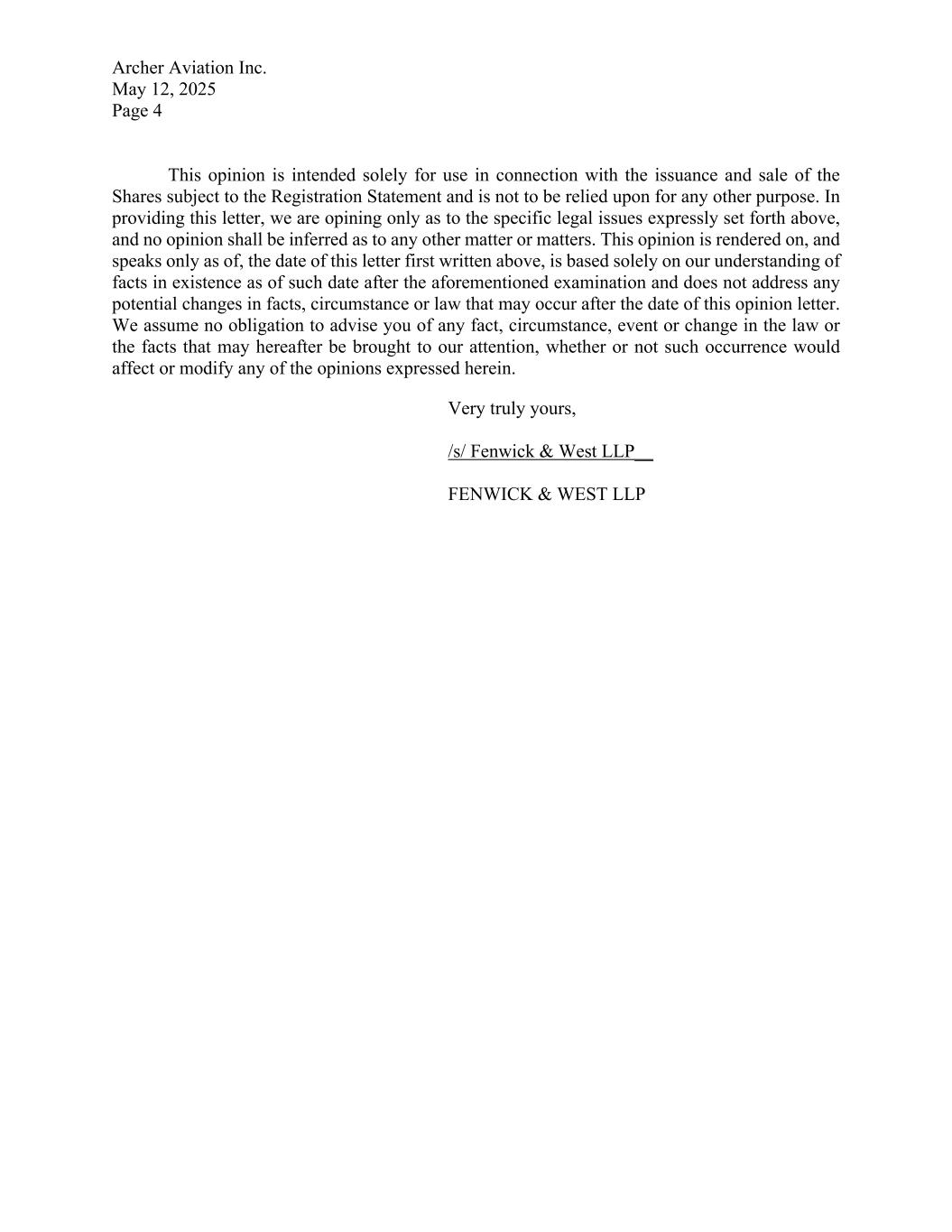 Archer Aviation Inc. May 12, 2025 Page 4 This opinion is intended solely for use in connection with the issuance and sale of the Shares subject to the Registration Statement and is not to be relied upon for any other purpose. In providing this letter, we are opining only as to the specific legal issues expressly set forth above, and no opinion shall be inferred as to any other matter or matters. This opinion is rendered on, and speaks only as of, the date of this letter first written above, is based solely on our understanding of facts in existence as of such date after the aforementioned examination and does not address any potential changes in facts, circumstance or law that may occur after the date of this opinion letter. We assume no obligation to advise you of any fact, circumstance, event or change in the law or the facts that may hereafter be brought to our attention, whether or not such occurrence would affect or modify any of the opinions expressed herein. Very truly yours, /s/ Fenwick & West LLP__ FENWICK & WEST LLP