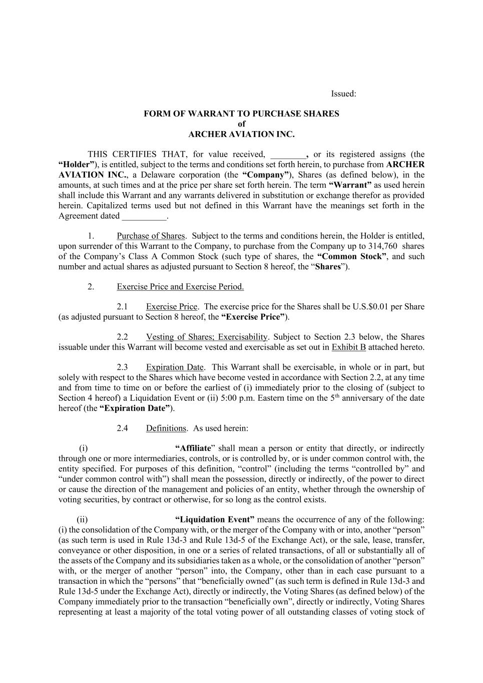 Issued: FORM OF WARRANT TO PURCHASE SHARES of ARCHER AVIATION INC. THIS CERTIFIES THAT, for value received, ________, or its registered assigns (the “Holder”), is entitled, subject to the terms and conditions set forth herein, to purchase from ARCHER AVIATION INC., a Delaware corporation (the “Company”), Shares (as defined below), in the amounts, at such times and at the price per share set forth herein. The term “Warrant” as used herein shall include this Warrant and any warrants delivered in substitution or exchange therefor as provided herein. Capitalized terms used but not defined in this Warrant have the meanings set forth in the Agreement dated __________. 1. Purchase of Shares. Subject to the terms and conditions herein, the Holder is entitled, upon surrender of this Warrant to the Company, to purchase from the Company up to 314,760 shares of the Company’s Class A Common Stock (such type of shares, the “Common Stock”, and such number and actual shares as adjusted pursuant to Section 8 hereof, the “Shares”). 2. Exercise Price and Exercise Period. 2.1 Exercise Price. The exercise price for the Shares shall be U.S.$0.01 per Share (as adjusted pursuant to Section 8 hereof, the “Exercise Price”). 2.2 Vesting of Shares; Exercisability. Subject to Section 2.3 below, the Shares issuable under this Warrant will become vested and exercisable as set out in Exhibit B attached hereto. 2.3 Expiration Date. This Warrant shall be exercisable, in whole or in part, but solely with respect to the Shares which have become vested in accordance with Section 2.2, at any time and from time to time on or before the earliest of (i) immediately prior to the closing of (subject to Section 4 hereof) a Liquidation Event or (ii) 5:00 p.m. Eastern time on the 5th anniversary of the date hereof (the “Expiration Date”). 2.4 Definitions. As used herein: (i) “Affiliate” shall mean a person or entity that directly, or indirectly through one or more intermediaries, controls, or is controlled by, or is under common control with, the entity specified. For purposes of this definition, “control” (including the terms “controlled by” and “under common control with”) shall mean the possession, directly or indirectly, of the power to direct or cause the direction of the management and policies of an entity, whether through the ownership of voting securities, by contract or otherwise, for so long as the control exists. (ii) “Liquidation Event” means the occurrence of any of the following: (i) the consolidation of the Company with, or the merger of the Company with or into, another “person” (as such term is used in Rule 13d-3 and Rule 13d-5 of the Exchange Act), or the sale, lease, transfer, conveyance or other disposition, in one or a series of related transactions, of all or substantially all of the assets of the Company and its subsidiaries taken as a whole, or the consolidation of another “person” with, or the merger of another “person” into, the Company, other than in each case pursuant to a transaction in which the “persons” that “beneficially owned” (as such term is defined in Rule 13d-3 and Rule 13d-5 under the Exchange Act), directly or indirectly, the Voting Shares (as defined below) of the Company immediately prior to the transaction “beneficially own”, directly or indirectly, Voting Shares representing at least a majority of the total voting power of all outstanding classes of voting stock of