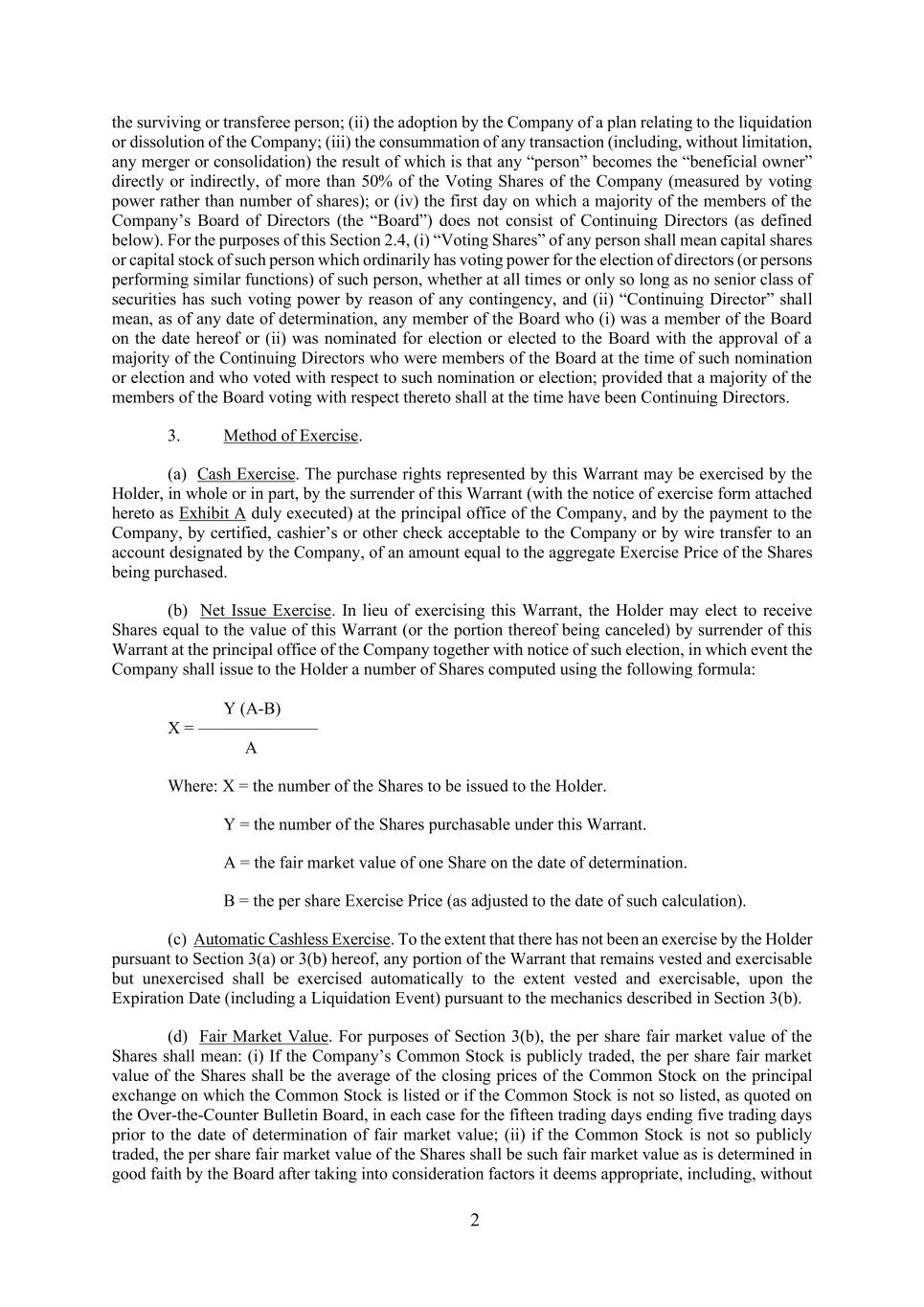 2 the surviving or transferee person; (ii) the adoption by the Company of a plan relating to the liquidation or dissolution of the Company; (iii) the consummation of any transaction (including, without limitation, any merger or consolidation) the result of which is that any “person” becomes the “beneficial owner” directly or indirectly, of more than 50% of the Voting Shares of the Company (measured by voting power rather than number of shares); or (iv) the first day on which a majority of the members of the Company’s Board of Directors (the “Board”) does not consist of Continuing Directors (as defined below). For the purposes of this Section 2.4, (i) “Voting Shares” of any person shall mean capital shares or capital stock of such person which ordinarily has voting power for the election of directors (or persons performing similar functions) of such person, whether at all times or only so long as no senior class of securities has such voting power by reason of any contingency, and (ii) “Continuing Director” shall mean, as of any date of determination, any member of the Board who (i) was a member of the Board on the date hereof or (ii) was nominated for election or elected to the Board with the approval of a majority of the Continuing Directors who were members of the Board at the time of such nomination or election and who voted with respect to such nomination or election; provided that a majority of the members of the Board voting with respect thereto shall at the time have been Continuing Directors. 3. Method of Exercise. (a) Cash Exercise. The purchase rights represented by this Warrant may be exercised by the Holder, in whole or in part, by the surrender of this Warrant (with the notice of exercise form attached hereto as Exhibit A duly executed) at the principal office of the Company, and by the payment to the Company, by certified, cashier’s or other check acceptable to the Company or by wire transfer to an account designated by the Company, of an amount equal to the aggregate Exercise Price of the Shares being purchased. (b) Net Issue Exercise. In lieu of exercising this Warrant, the Holder may elect to receive Shares equal to the value of this Warrant (or the portion thereof being canceled) by surrender of this Warrant at the principal office of the Company together with notice of such election, in which event the Company shall issue to the Holder a number of Shares computed using the following formula: Y (A-B) X = ——————— A Where: X = the number of the Shares to be issued to the Holder. Y = the number of the Shares purchasable under this Warrant. A = the fair market value of one Share on the date of determination. B = the per share Exercise Price (as adjusted to the date of such calculation). (c) Automatic Cashless Exercise. To the extent that there has not been an exercise by the Holder pursuant to Section 3(a) or 3(b) hereof, any portion of the Warrant that remains vested and exercisable but unexercised shall be exercised automatically to the extent vested and exercisable, upon the Expiration Date (including a Liquidation Event) pursuant to the mechanics described in Section 3(b). (d) Fair Market Value. For purposes of Section 3(b), the per share fair market value of the Shares shall mean: (i) If the Company’s Common Stock is publicly traded, the per share fair market value of the Shares shall be the average of the closing prices of the Common Stock on the principal exchange on which the Common Stock is listed or if the Common Stock is not so listed, as quoted on the Over-the-Counter Bulletin Board, in each case for the fifteen trading days ending five trading days prior to the date of determination of fair market value; (ii) if the Common Stock is not so publicly traded, the per share fair market value of the Shares shall be such fair market value as is determined in good faith by the Board after taking into consideration factors it deems appropriate, including, without