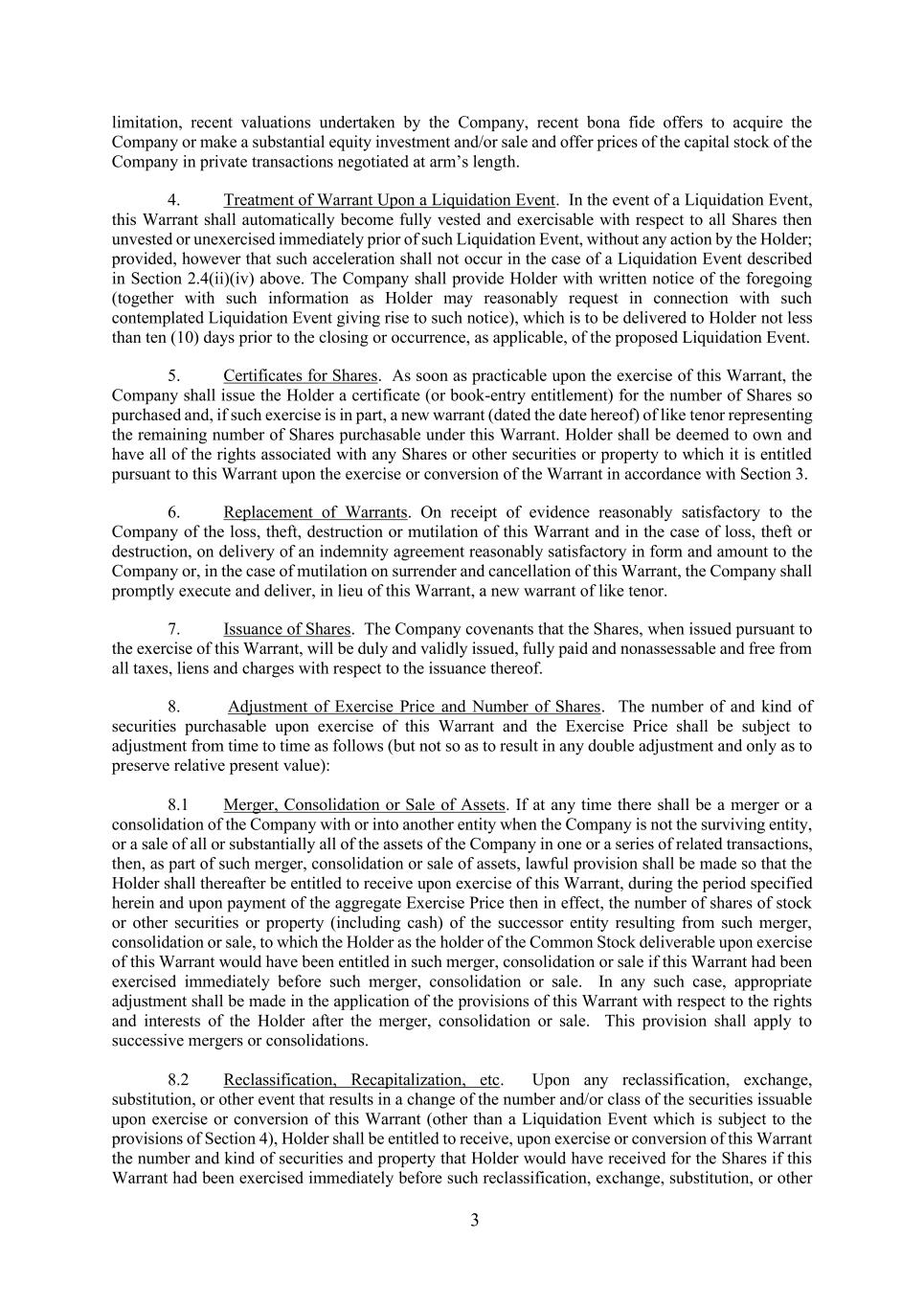 3 limitation, recent valuations undertaken by the Company, recent bona fide offers to acquire the Company or make a substantial equity investment and/or sale and offer prices of the capital stock of the Company in private transactions negotiated at arm’s length. 4. Treatment of Warrant Upon a Liquidation Event. In the event of a Liquidation Event, this Warrant shall automatically become fully vested and exercisable with respect to all Shares then unvested or unexercised immediately prior of such Liquidation Event, without any action by the Holder; provided, however that such acceleration shall not occur in the case of a Liquidation Event described in Section 2.4(ii)(iv) above. The Company shall provide Holder with written notice of the foregoing (together with such information as Holder may reasonably request in connection with such contemplated Liquidation Event giving rise to such notice), which is to be delivered to Holder not less than ten (10) days prior to the closing or occurrence, as applicable, of the proposed Liquidation Event. 5. Certificates for Shares. As soon as practicable upon the exercise of this Warrant, the Company shall issue the Holder a certificate (or book-entry entitlement) for the number of Shares so purchased and, if such exercise is in part, a new warrant (dated the date hereof) of like tenor representing the remaining number of Shares purchasable under this Warrant. Holder shall be deemed to own and have all of the rights associated with any Shares or other securities or property to which it is entitled pursuant to this Warrant upon the exercise or conversion of the Warrant in accordance with Section 3. 6. Replacement of Warrants. On receipt of evidence reasonably satisfactory to the Company of the loss, theft, destruction or mutilation of this Warrant and in the case of loss, theft or destruction, on delivery of an indemnity agreement reasonably satisfactory in form and amount to the Company or, in the case of mutilation on surrender and cancellation of this Warrant, the Company shall promptly execute and deliver, in lieu of this Warrant, a new warrant of like tenor. 7. Issuance of Shares. The Company covenants that the Shares, when issued pursuant to the exercise of this Warrant, will be duly and validly issued, fully paid and nonassessable and free from all taxes, liens and charges with respect to the issuance thereof. 8. Adjustment of Exercise Price and Number of Shares. The number of and kind of securities purchasable upon exercise of this Warrant and the Exercise Price shall be subject to adjustment from time to time as follows (but not so as to result in any double adjustment and only as to preserve relative present value): 8.1 Merger, Consolidation or Sale of Assets. If at any time there shall be a merger or a consolidation of the Company with or into another entity when the Company is not the surviving entity, or a sale of all or substantially all of the assets of the Company in one or a series of related transactions, then, as part of such merger, consolidation or sale of assets, lawful provision shall be made so that the Holder shall thereafter be entitled to receive upon exercise of this Warrant, during the period specified herein and upon payment of the aggregate Exercise Price then in effect, the number of shares of stock or other securities or property (including cash) of the successor entity resulting from such merger, consolidation or sale, to which the Holder as the holder of the Common Stock deliverable upon exercise of this Warrant would have been entitled in such merger, consolidation or sale if this Warrant had been exercised immediately before such merger, consolidation or sale. In any such case, appropriate adjustment shall be made in the application of the provisions of this Warrant with respect to the rights and interests of the Holder after the merger, consolidation or sale. This provision shall apply to successive mergers or consolidations. 8.2 Reclassification, Recapitalization, etc. Upon any reclassification, exchange, substitution, or other event that results in a change of the number and/or class of the securities issuable upon exercise or conversion of this Warrant (other than a Liquidation Event which is subject to the provisions of Section 4), Holder shall be entitled to receive, upon exercise or conversion of this Warrant the number and kind of securities and property that Holder would have received for the Shares if this Warrant had been exercised immediately before such reclassification, exchange, substitution, or other