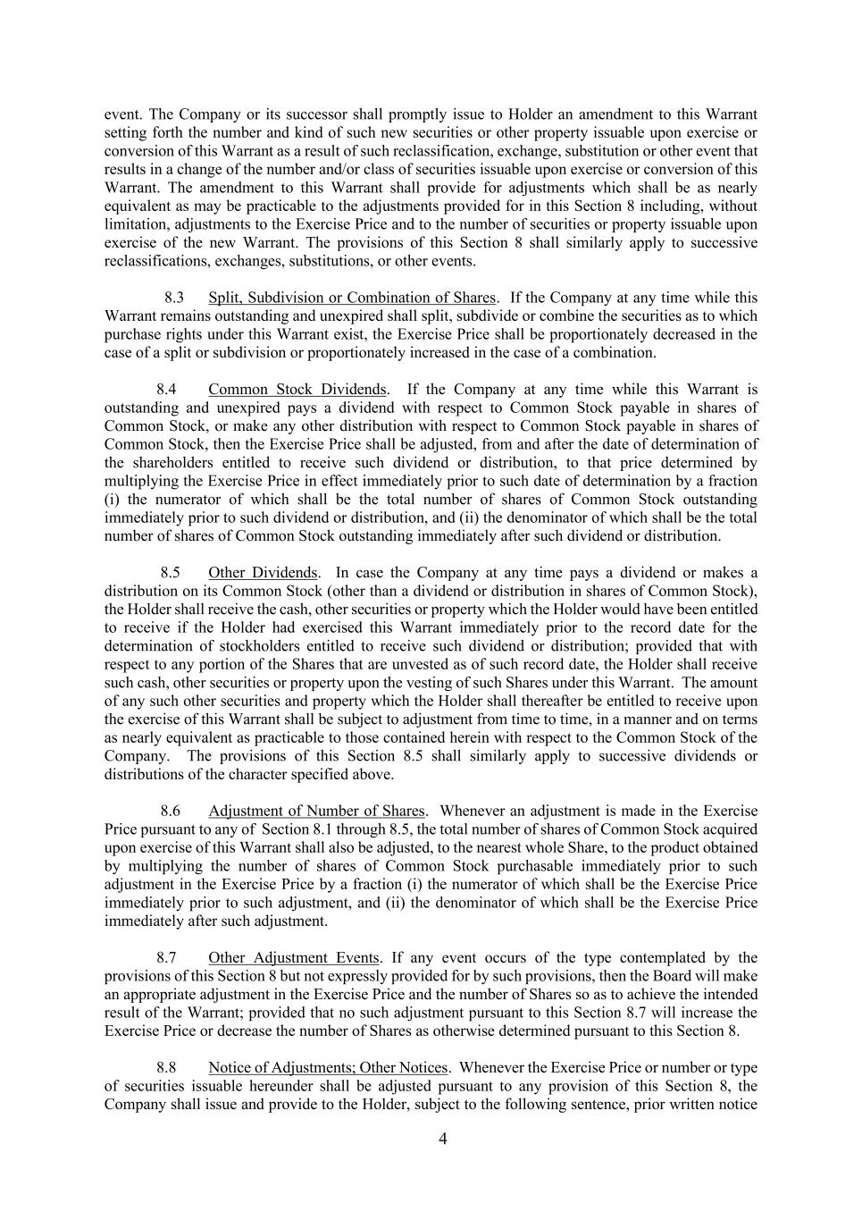 4 event. The Company or its successor shall promptly issue to Holder an amendment to this Warrant setting forth the number and kind of such new securities or other property issuable upon exercise or conversion of this Warrant as a result of such reclassification, exchange, substitution or other event that results in a change of the number and/or class of securities issuable upon exercise or conversion of this Warrant. The amendment to this Warrant shall provide for adjustments which shall be as nearly equivalent as may be practicable to the adjustments provided for in this Section 8 including, without limitation, adjustments to the Exercise Price and to the number of securities or property issuable upon exercise of the new Warrant. The provisions of this Section 8 shall similarly apply to successive reclassifications, exchanges, substitutions, or other events. 8.3 Split, Subdivision or Combination of Shares. If the Company at any time while this Warrant remains outstanding and unexpired shall split, subdivide or combine the securities as to which purchase rights under this Warrant exist, the Exercise Price shall be proportionately decreased in the case of a split or subdivision or proportionately increased in the case of a combination. 8.4 Common Stock Dividends. If the Company at any time while this Warrant is outstanding and unexpired pays a dividend with respect to Common Stock payable in shares of Common Stock, or make any other distribution with respect to Common Stock payable in shares of Common Stock, then the Exercise Price shall be adjusted, from and after the date of determination of the shareholders entitled to receive such dividend or distribution, to that price determined by multiplying the Exercise Price in effect immediately prior to such date of determination by a fraction (i) the numerator of which shall be the total number of shares of Common Stock outstanding immediately prior to such dividend or distribution, and (ii) the denominator of which shall be the total number of shares of Common Stock outstanding immediately after such dividend or distribution. 8.5 Other Dividends. In case the Company at any time pays a dividend or makes a distribution on its Common Stock (other than a dividend or distribution in shares of Common Stock), the Holder shall receive the cash, other securities or property which the Holder would have been entitled to receive if the Holder had exercised this Warrant immediately prior to the record date for the determination of stockholders entitled to receive such dividend or distribution; provided that with respect to any portion of the Shares that are unvested as of such record date, the Holder shall receive such cash, other securities or property upon the vesting of such Shares under this Warrant. The amount of any such other securities and property which the Holder shall thereafter be entitled to receive upon the exercise of this Warrant shall be subject to adjustment from time to time, in a manner and on terms as nearly equivalent as practicable to those contained herein with respect to the Common Stock of the Company. The provisions of this Section 8.5 shall similarly apply to successive dividends or distributions of the character specified above. 8.6 Adjustment of Number of Shares. Whenever an adjustment is made in the Exercise Price pursuant to any of Section 8.1 through 8.5, the total number of shares of Common Stock acquired upon exercise of this Warrant shall also be adjusted, to the nearest whole Share, to the product obtained by multiplying the number of shares of Common Stock purchasable immediately prior to such adjustment in the Exercise Price by a fraction (i) the numerator of which shall be the Exercise Price immediately prior to such adjustment, and (ii) the denominator of which shall be the Exercise Price immediately after such adjustment. 8.7 Other Adjustment Events. If any event occurs of the type contemplated by the provisions of this Section 8 but not expressly provided for by such provisions, then the Board will make an appropriate adjustment in the Exercise Price and the number of Shares so as to achieve the intended result of the Warrant; provided that no such adjustment pursuant to this Section 8.7 will increase the Exercise Price or decrease the number of Shares as otherwise determined pursuant to this Section 8. 8.8 Notice of Adjustments; Other Notices. Whenever the Exercise Price or number or type of securities issuable hereunder shall be adjusted pursuant to any provision of this Section 8, the Company shall issue and provide to the Holder, subject to the following sentence, prior written notice