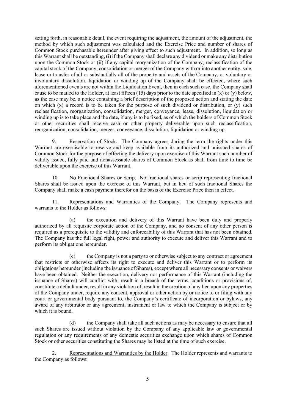 5 setting forth, in reasonable detail, the event requiring the adjustment, the amount of the adjustment, the method by which such adjustment was calculated and the Exercise Price and number of shares of Common Stock purchasable hereunder after giving effect to such adjustment. In addition, so long as this Warrant shall be outstanding, (i) if the Company shall declare any dividend or make any distribution upon the Common Stock or (ii) if any capital reorganization of the Company, reclassification of the capital stock of the Company, consolidation or merger of the Company with or into another entity, sale, lease or transfer of all or substantially all of the property and assets of the Company, or voluntary or involuntary dissolution, liquidation or winding up of the Company shall be effected, where such aforementioned events are not within the Liquidation Event, then in each such case, the Company shall cause to be mailed to the Holder, at least fifteen (15) days prior to the date specified in (x) or (y) below, as the case may be, a notice containing a brief description of the proposed action and stating the date on which (x) a record is to be taken for the purpose of such dividend or distribution, or (y) such reclassification, reorganization, consolidation, merger, conveyance, lease, dissolution, liquidation or winding up is to take place and the date, if any is to be fixed, as of which the holders of Common Stock or other securities shall receive cash or other property deliverable upon such reclassification, reorganization, consolidation, merger, conveyance, dissolution, liquidation or winding up. 9. Reservation of Stock. The Company agrees during the term the rights under this Warrant are exercisable to reserve and keep available from its authorized and unissued shares of Common Stock for the purpose of effecting the delivery upon exercise of this Warrant such number of validly issued, fully paid and nonassessable shares of Common Stock as shall from time to time be deliverable upon the exercise of this Warrant. 10. No Fractional Shares or Scrip. No fractional shares or scrip representing fractional Shares shall be issued upon the exercise of this Warrant, but in lieu of such fractional Shares the Company shall make a cash payment therefor on the basis of the Exercise Price then in effect. 11. Representations and Warranties of the Company. The Company represents and warrants to the Holder as follows: (a) the execution and delivery of this Warrant have been duly and properly authorized by all requisite corporate action of the Company, and no consent of any other person is required as a prerequisite to the validity and enforceability of this Warrant that has not been obtained. The Company has the full legal right, power and authority to execute and deliver this Warrant and to perform its obligations hereunder. (c) the Company is not a party to or otherwise subject to any contract or agreement that restricts or otherwise affects its right to execute and deliver this Warrant or to perform its obligations hereunder (including the issuance of Shares), except where all necessary consents or waivers have been obtained. Neither the execution, delivery nor performance of this Warrant (including the issuance of Shares) will conflict with, result in a breach of the terms, conditions or provisions of, constitute a default under, result in any violation of, result in the creation of any lien upon any properties of the Company under, require any consent, approval or other action by or notice to or filing with any court or governmental body pursuant to, the Company’s certificate of incorporation or bylaws, any award of any arbitrator or any agreement, instrument or law to which the Company is subject or by which it is bound. (d) the Company shall take all such actions as may be necessary to ensure that all such Shares are issued without violation by the Company of any applicable law or governmental regulation or any requirements of any domestic securities exchange upon which shares of Common Stock or other securities constituting the Shares may be listed at the time of such exercise. 2. Representations and Warranties by the Holder. The Holder represents and warrants to the Company as follows: