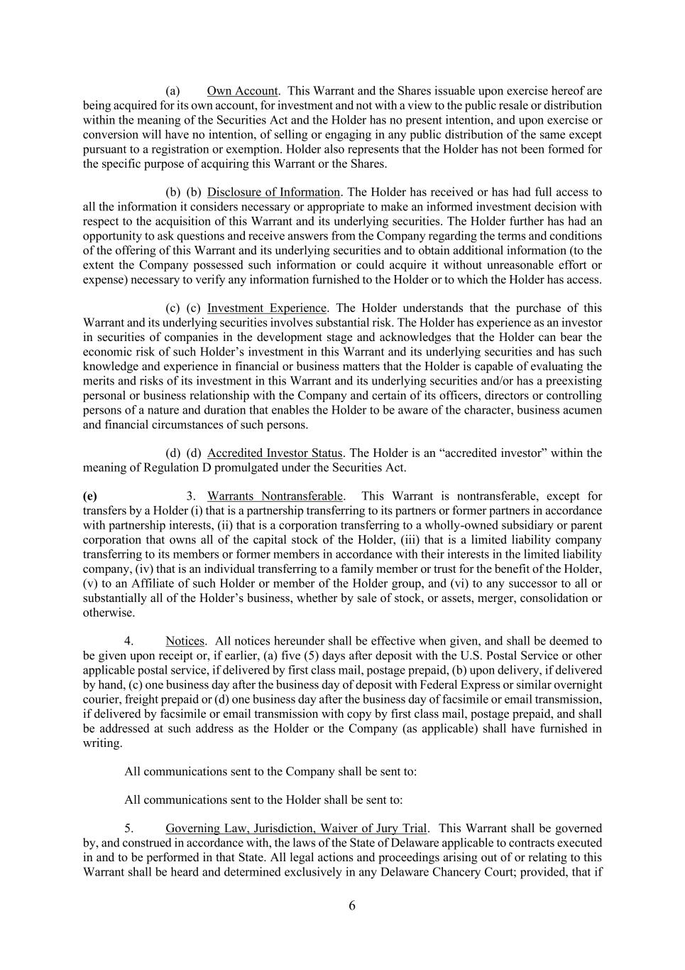 6 (a) Own Account. This Warrant and the Shares issuable upon exercise hereof are being acquired for its own account, for investment and not with a view to the public resale or distribution within the meaning of the Securities Act and the Holder has no present intention, and upon exercise or conversion will have no intention, of selling or engaging in any public distribution of the same except pursuant to a registration or exemption. Holder also represents that the Holder has not been formed for the specific purpose of acquiring this Warrant or the Shares. (b) (b) Disclosure of Information. The Holder has received or has had full access to all the information it considers necessary or appropriate to make an informed investment decision with respect to the acquisition of this Warrant and its underlying securities. The Holder further has had an opportunity to ask questions and receive answers from the Company regarding the terms and conditions of the offering of this Warrant and its underlying securities and to obtain additional information (to the extent the Company possessed such information or could acquire it without unreasonable effort or expense) necessary to verify any information furnished to the Holder or to which the Holder has access. (c) (c) Investment Experience. The Holder understands that the purchase of this Warrant and its underlying securities involves substantial risk. The Holder has experience as an investor in securities of companies in the development stage and acknowledges that the Holder can bear the economic risk of such Holder’s investment in this Warrant and its underlying securities and has such knowledge and experience in financial or business matters that the Holder is capable of evaluating the merits and risks of its investment in this Warrant and its underlying securities and/or has a preexisting personal or business relationship with the Company and certain of its officers, directors or controlling persons of a nature and duration that enables the Holder to be aware of the character, business acumen and financial circumstances of such persons. (d) (d) Accredited Investor Status. The Holder is an “accredited investor” within the meaning of Regulation D promulgated under the Securities Act. (e) 3. Warrants Nontransferable. This Warrant is nontransferable, except for transfers by a Holder (i) that is a partnership transferring to its partners or former partners in accordance with partnership interests, (ii) that is a corporation transferring to a wholly-owned subsidiary or parent corporation that owns all of the capital stock of the Holder, (iii) that is a limited liability company transferring to its members or former members in accordance with their interests in the limited liability company, (iv) that is an individual transferring to a family member or trust for the benefit of the Holder, (v) to an Affiliate of such Holder or member of the Holder group, and (vi) to any successor to all or substantially all of the Holder’s business, whether by sale of stock, or assets, merger, consolidation or otherwise. 4. Notices. All notices hereunder shall be effective when given, and shall be deemed to be given upon receipt or, if earlier, (a) five (5) days after deposit with the U.S. Postal Service or other applicable postal service, if delivered by first class mail, postage prepaid, (b) upon delivery, if delivered by hand, (c) one business day after the business day of deposit with Federal Express or similar overnight courier, freight prepaid or (d) one business day after the business day of facsimile or email transmission, if delivered by facsimile or email transmission with copy by first class mail, postage prepaid, and shall be addressed at such address as the Holder or the Company (as applicable) shall have furnished in writing. All communications sent to the Company shall be sent to: All communications sent to the Holder shall be sent to: 5. Governing Law, Jurisdiction, Waiver of Jury Trial. This Warrant shall be governed by, and construed in accordance with, the laws of the State of Delaware applicable to contracts executed in and to be performed in that State. All legal actions and proceedings arising out of or relating to this Warrant shall be heard and determined exclusively in any Delaware Chancery Court; provided, that if