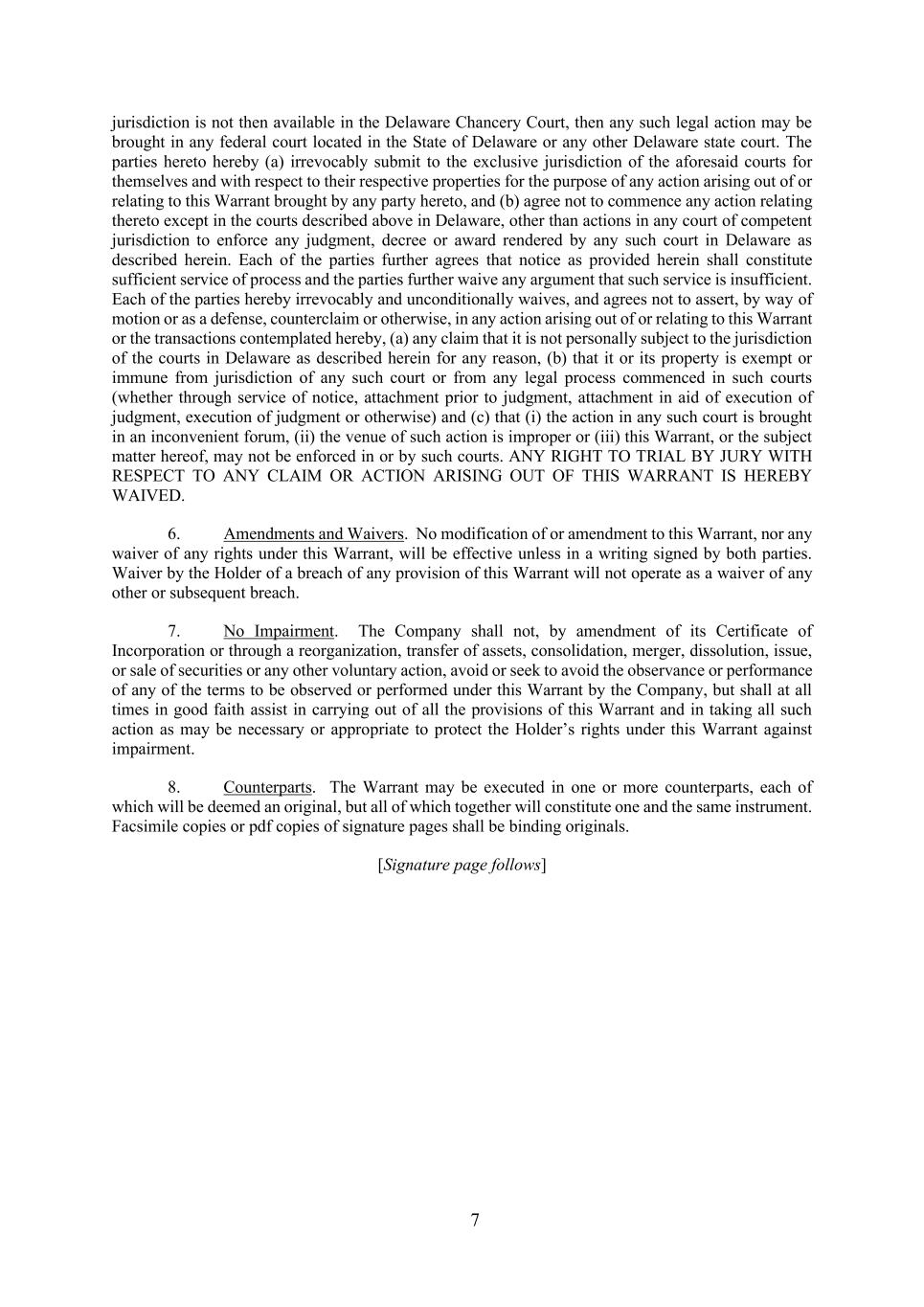 7 jurisdiction is not then available in the Delaware Chancery Court, then any such legal action may be brought in any federal court located in the State of Delaware or any other Delaware state court. The parties hereto hereby (a) irrevocably submit to the exclusive jurisdiction of the aforesaid courts for themselves and with respect to their respective properties for the purpose of any action arising out of or relating to this Warrant brought by any party hereto, and (b) agree not to commence any action relating thereto except in the courts described above in Delaware, other than actions in any court of competent jurisdiction to enforce any judgment, decree or award rendered by any such court in Delaware as described herein. Each of the parties further agrees that notice as provided herein shall constitute sufficient service of process and the parties further waive any argument that such service is insufficient. Each of the parties hereby irrevocably and unconditionally waives, and agrees not to assert, by way of motion or as a defense, counterclaim or otherwise, in any action arising out of or relating to this Warrant or the transactions contemplated hereby, (a) any claim that it is not personally subject to the jurisdiction of the courts in Delaware as described herein for any reason, (b) that it or its property is exempt or immune from jurisdiction of any such court or from any legal process commenced in such courts (whether through service of notice, attachment prior to judgment, attachment in aid of execution of judgment, execution of judgment or otherwise) and (c) that (i) the action in any such court is brought in an inconvenient forum, (ii) the venue of such action is improper or (iii) this Warrant, or the subject matter hereof, may not be enforced in or by such courts. ANY RIGHT TO TRIAL BY JURY WITH RESPECT TO ANY CLAIM OR ACTION ARISING OUT OF THIS WARRANT IS HEREBY WAIVED. 6. Amendments and Waivers. No modification of or amendment to this Warrant, nor any waiver of any rights under this Warrant, will be effective unless in a writing signed by both parties. Waiver by the Holder of a breach of any provision of this Warrant will not operate as a waiver of any other or subsequent breach. 7. No Impairment. The Company shall not, by amendment of its Certificate of Incorporation or through a reorganization, transfer of assets, consolidation, merger, dissolution, issue, or sale of securities or any other voluntary action, avoid or seek to avoid the observance or performance of any of the terms to be observed or performed under this Warrant by the Company, but shall at all times in good faith assist in carrying out of all the provisions of this Warrant and in taking all such action as may be necessary or appropriate to protect the Holder’s rights under this Warrant against impairment. 8. Counterparts. The Warrant may be executed in one or more counterparts, each of which will be deemed an original, but all of which together will constitute one and the same instrument. Facsimile copies or pdf copies of signature pages shall be binding originals. [Signature page follows]