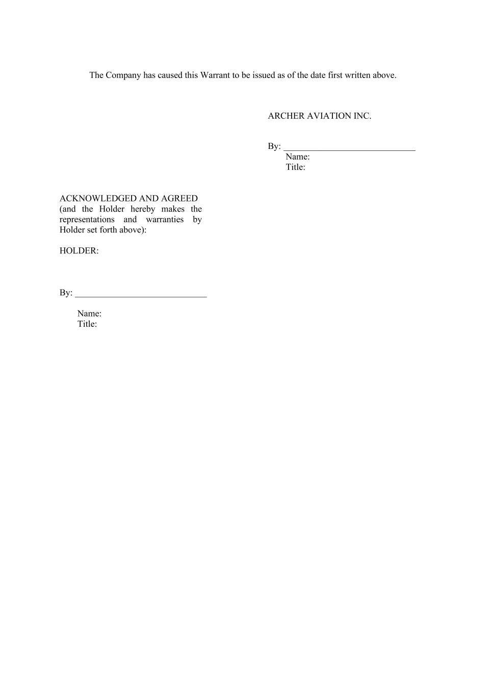 The Company has caused this Warrant to be issued as of the date first written above. ARCHER AVIATION INC. By: _____________________________ Name: Title: ACKNOWLEDGED AND AGREED (and the Holder hereby makes the representations and warranties by Holder set forth above): HOLDER: By: _____________________________ Name: Title: