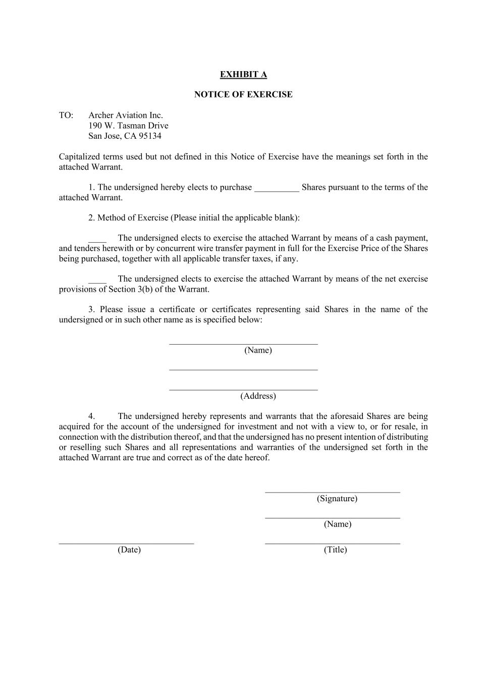 EXHIBIT A NOTICE OF EXERCISE TO: Archer Aviation Inc. 190 W. Tasman Drive San Jose, CA 95134 Capitalized terms used but not defined in this Notice of Exercise have the meanings set forth in the attached Warrant. 1. The undersigned hereby elects to purchase __________ Shares pursuant to the terms of the attached Warrant. 2. Method of Exercise (Please initial the applicable blank): ____ The undersigned elects to exercise the attached Warrant by means of a cash payment, and tenders herewith or by concurrent wire transfer payment in full for the Exercise Price of the Shares being purchased, together with all applicable transfer taxes, if any. ____ The undersigned elects to exercise the attached Warrant by means of the net exercise provisions of Section 3(b) of the Warrant. 3. Please issue a certificate or certificates representing said Shares in the name of the undersigned or in such other name as is specified below: _________________________________ (Name) _________________________________ _________________________________ (Address) 4. The undersigned hereby represents and warrants that the aforesaid Shares are being acquired for the account of the undersigned for investment and not with a view to, or for resale, in connection with the distribution thereof, and that the undersigned has no present intention of distributing or reselling such Shares and all representations and warranties of the undersigned set forth in the attached Warrant are true and correct as of the date hereof. ______________________________ (Signature) ______________________________ (Name) ______________________________ ______________________________ (Date) (Title)
