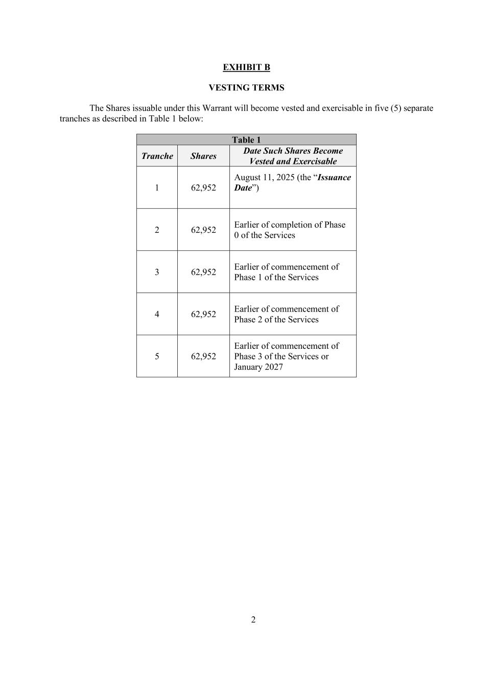 2 EXHIBIT B VESTING TERMS The Shares issuable under this Warrant will become vested and exercisable in five (5) separate tranches as described in Table 1 below: Table 1 Tranche Shares Date Such Shares Become Vested and Exercisable 1 62,952 August 11, 2025 (the “Issuance Date”) 2 62,952 Earlier of completion of Phase 0 of the Services 3 62,952 Earlier of commencement of Phase 1 of the Services 4 62,952 Earlier of commencement of Phase 2 of the Services 5 62,952 Earlier of commencement of Phase 3 of the Services or January 2027